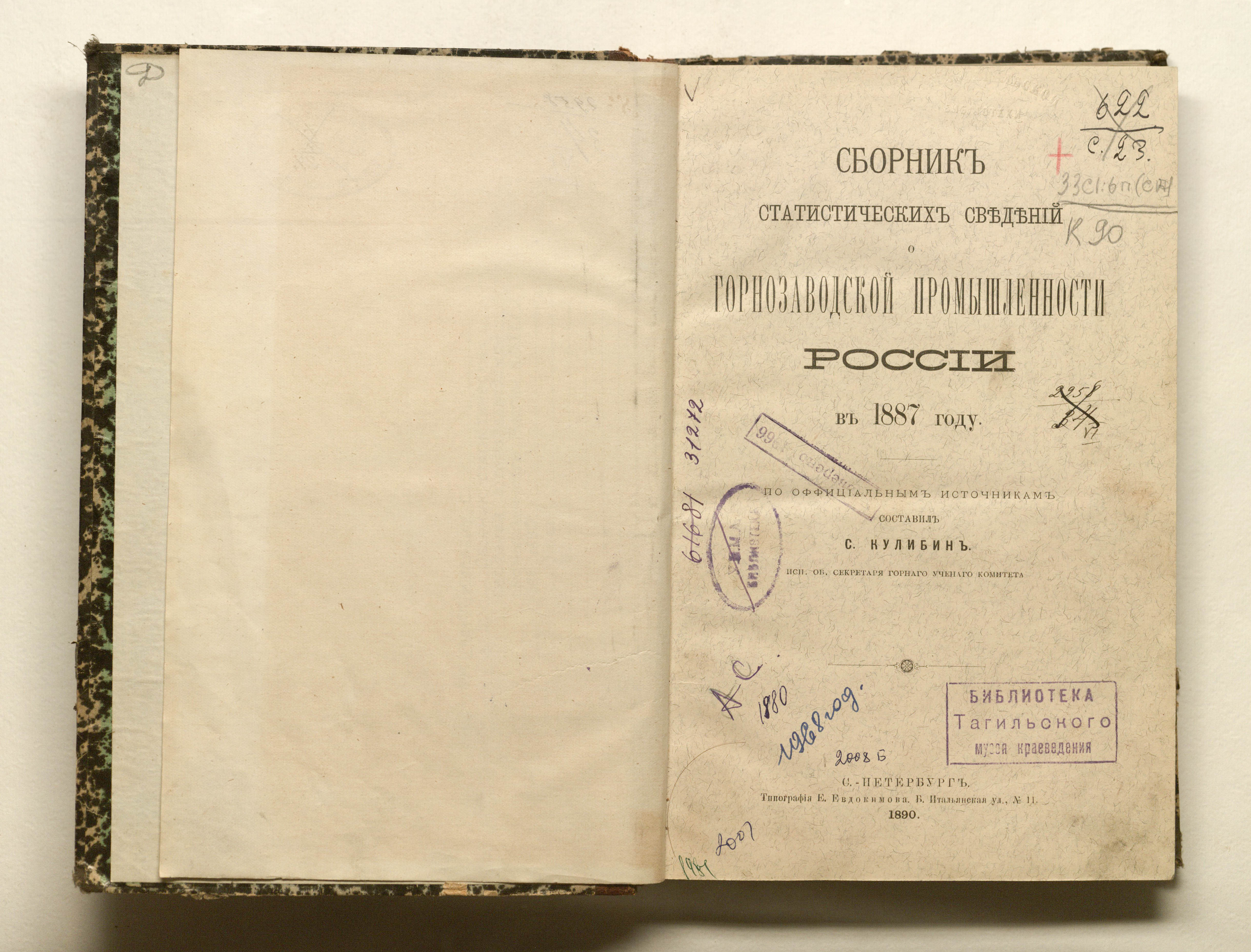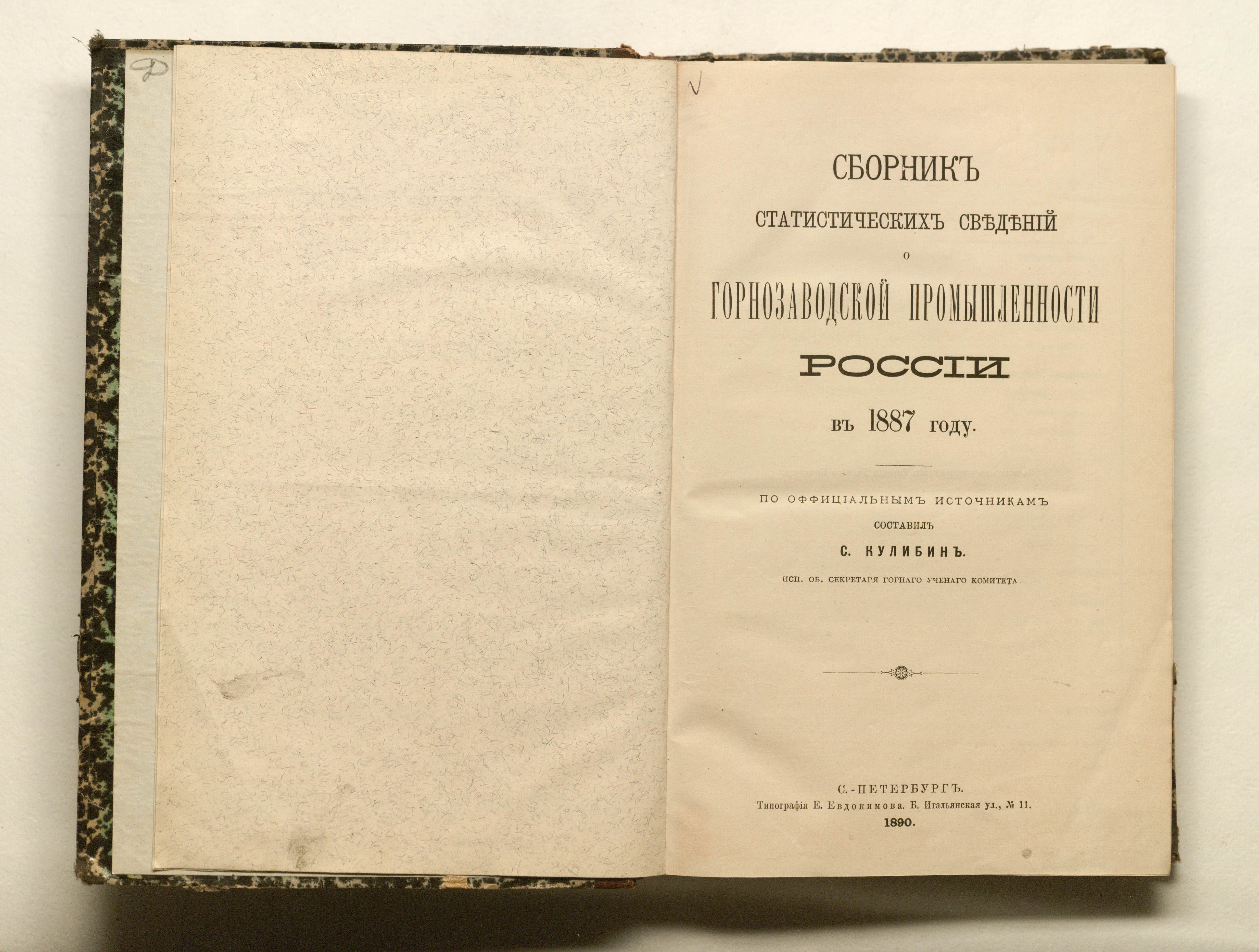 Сборник статистических сведений о горнозаводской промышленности России в 1887 году / сост. С. Кулибин, исп. об. секретаря горного ученого комитета. — Санкт-Петербург : тип. Е. Евдокимова, 1890. — XCVII, 310 с. ; 26х18 см.