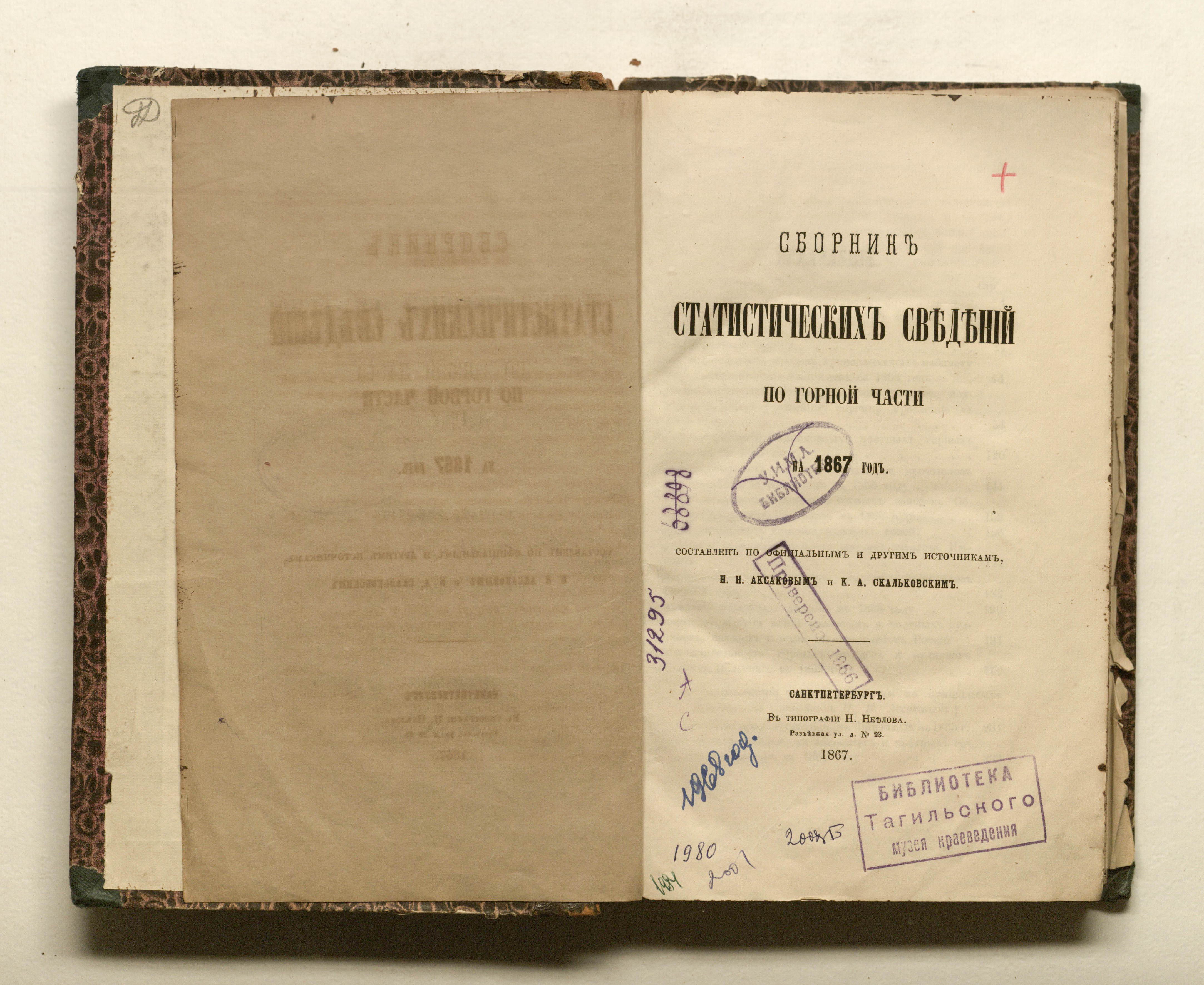 Сборник статистических сведений по горной части на 1867 год / сост.: Н. Н. Аксаков, К. А. Скальковский. — Санкт-Петербург : Учен. ком. Корп. горн. инженеров, 1867. — [1], II, 363 с. : 6 л. табл. ; 24,5х15,5 см.