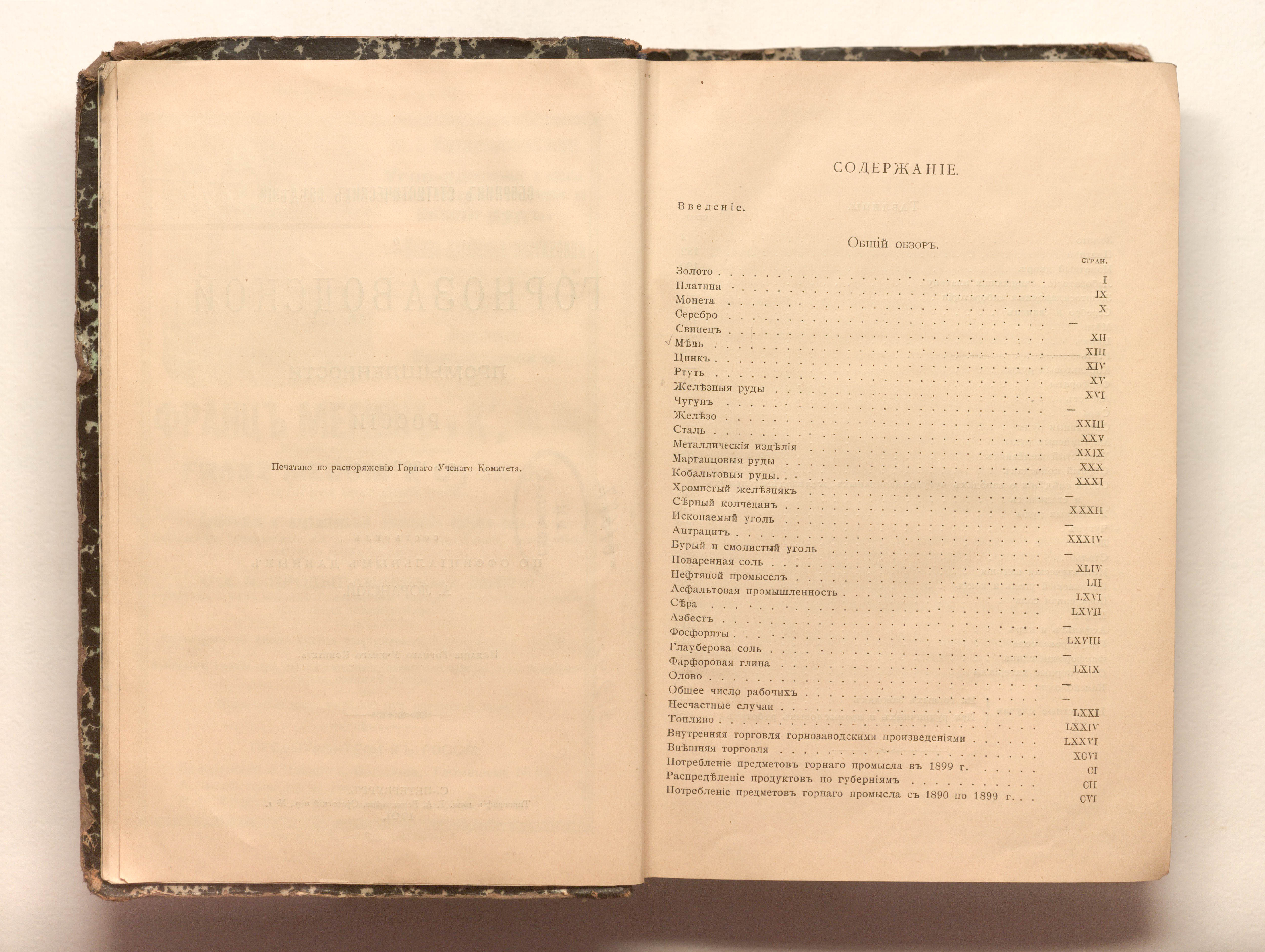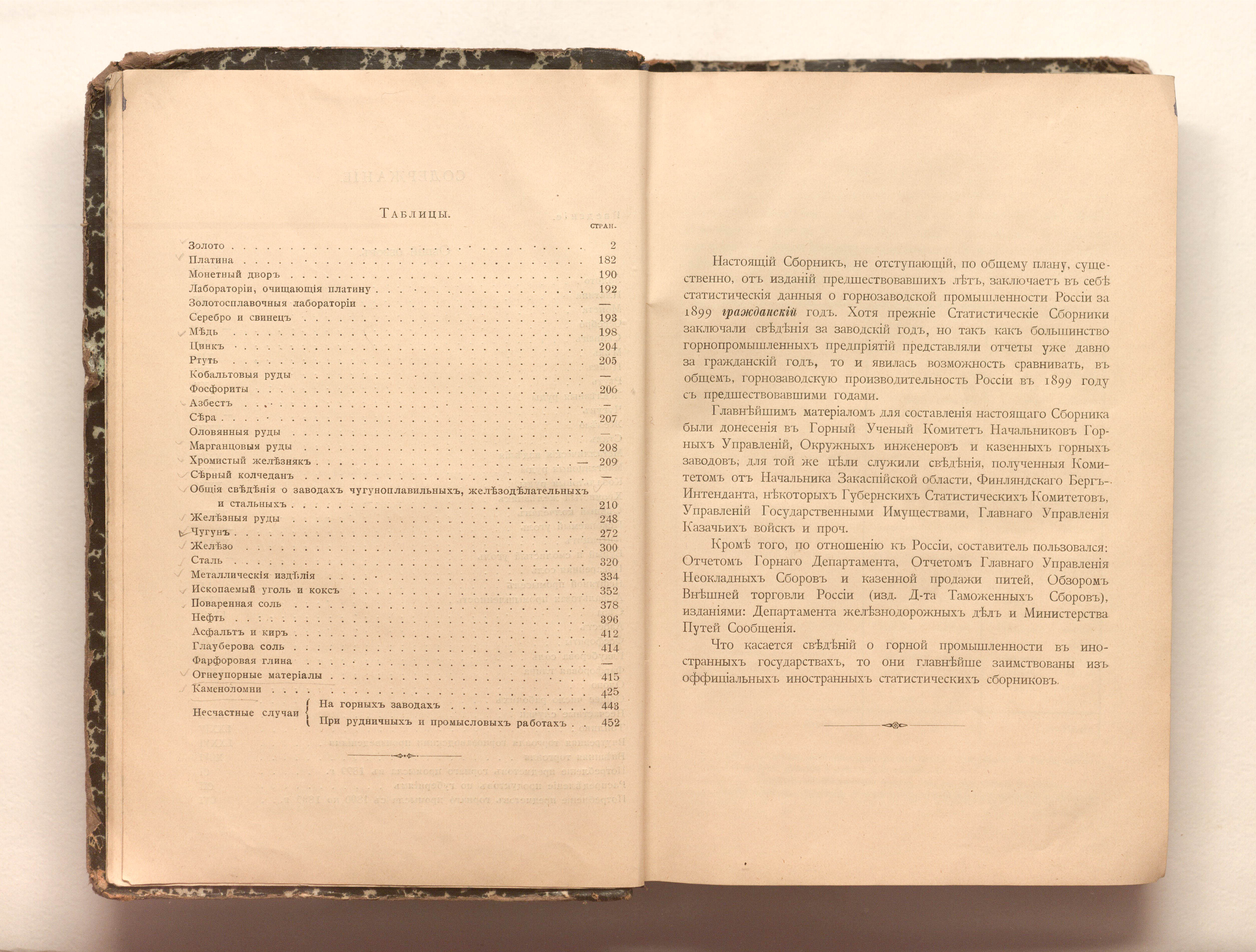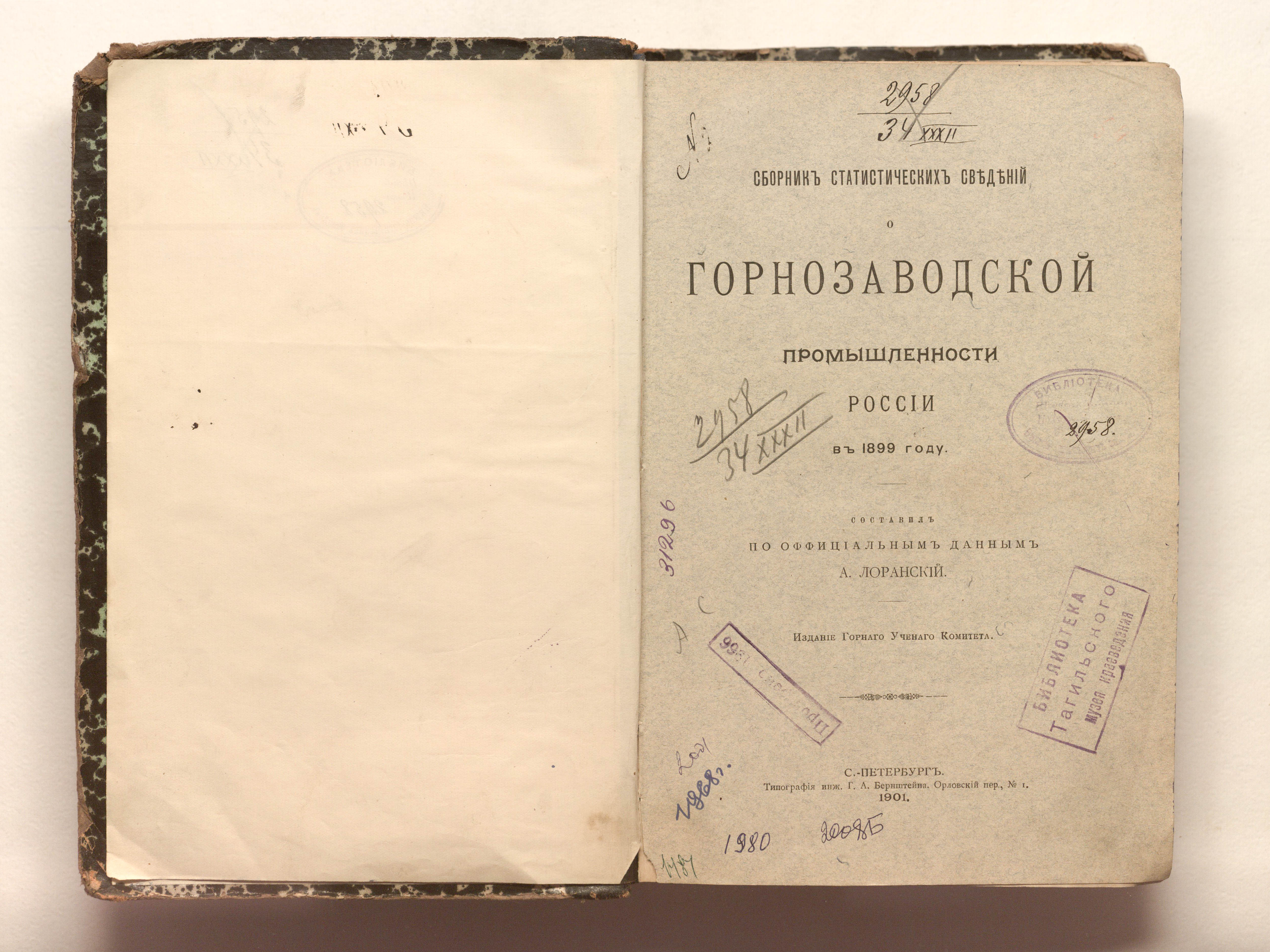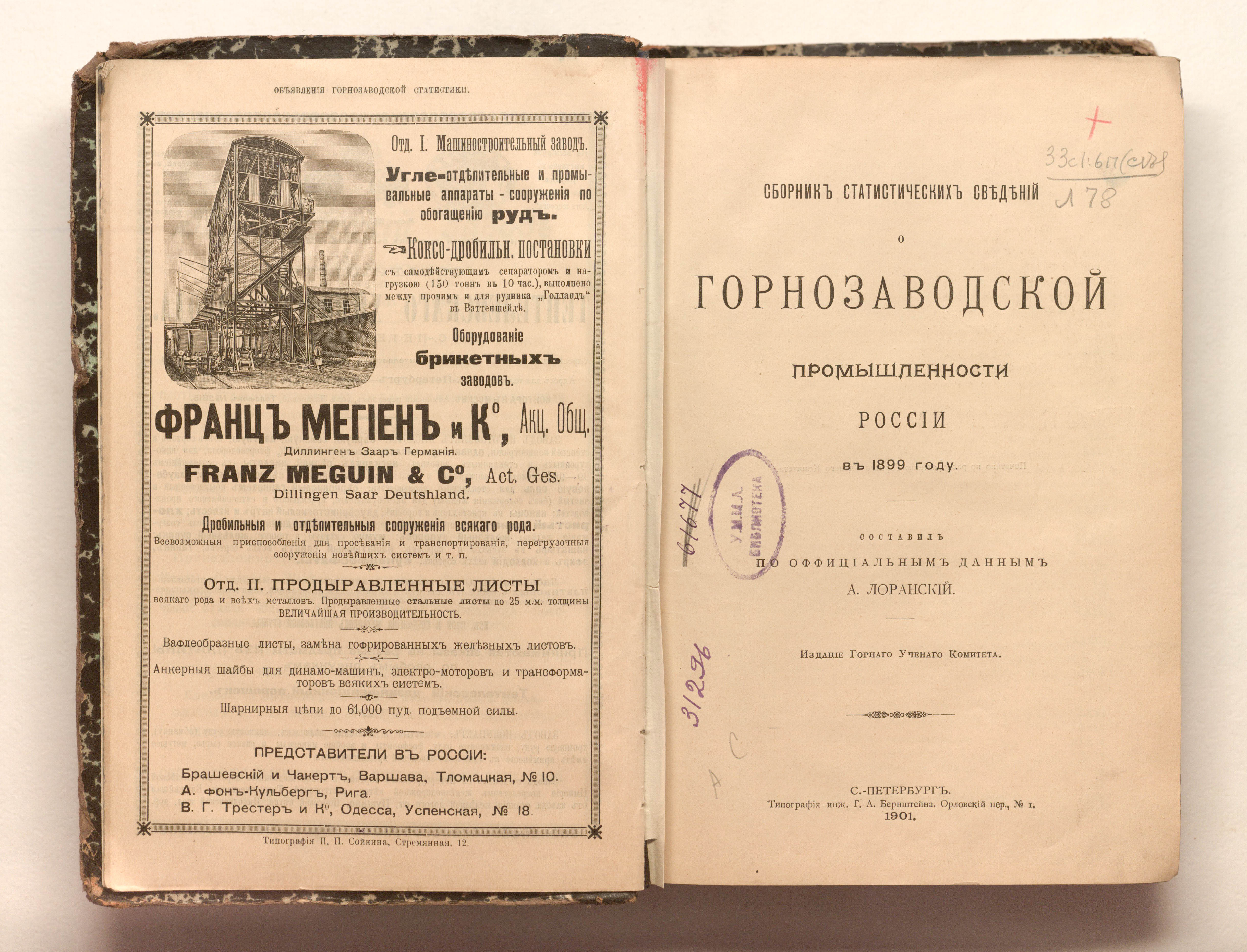 Сборник статистических сведений о горнозаводской промышленности России в 1899 году / сост. А. Лоранский. — Санкт-Петербург : тип. инж. Г.А. Бернштейна, 1901. — CVI, 476 с. ; 27х19 см.