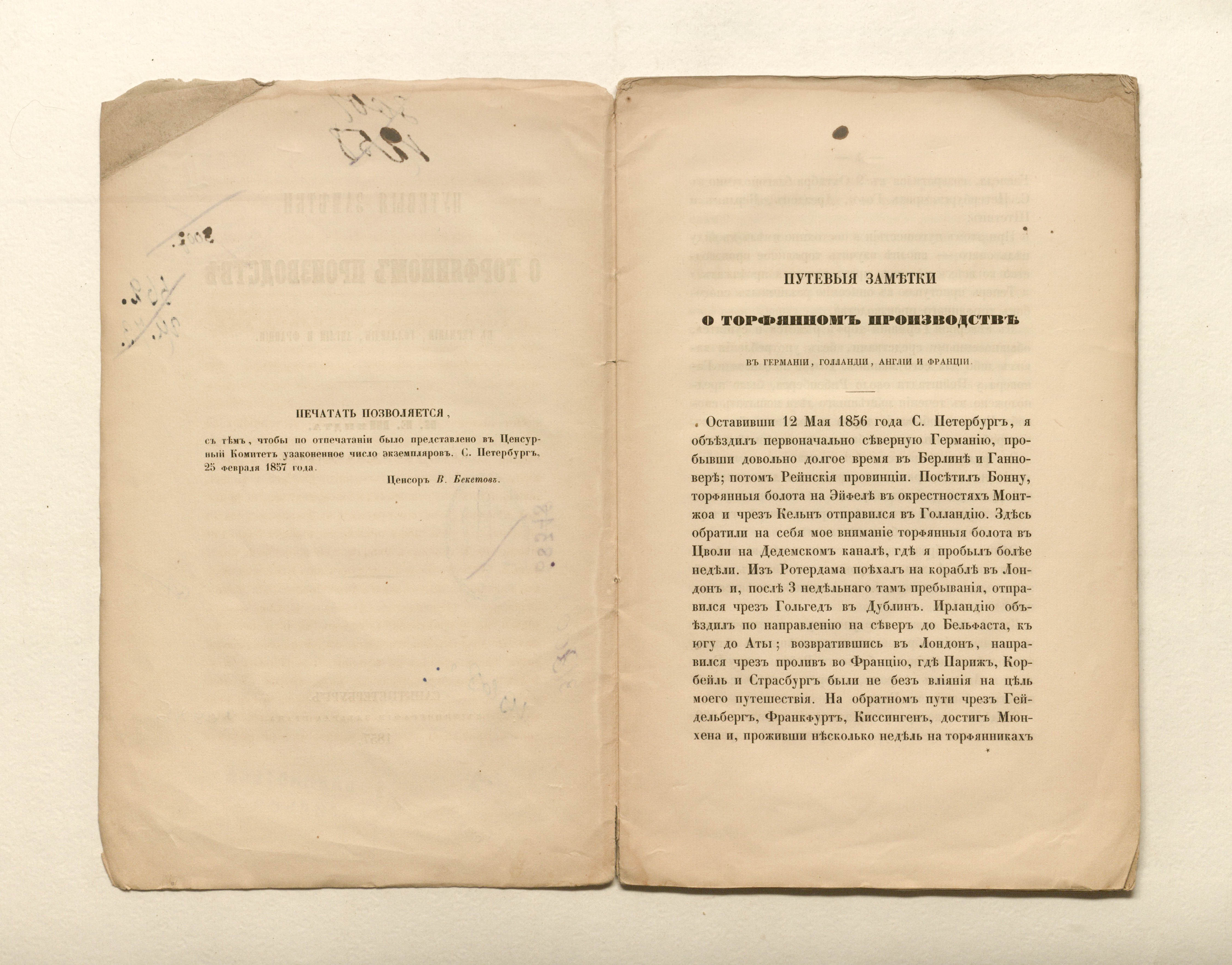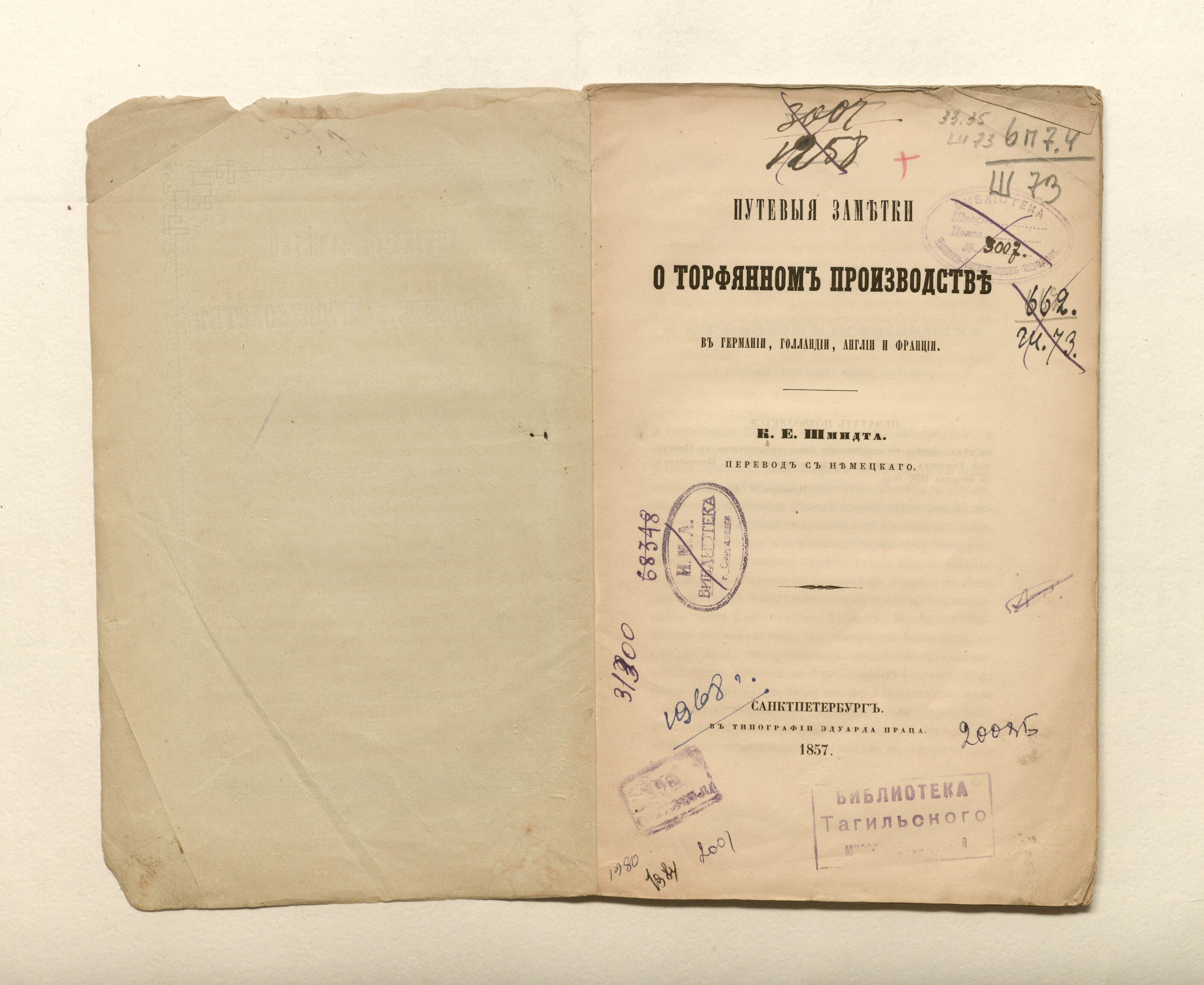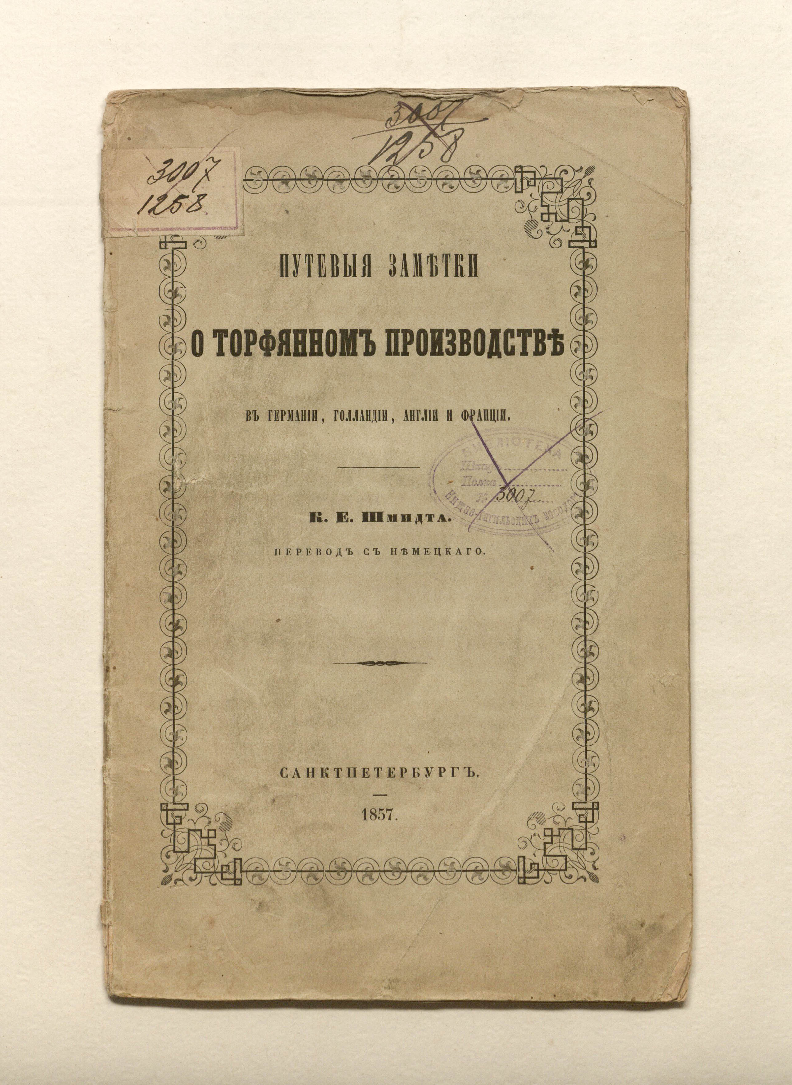 Путевые заметки о торфяном производстве в Германии, Голландии, Англии и Франции / Пер. с нем. / [Соч.] К. Е. Шмидта. — Санкт-Петербург : тип. Эдуарда Праца, 1857. — 31 с. : 1 л. черт. ; 24,5х16 см.