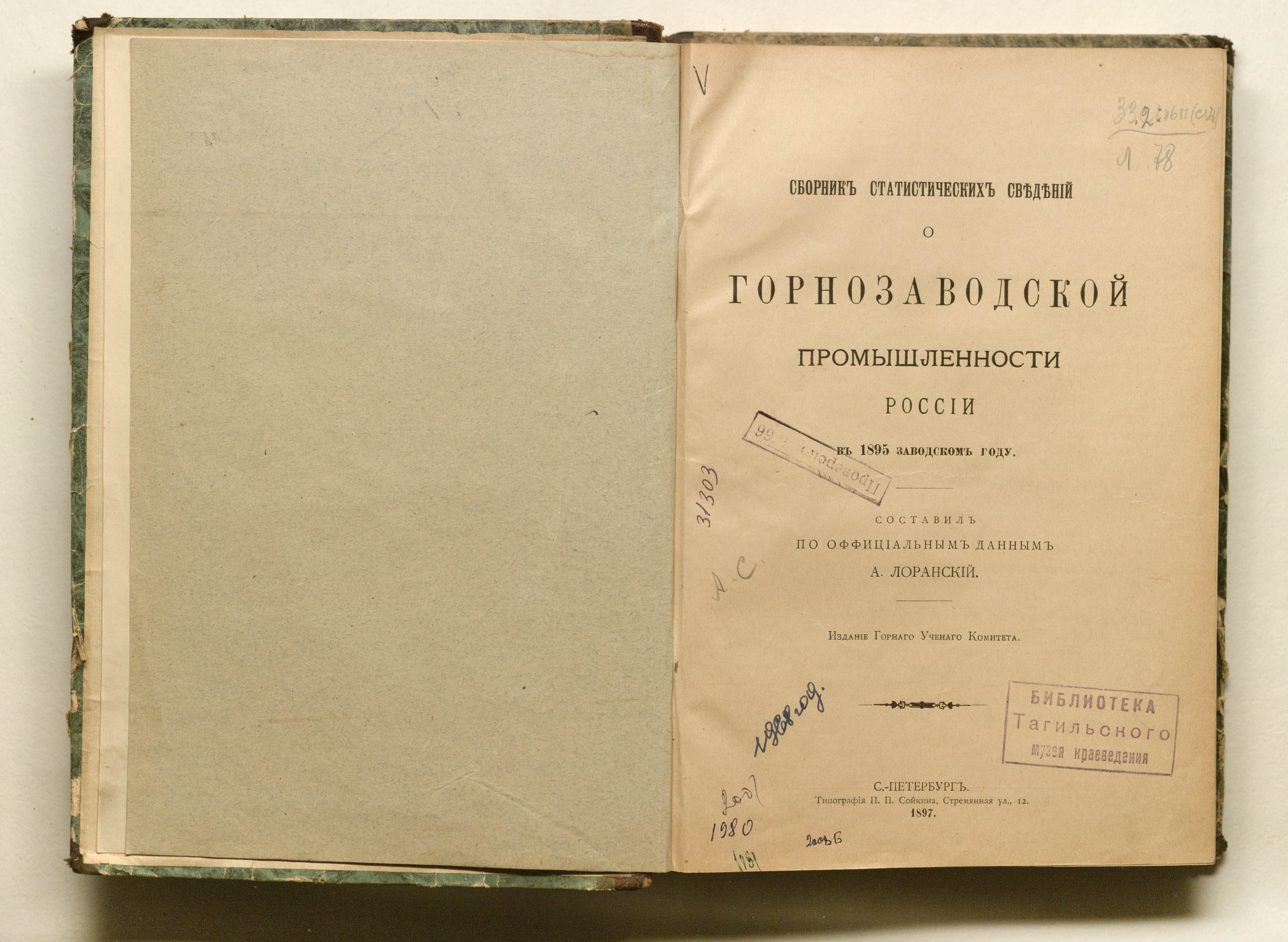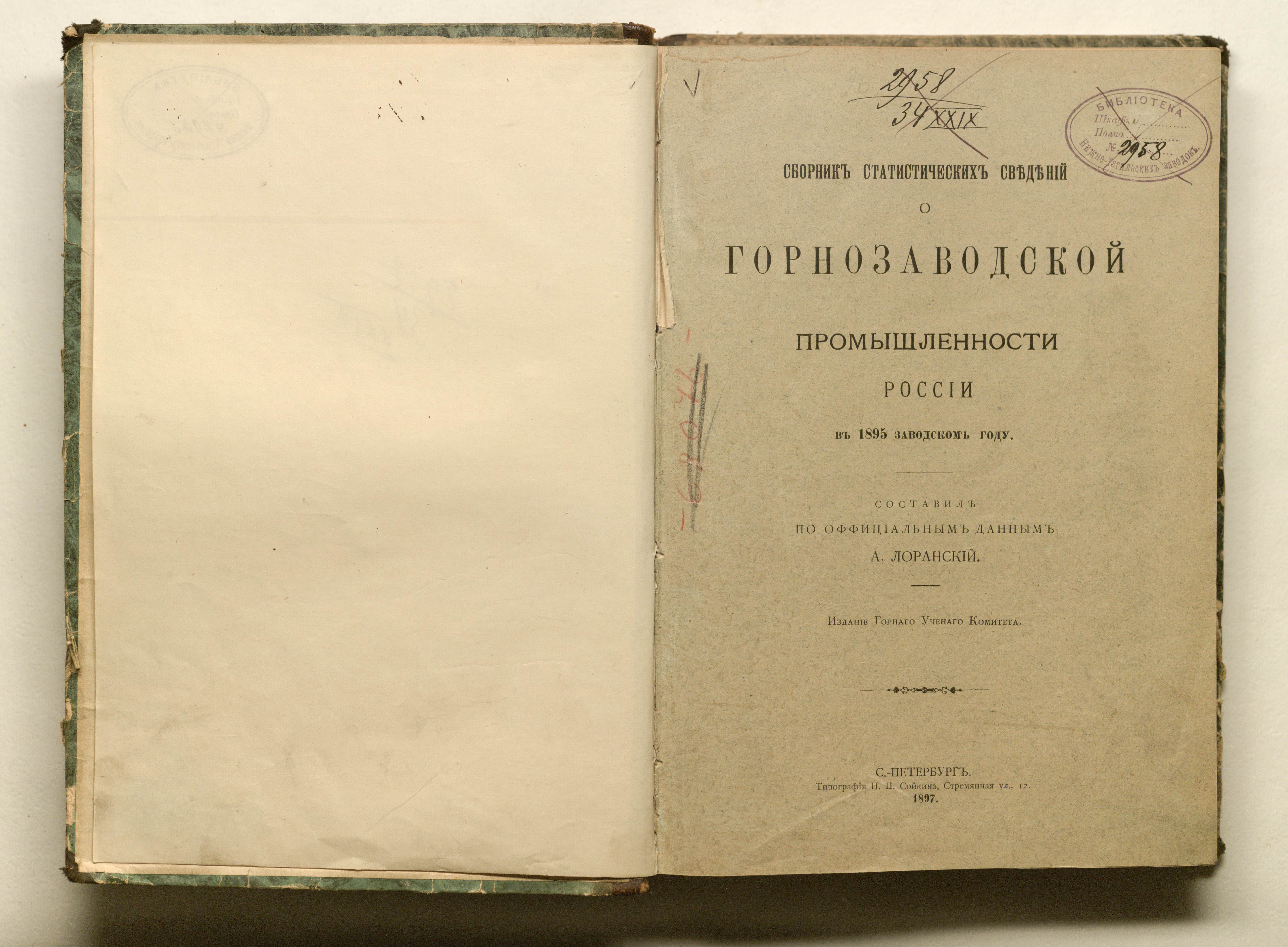 Сборник статистических сведений о горнозаводской промышленности России в 1895 заводском году / сост. А. Лоранский. — Санкт-Петербург : тип. П. П. Сойкина, 1897. — CVI, 418 с. ; 27х19 см.