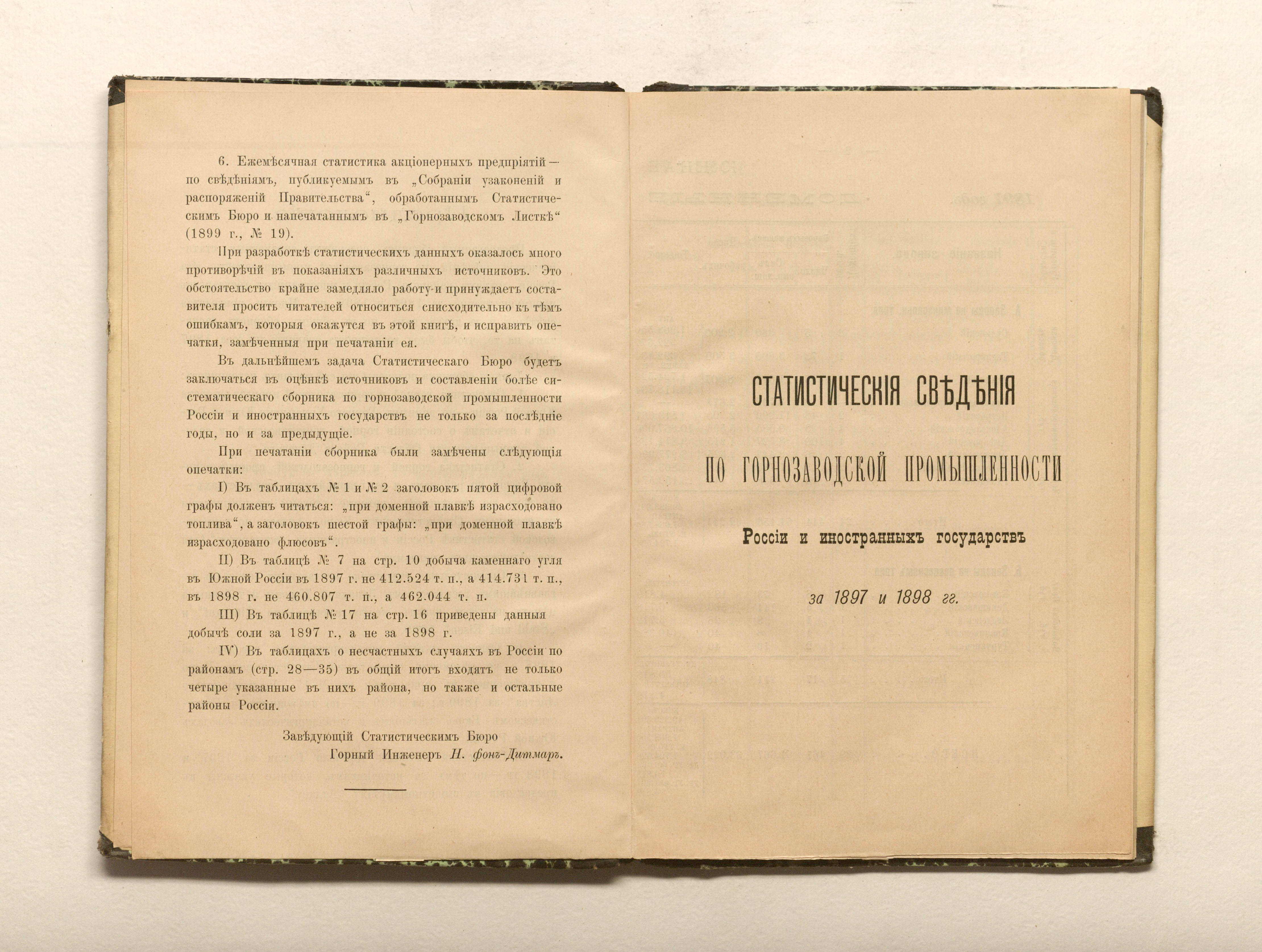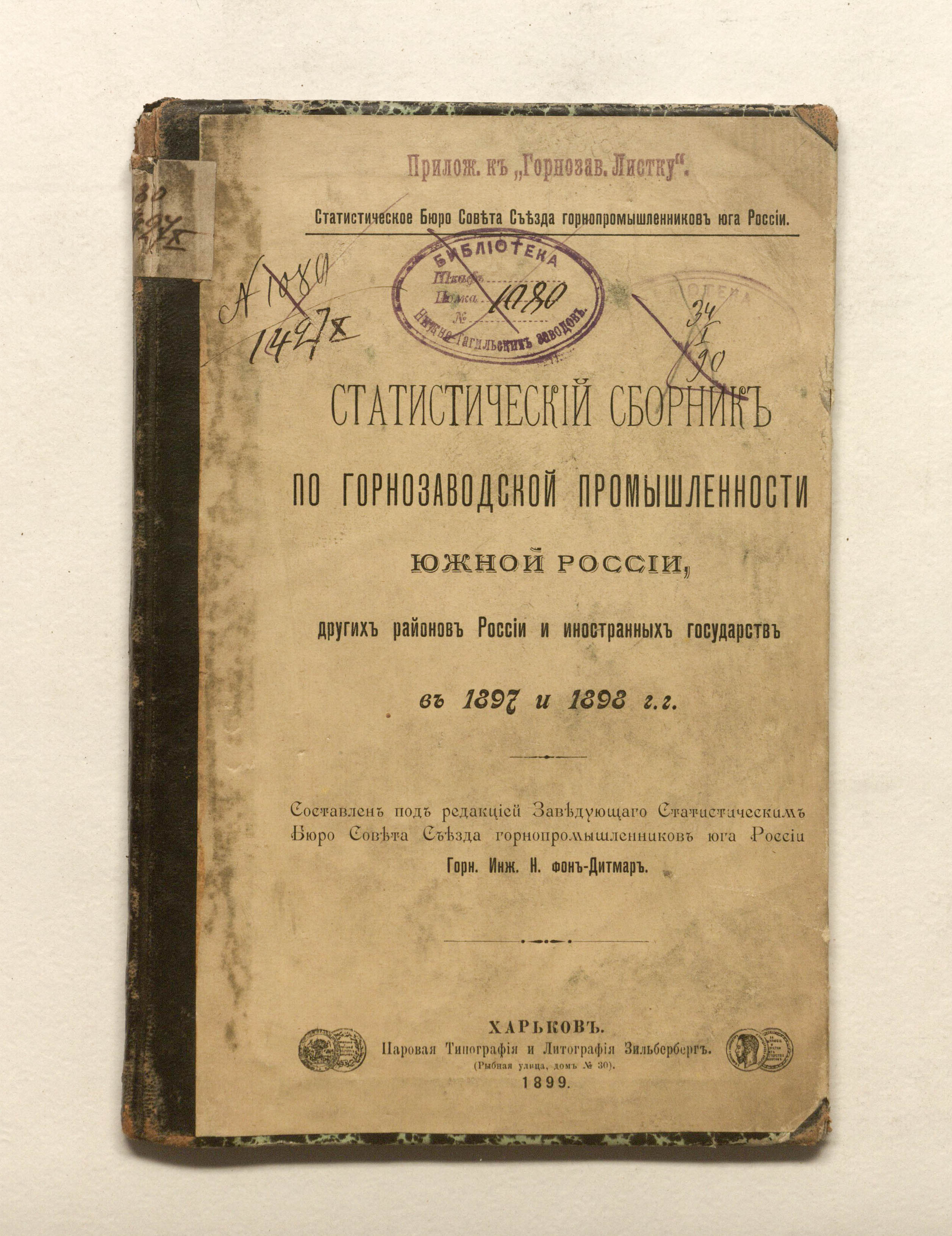 Статистический сборник по горнозаводской промышленности Южной России, других районов России и иностранных государств в 1897 и 1898 гг. / Сост. под ред. зав. Стат. бюро Совета съезда горнопромышленников Юга России горн. инж. Н. фон Дитмар; Стат. бюро Совета съезда горнопромышленников Юга России. — Харьков : тип. и лит. Зильберг, 1899. — [4], 42 с. ; 22,5х15,3 см.