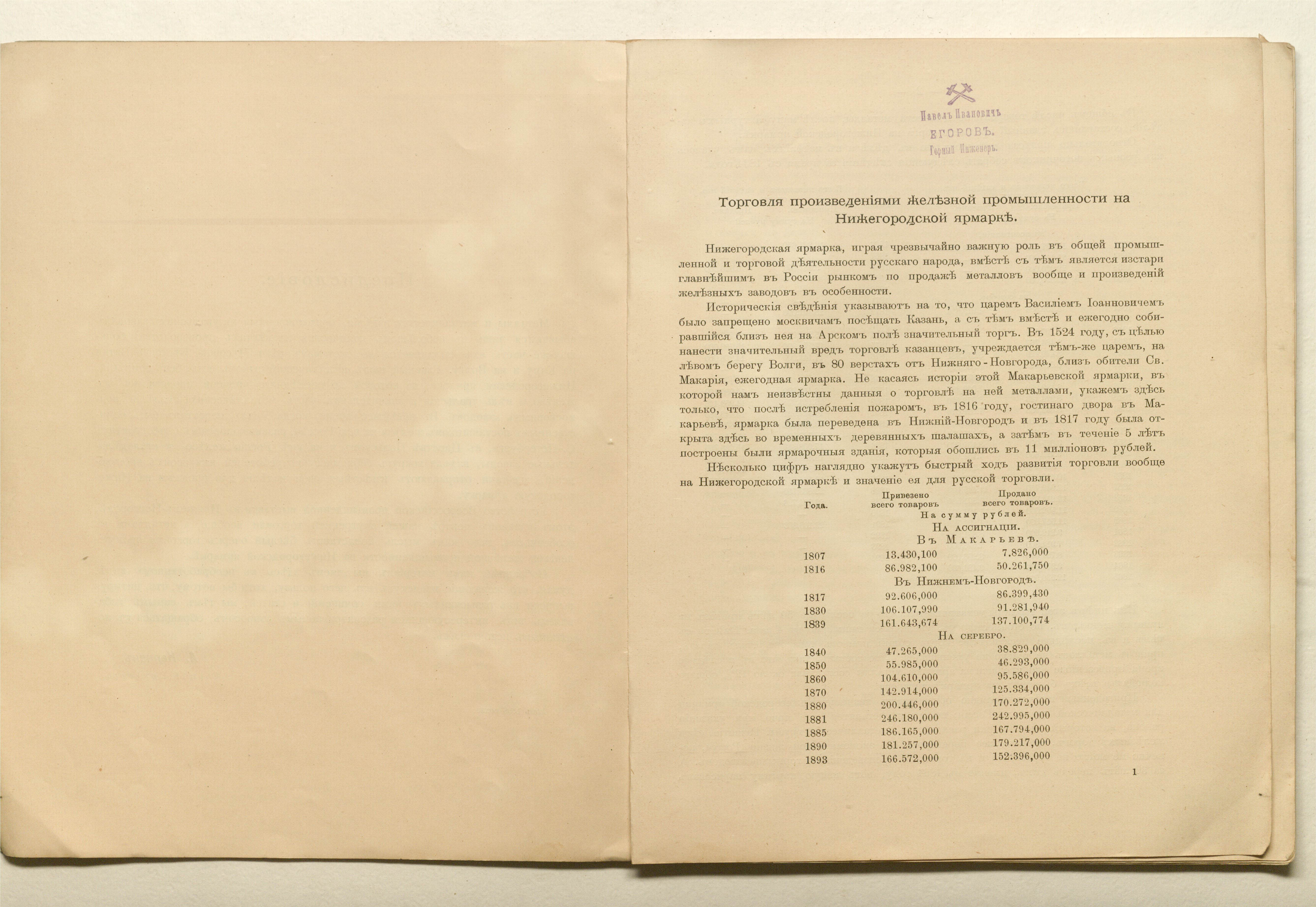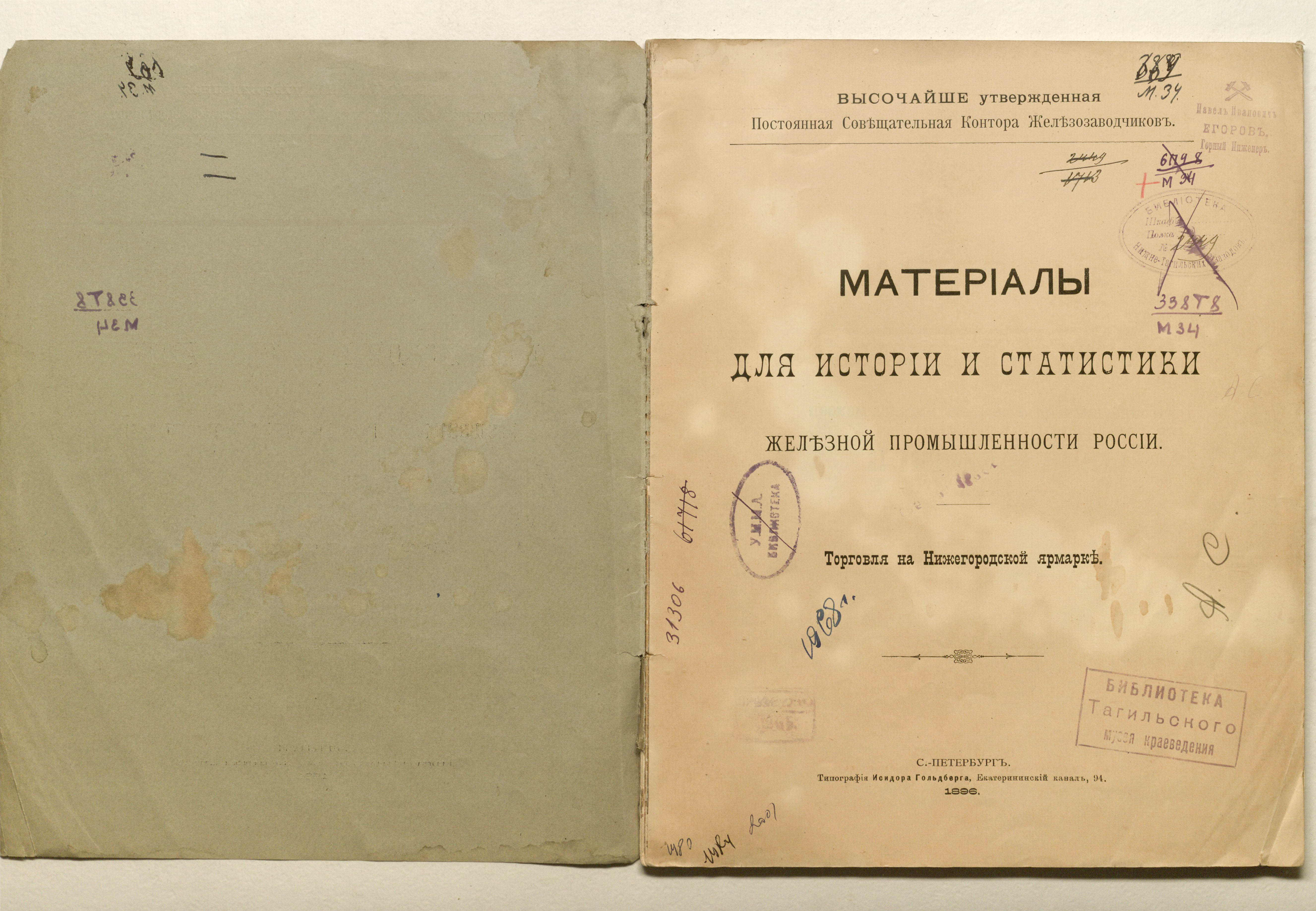 Кеппен, Алексей Петрович (горный инженер ; 1841–?). Материалы для истории и статистики железной промышленности России : торговля на Нижегородской ярмарке / [предисл. авт.] ; постоян. совещат. контора железозаводчиков. — Санкт-Петербург : тип. Исидора Гольдберга, 1896. — [2], 71 с. ; 28х22 см.