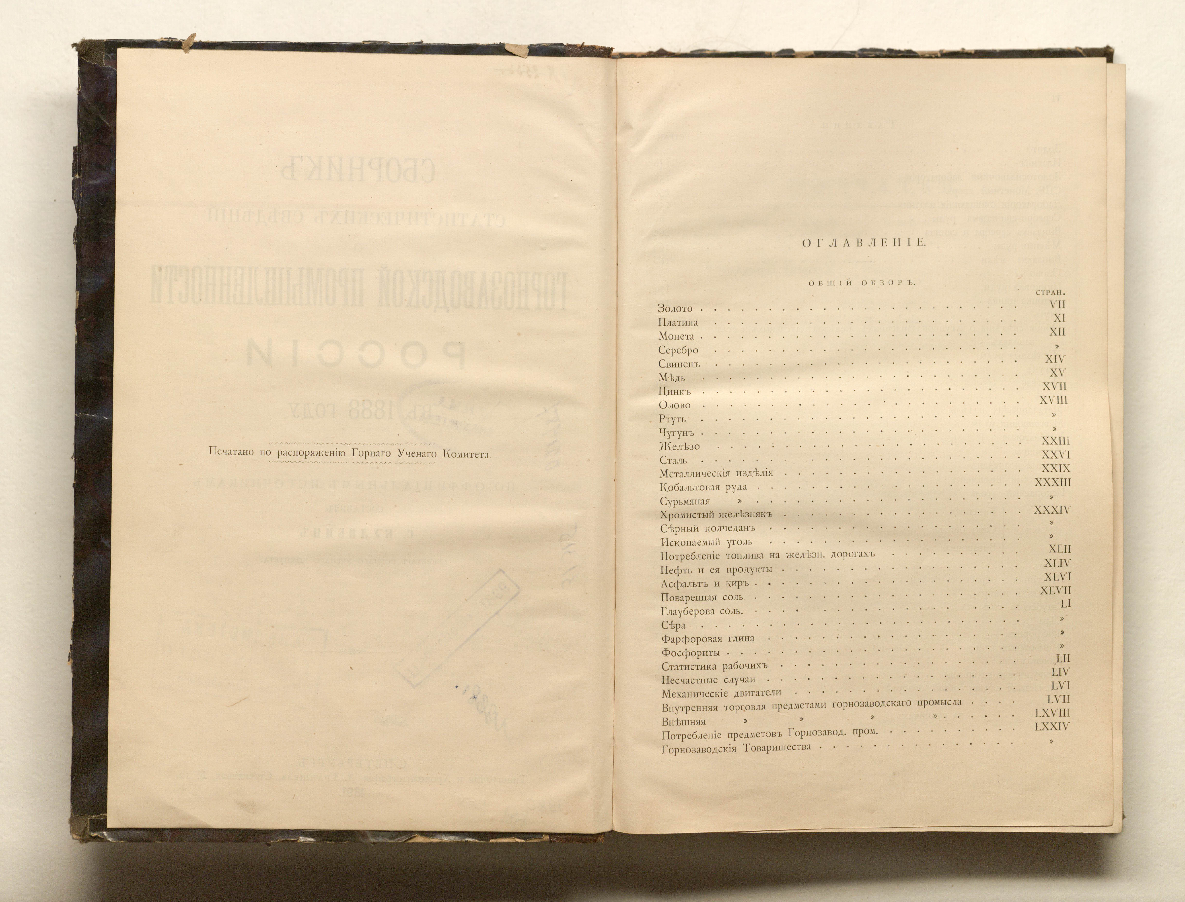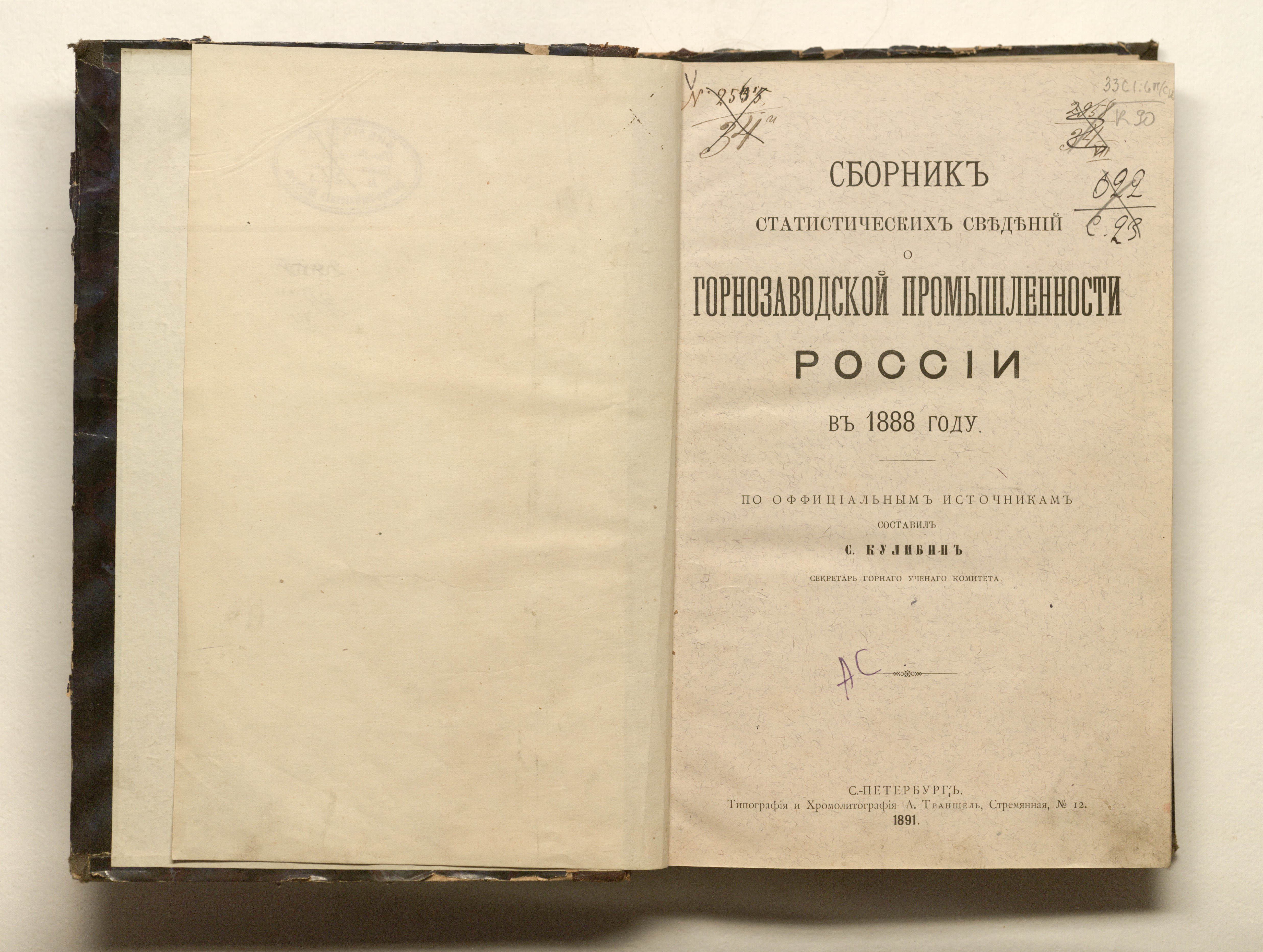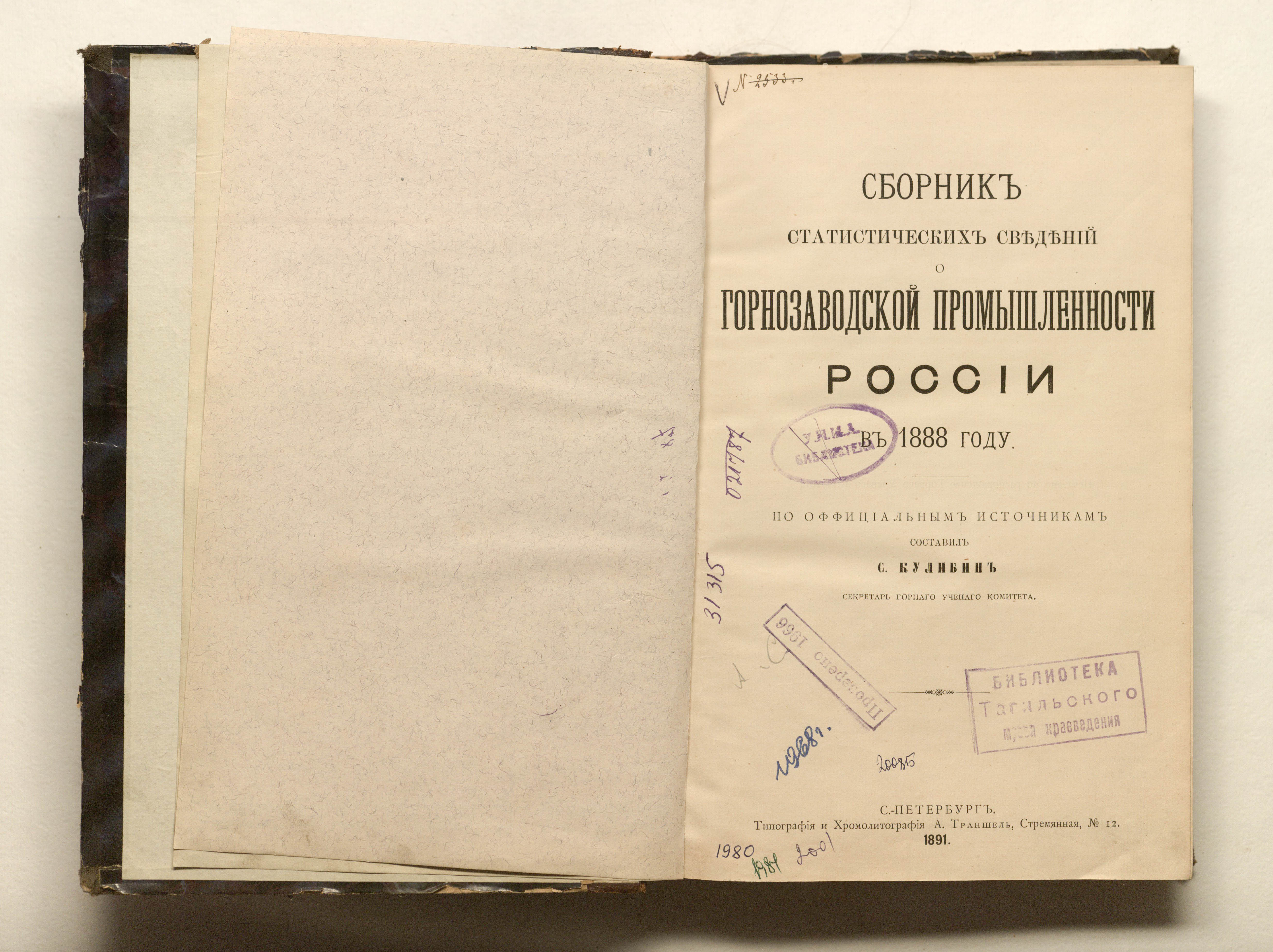 Сборник статистических сведений о горнозаводской промышленности России в 1888 году / сост. С. Кулибин, исп. об. секретаря горного ученого комитета. — Санкт-Петербург : тип. и хромолит. А. Траншель, 1891. — LXXVI, 354 с. ; 26х18 см.