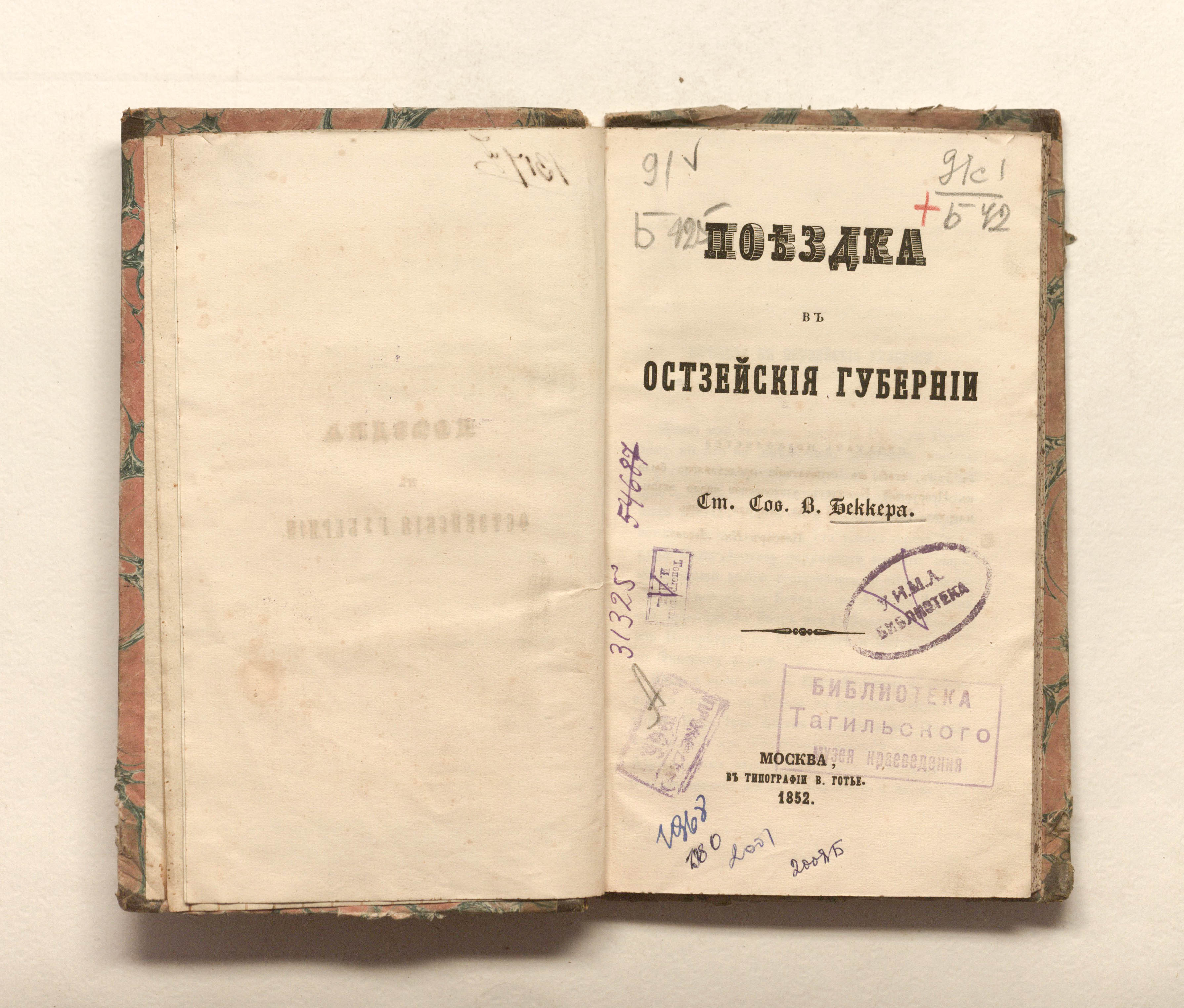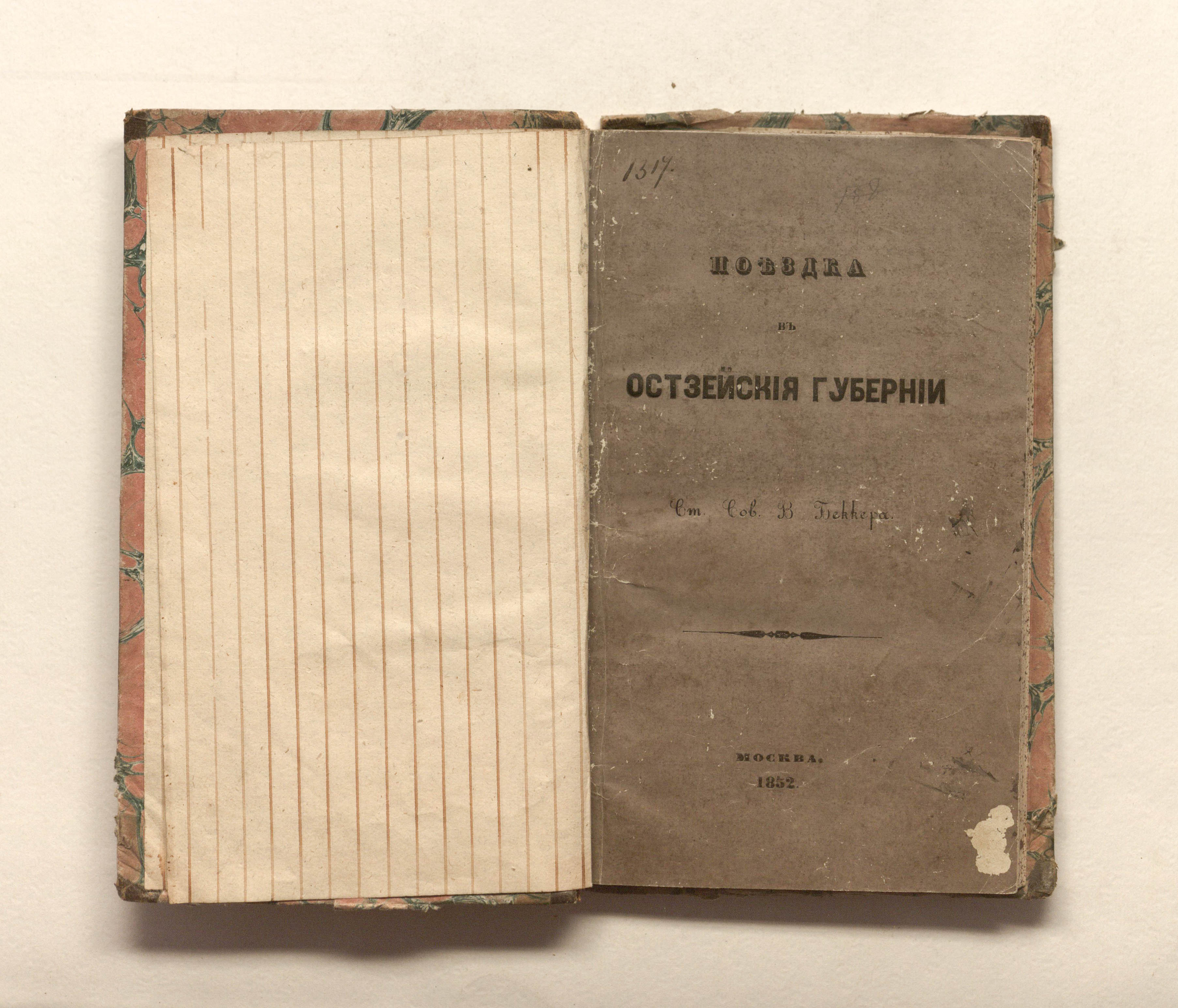 Беккер, Вильгельм Иванович. Поездка в остзейские губернии / В. И. Беккер. — Москва : тип. В. Готье, 1852. — 133 с. ; 19,7х12 см.