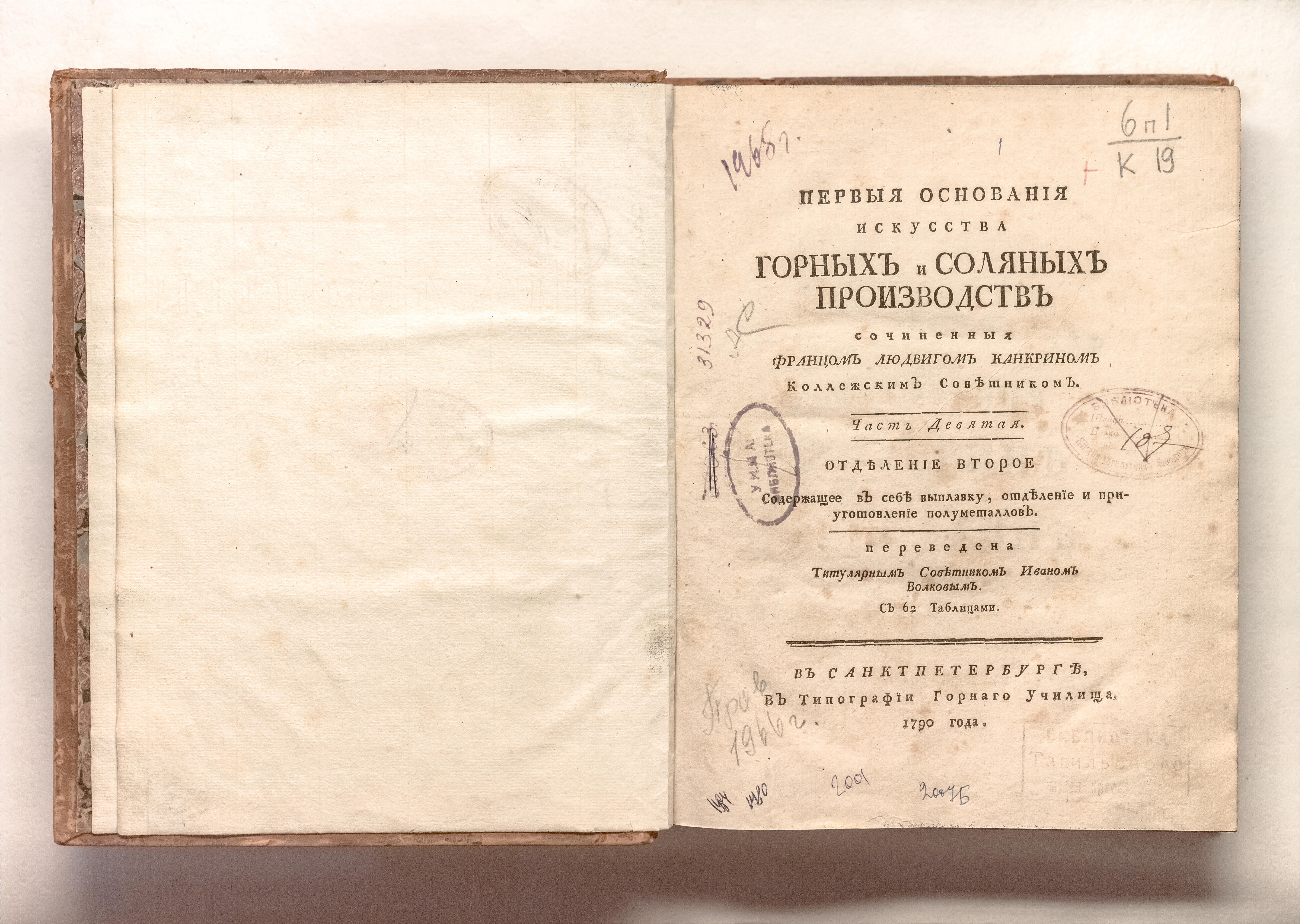 Ч. 9. Отделение второе. Содержащее в себе выплавку, отделение и приуготовление полуметаллов / пер. титулярным советником Иваном Волковым. – Санкт-Петербург : тип. Горного училища, 1790. – [1], [II], 141 с. : 8 л. табл.