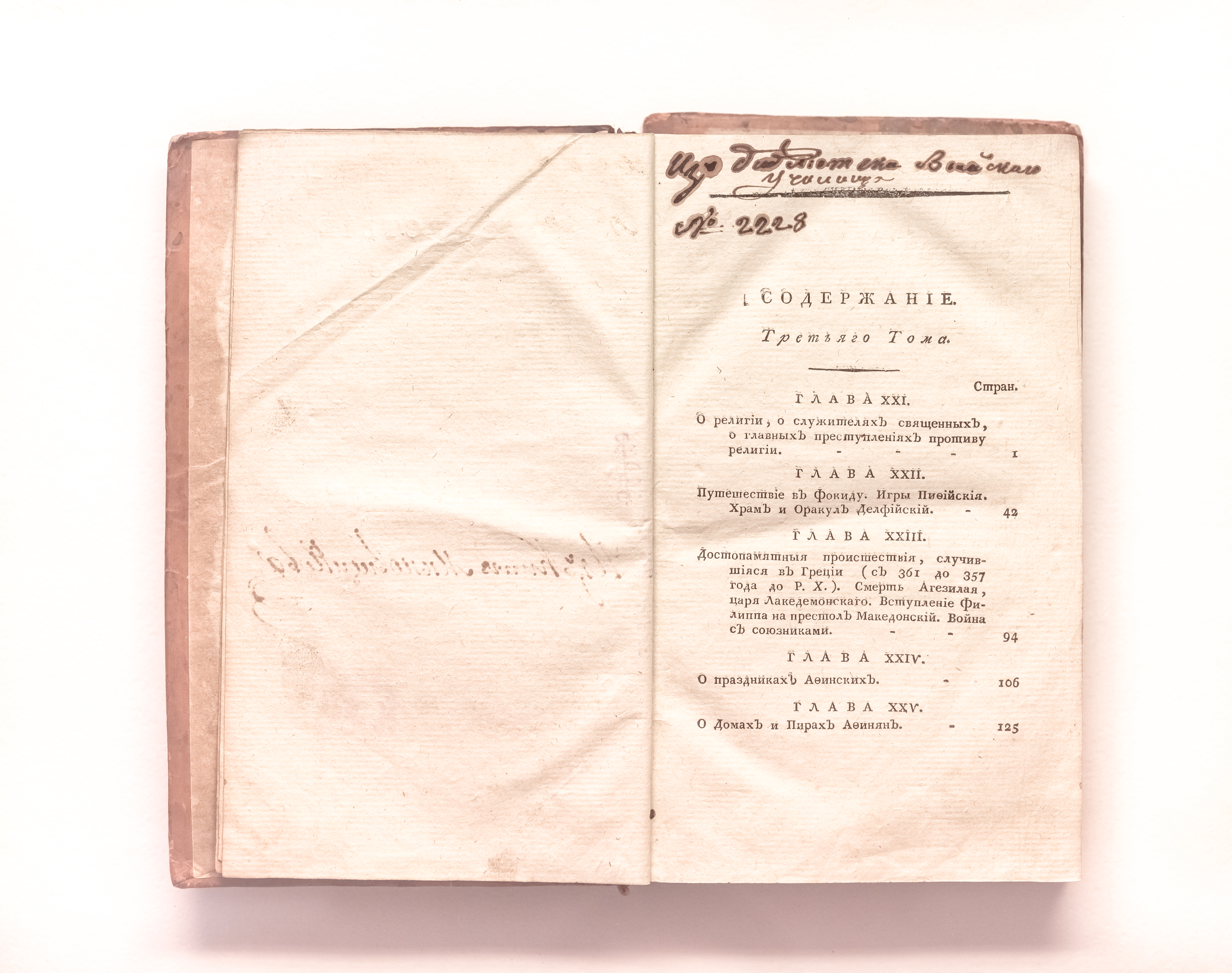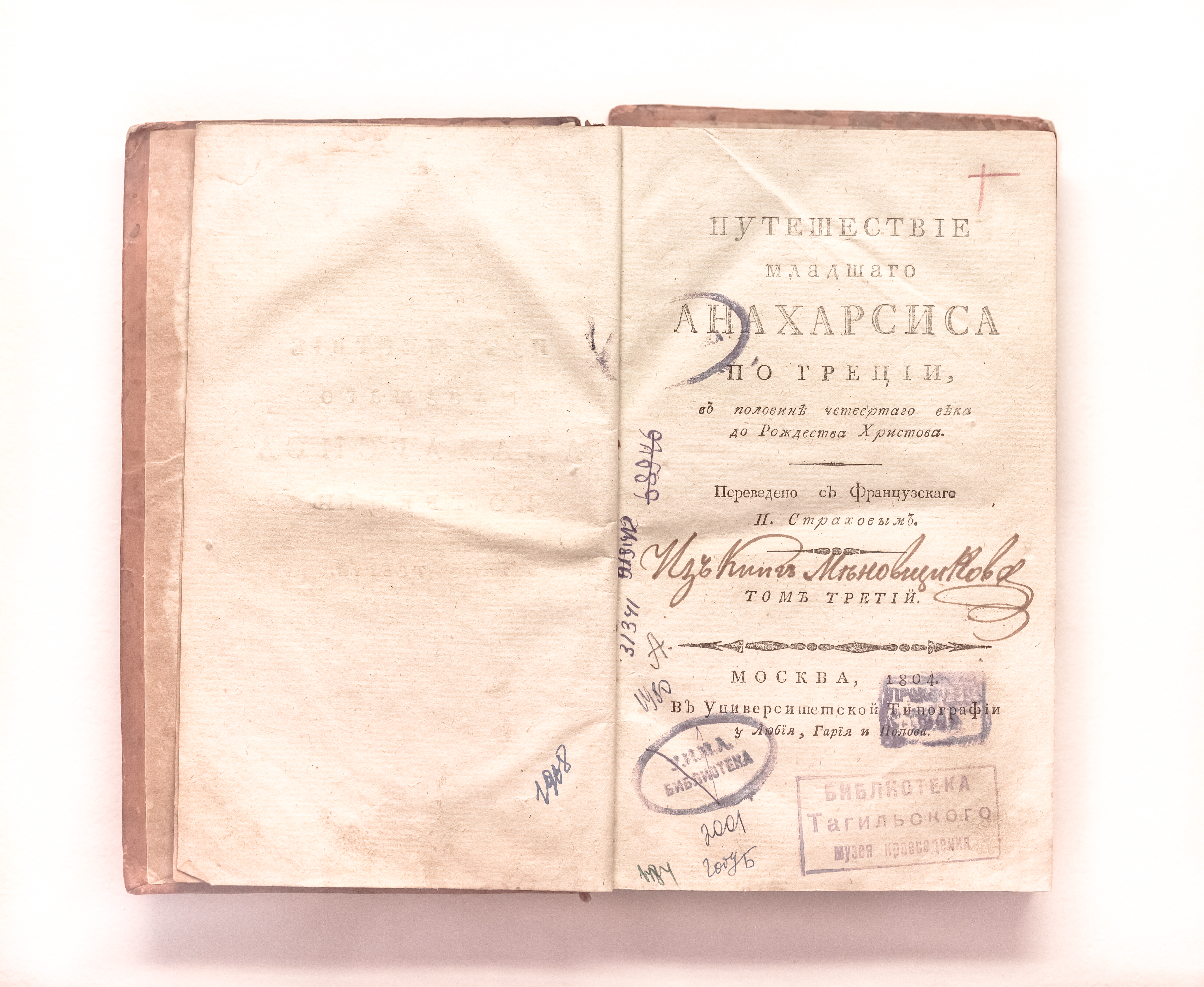 Бартелеми, Жан Жак (1716-1795). Путешествие младшего Анахарсиса по Греции, в половине четвертаго века до Рождества Христова / Ж. Ж. Бартелеми ; переведено с французскаго П. Страховым. – Т. 3. – Москва : В Университетской типографии, у Люби, Гария и Попова, 1804. – [3], 421 с. ; 21х13 см.
