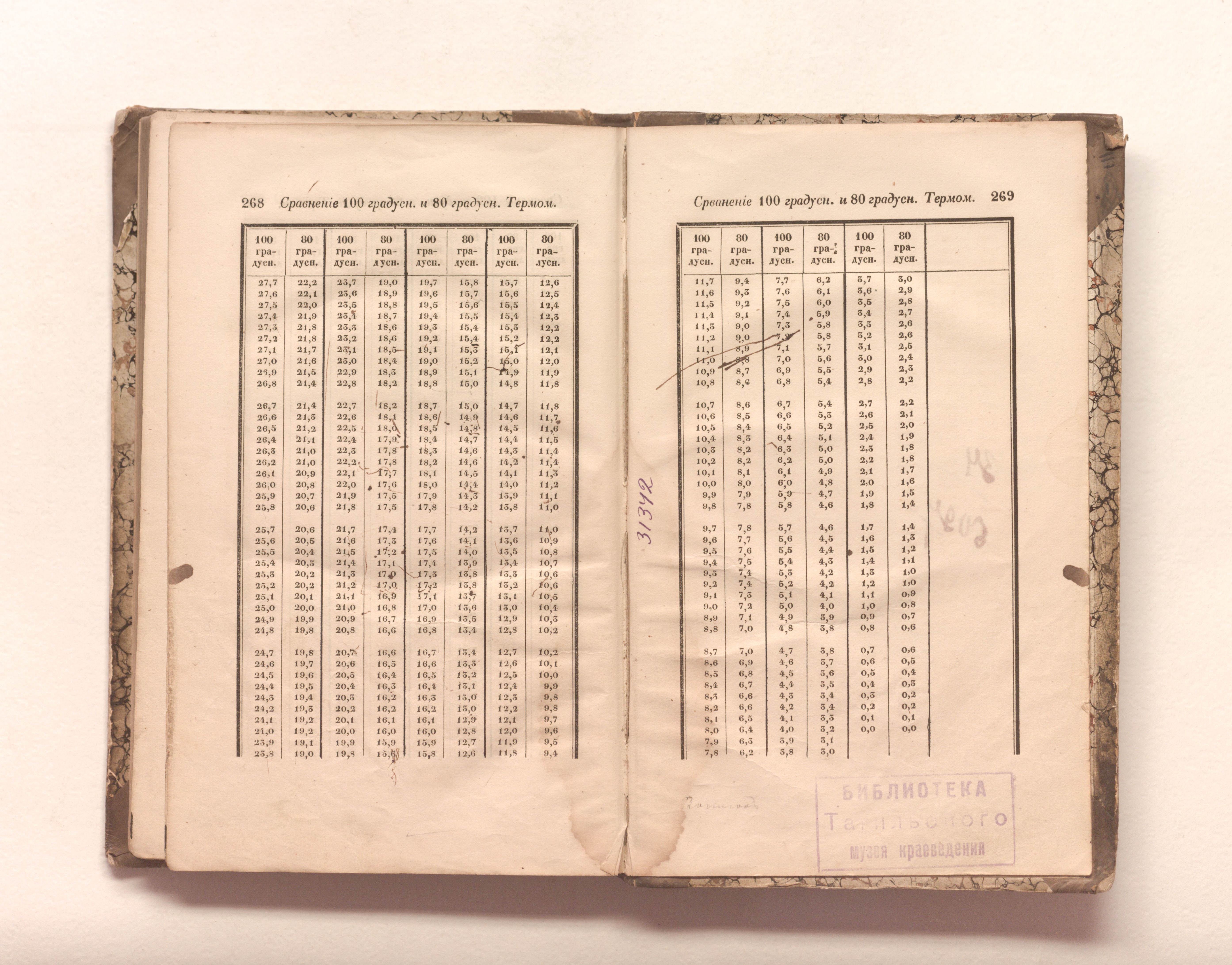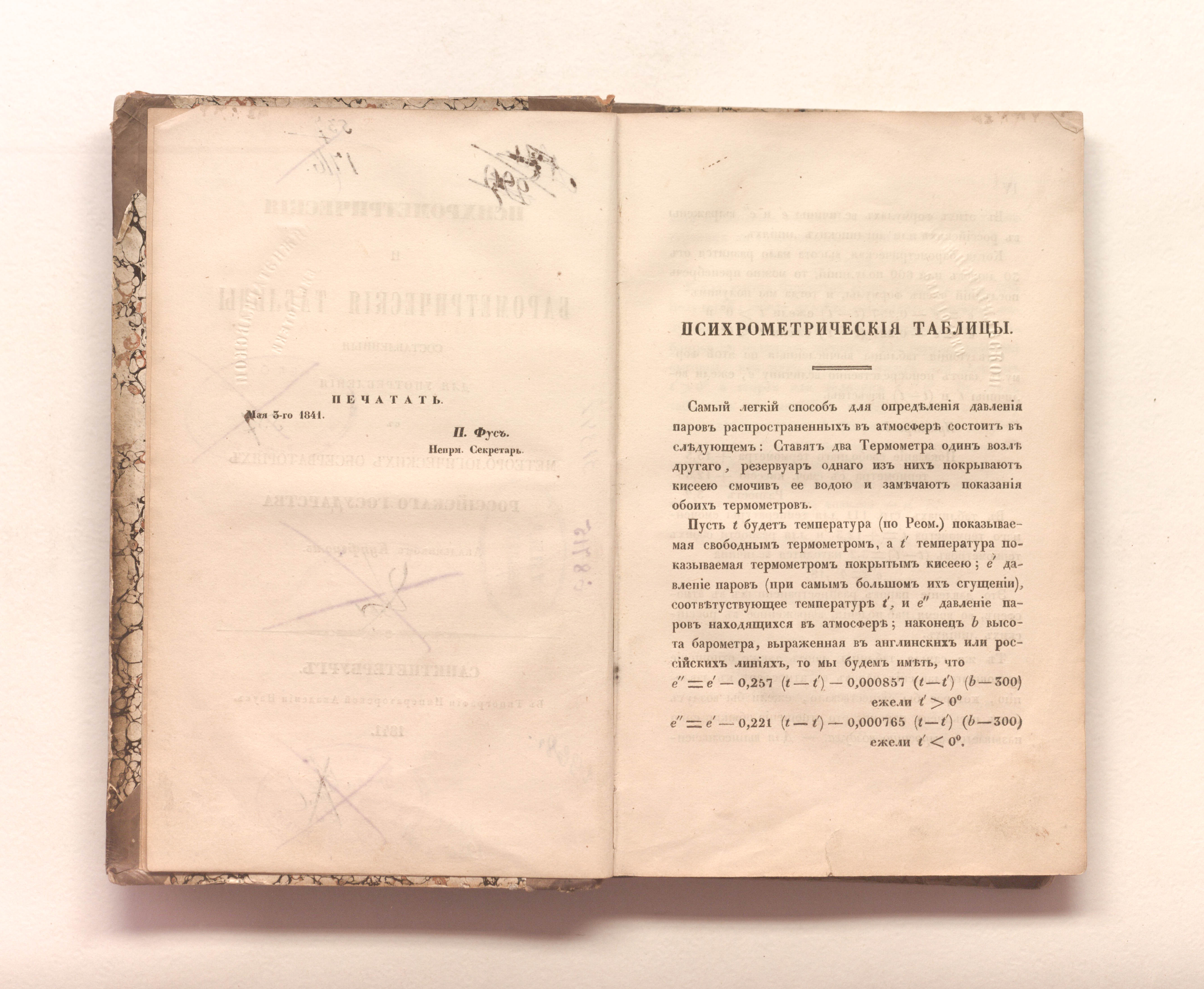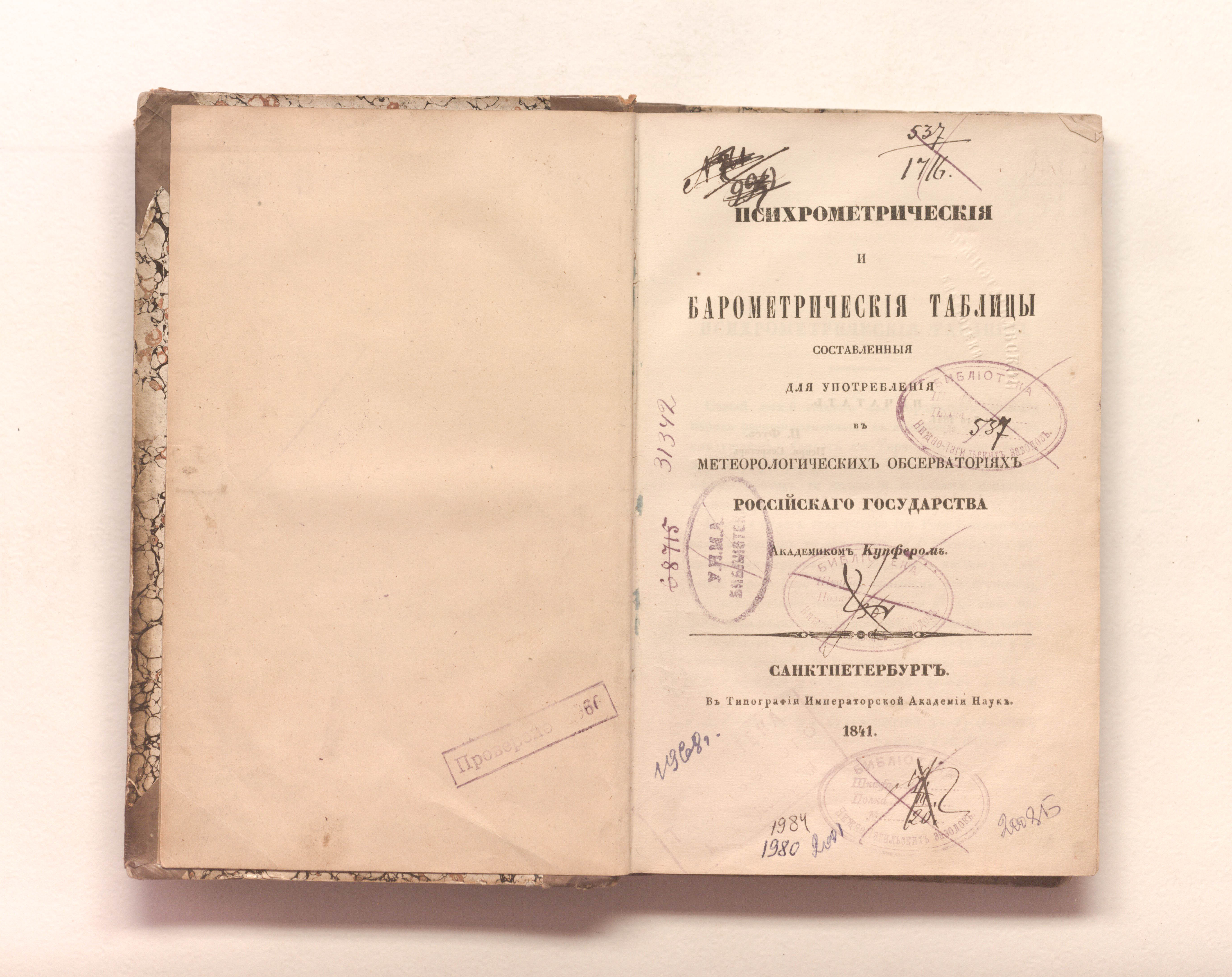 Купфер, Адольф Яковлевич (1799-1865). Психрометрические и барометрические таблицы, составленные для употребления в метеорологических обсерваториях Российского государства академиком Купфером. — Санкт-Петербург : тип. Имп. Акад. наук, 1841. — VIII, [2], 256 с. ; 21,5х13,5 см.