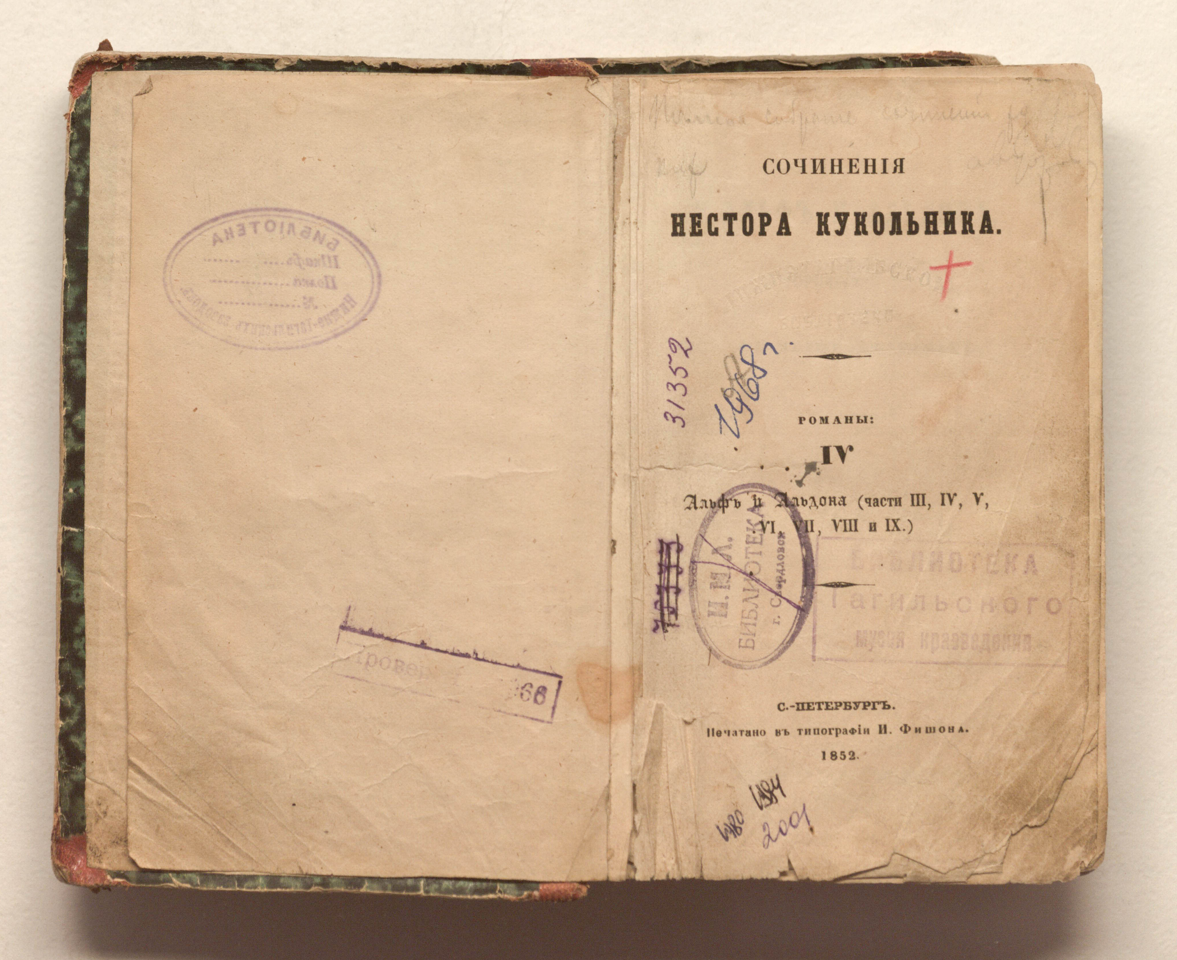 Сочинения Нестора Кукольника. Романы: IV. Альф и Альдона (части 3-9) / Н. В. Кукольник. — Санкт-Петербург : тип. И. Фишона, 1852. — 602 с. ; 17,5х11 см.