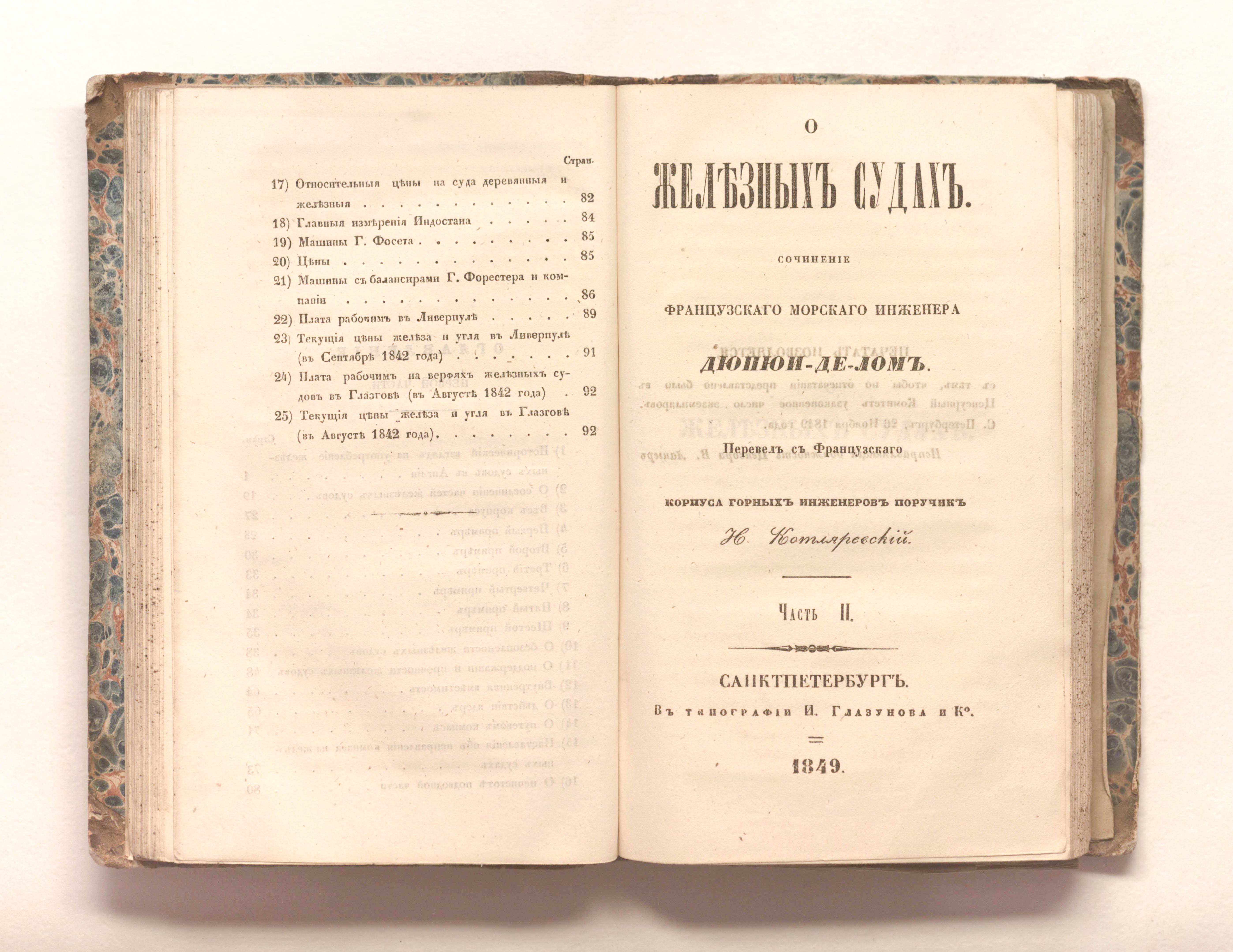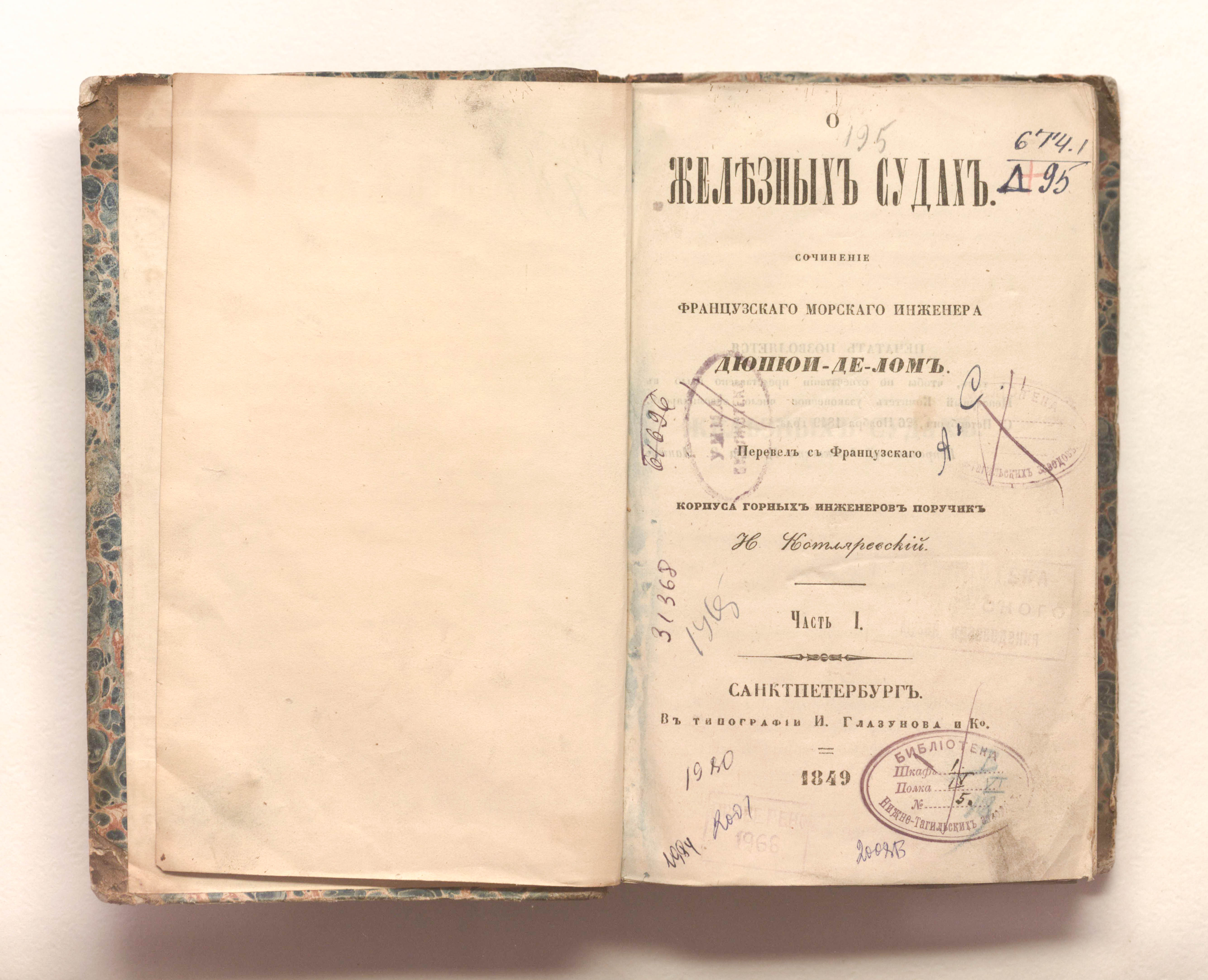 О железных судах. Ч. 1-2 / сочинение французскаго морскаго инжинера Дюпюи-де-Лом ; пер. с фр. корпуса горных инженеров поручик И. Котляревский. — Санкт-Петербург : тип. И. Глазунова, 1849. — 99, [2], 159, [2] с. : ил., 20 табл. ; 22х13,5 см.