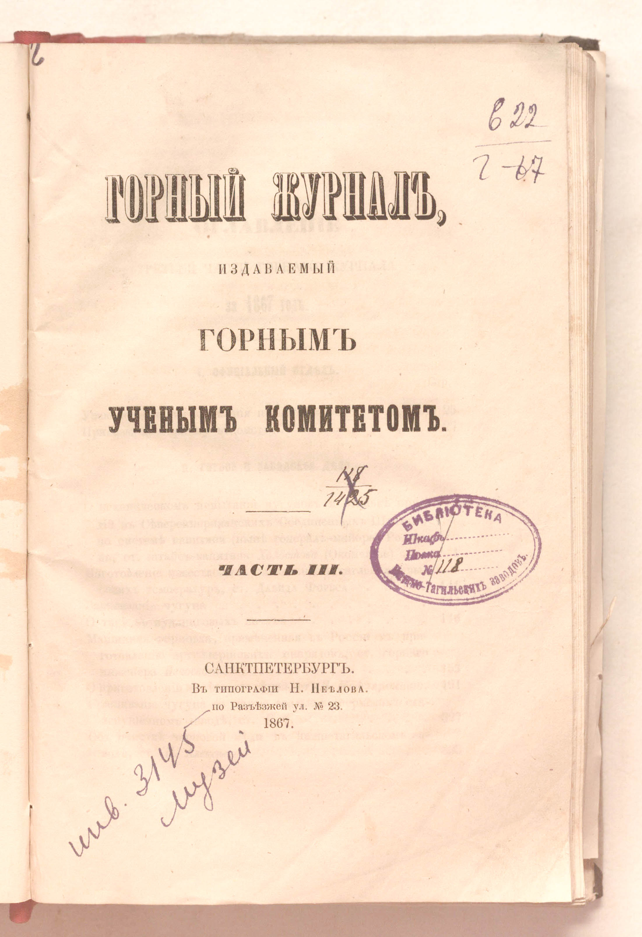 Горный журнал, издаваемый ученым комитетом корпуса горных инженеров.