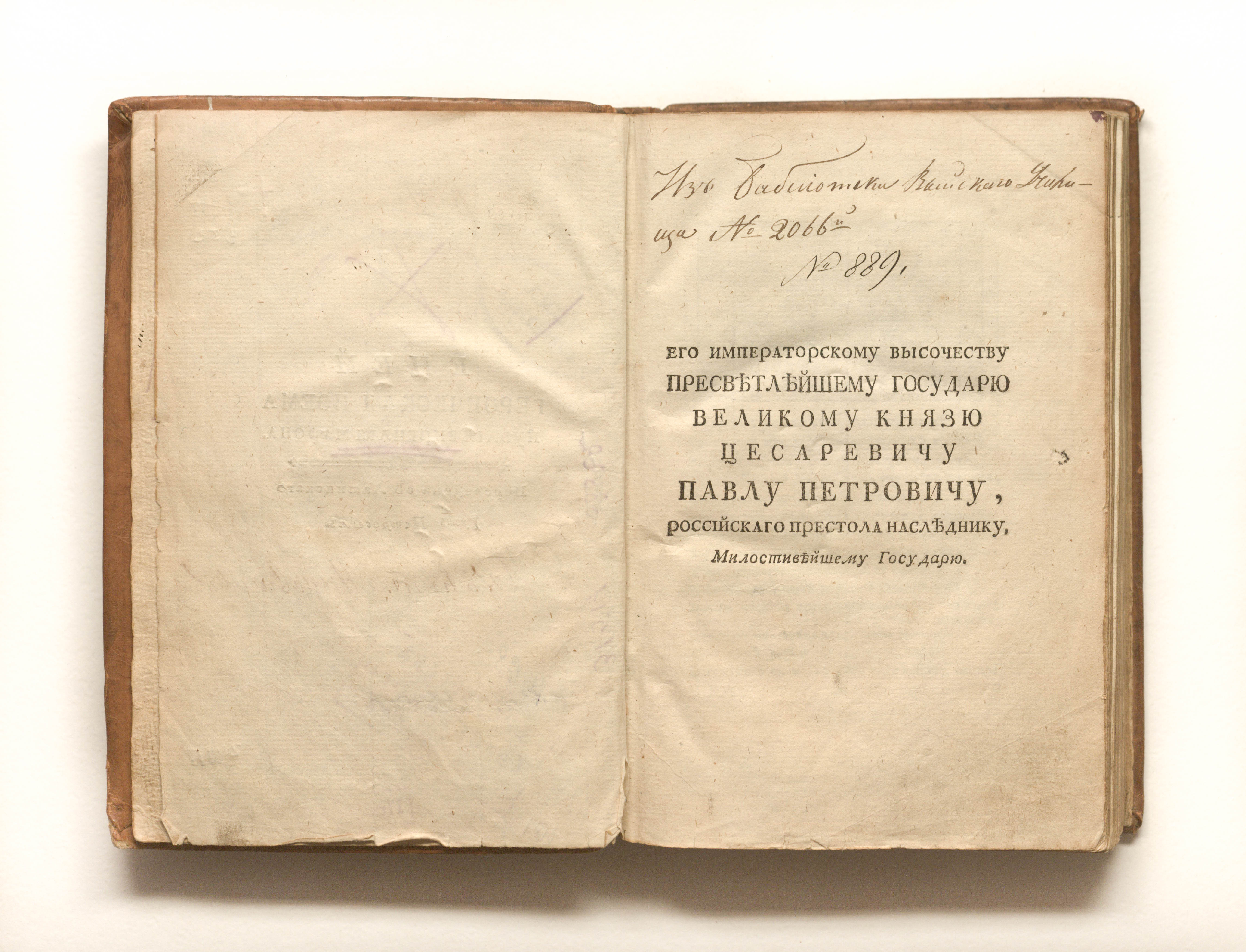 «Из библиотеки Выйскаго училища № 2066" (л. посвящения); « Из книг Меновщикова» (тит. л.).