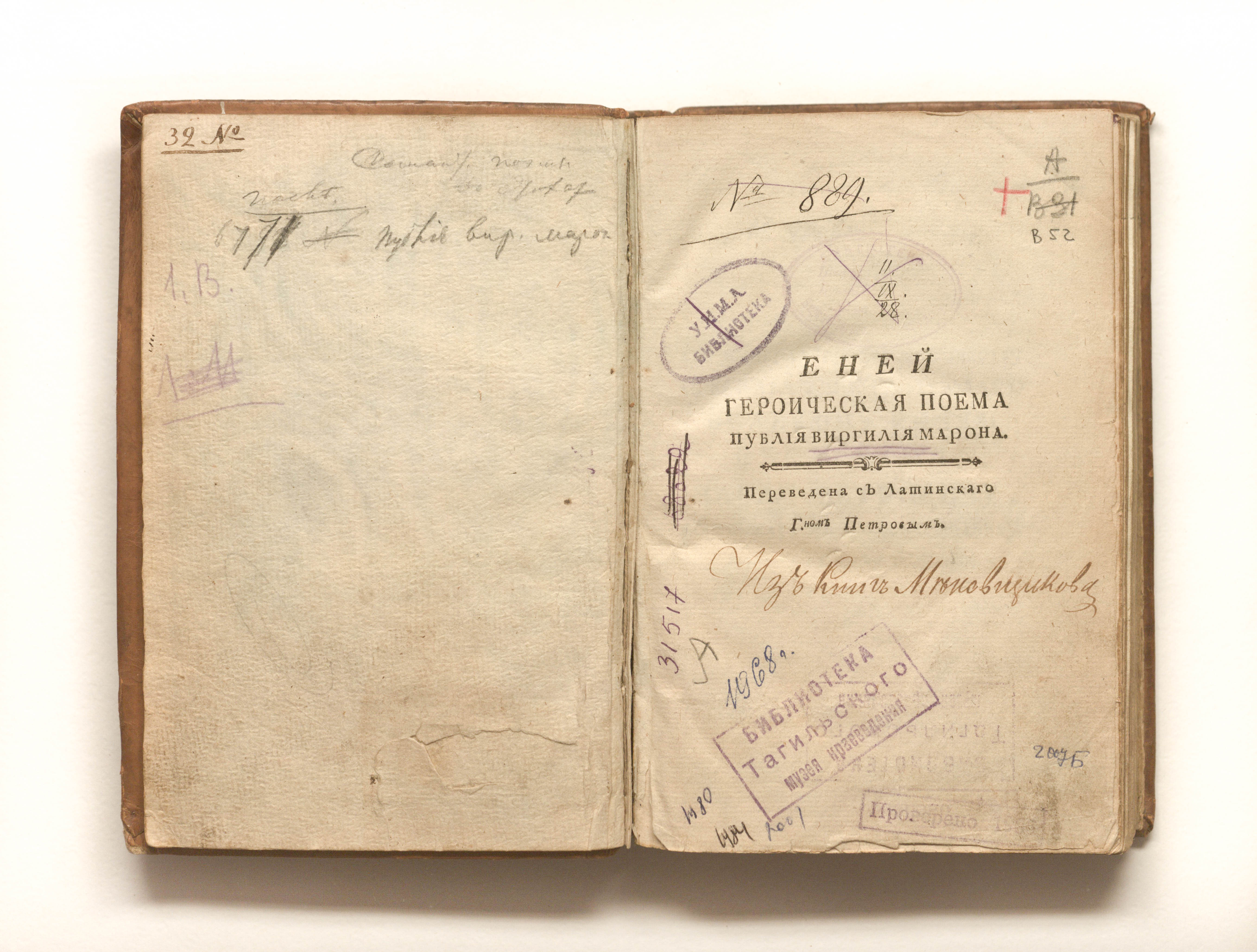 Вергилий Марон, Публий (70-19). Еней. Героическая поема / Публия Виргилия Марона ; переведена с латинскаго г. Петровым. — [Санкт-Петербург] : [При Имп. Акад. наук], [1781-1786]. — Песнь 1-6. — ;[1781]. — 308 с. ; 20х13,5 см.