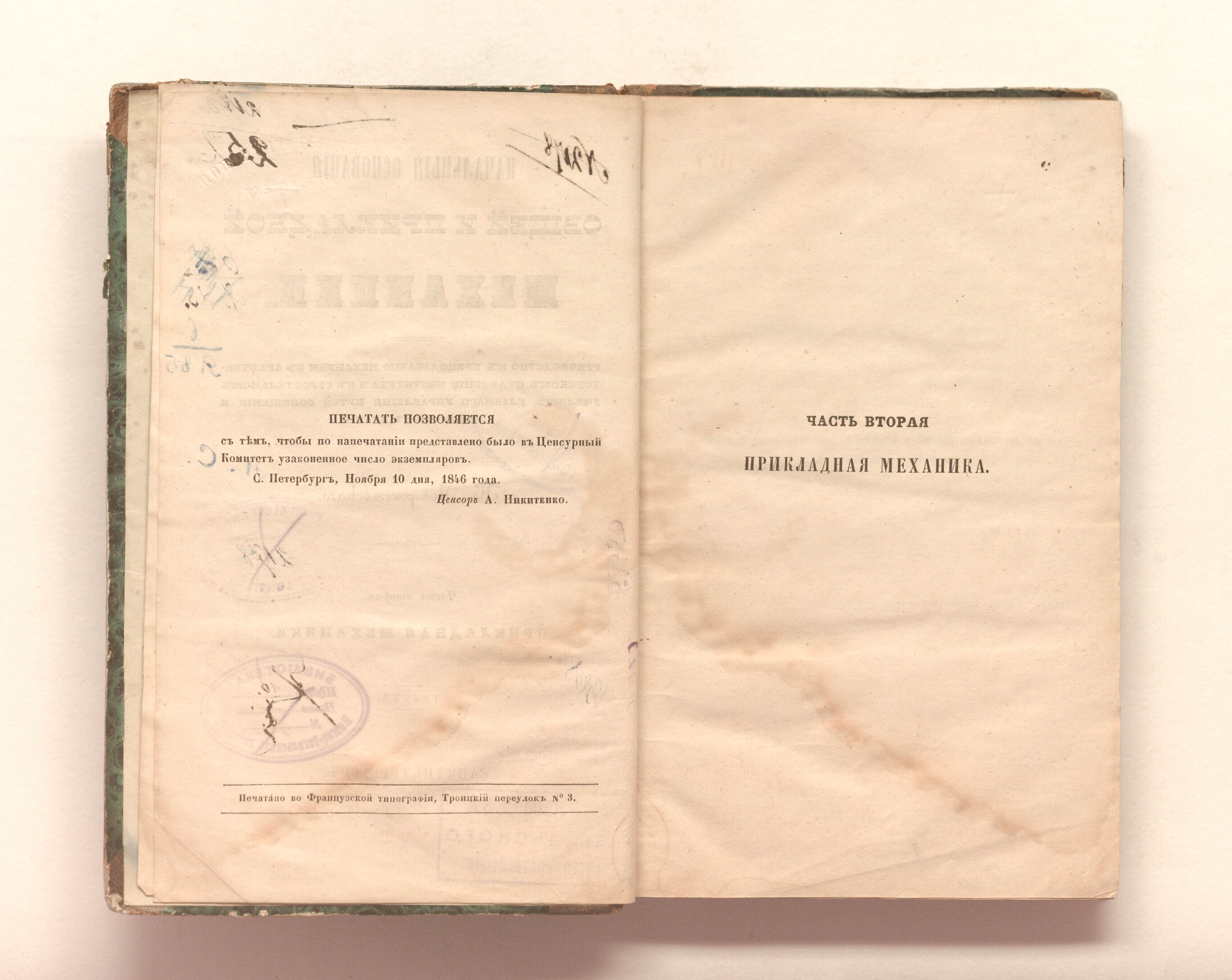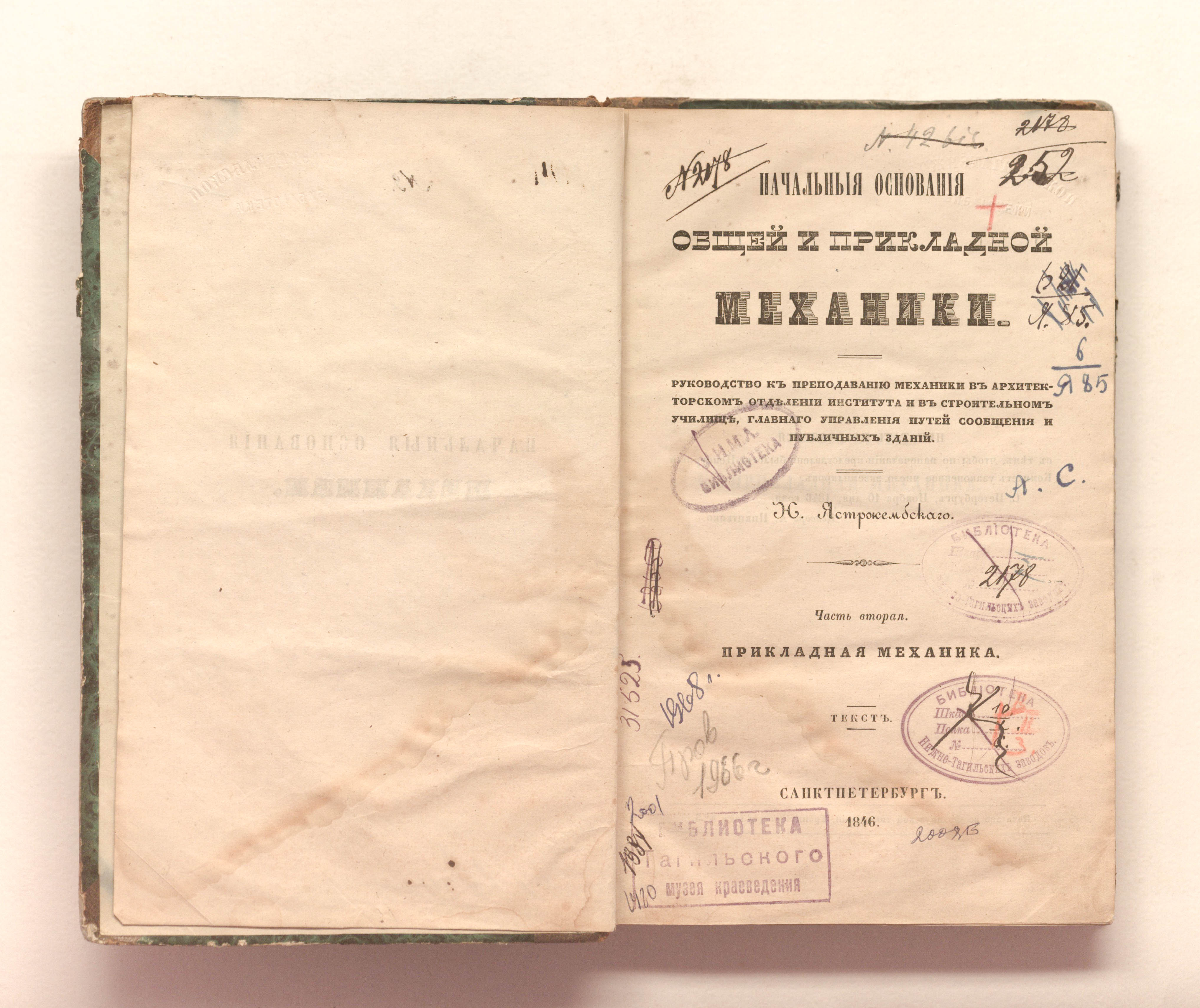 Начальные основания общей и прикладной механики : руководство к преподаванию механики в Архитект. отделении Института и в Строит. уч-ще Главного управления путей сообщения и публичных зданий. Ч. 2. Прикладная механика / Н. Ф. Ястржембский. — Санкт-Петербург : во французской типографии, 1846. — [8], XXII, 370, VI с. ; 23х14,5 см.