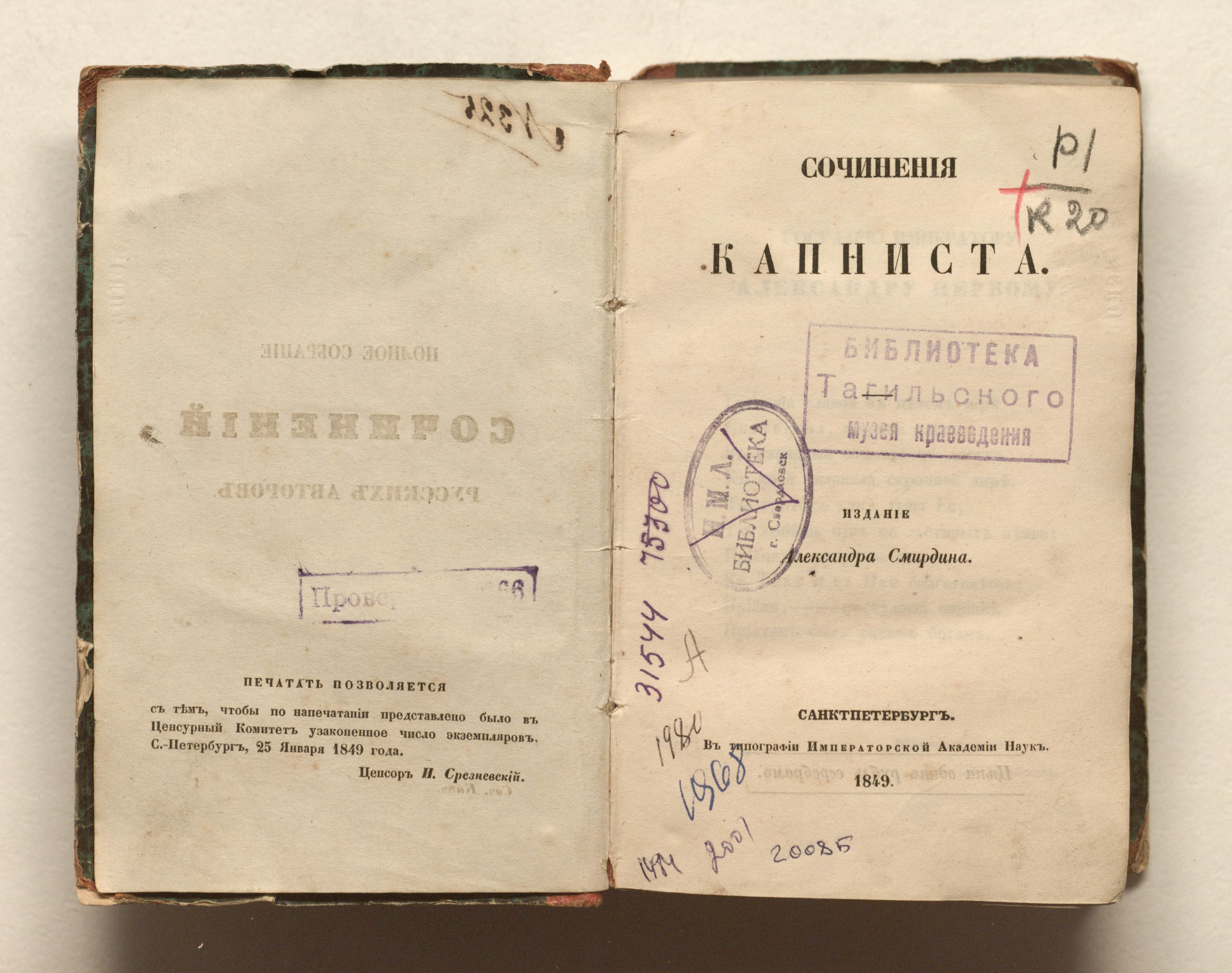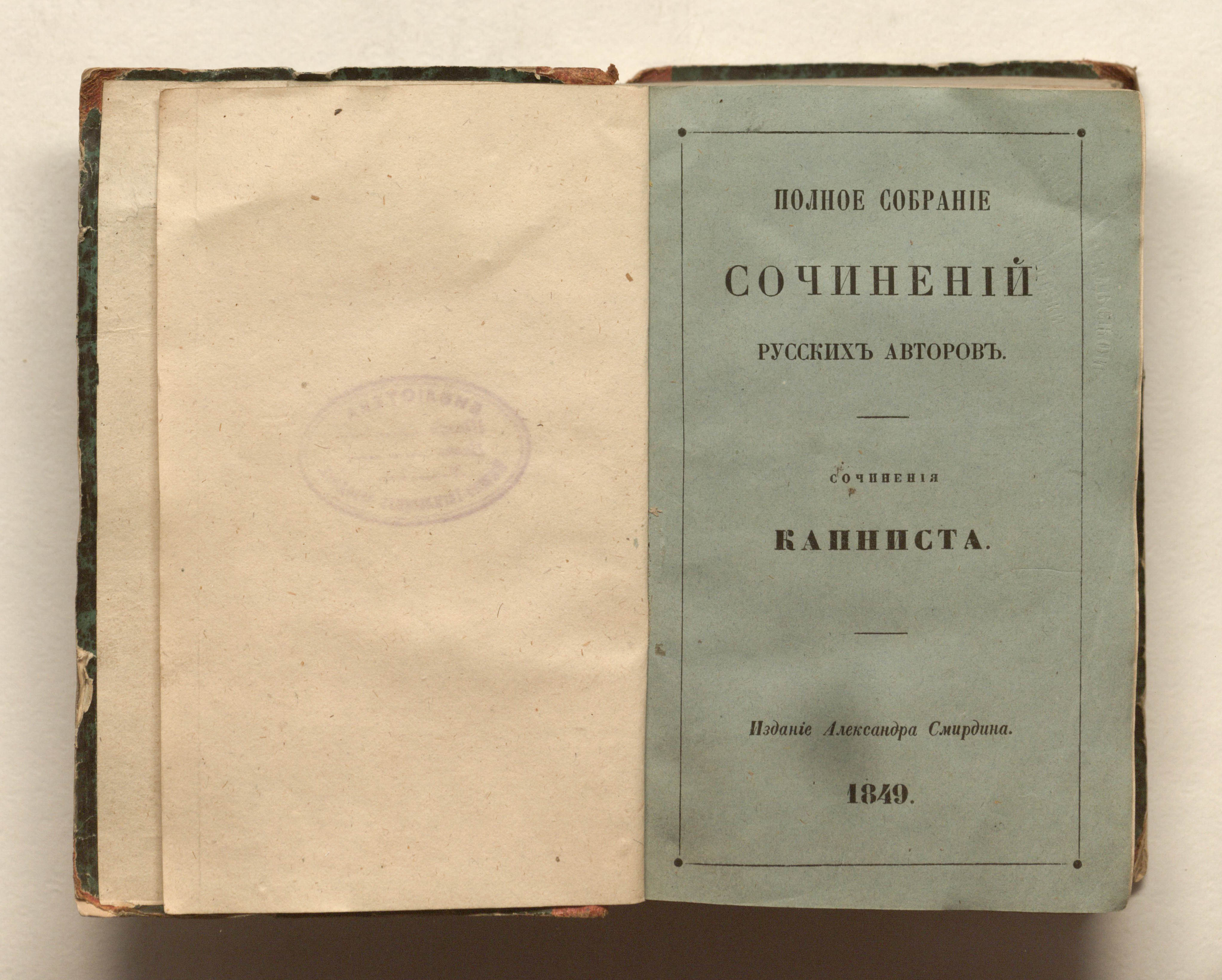 Сочинения Капниста / В. В. Капнист. — Санкт-Петербург : Издание Александра Смирдина, 1849 (тип. Императорской академии наук). — 632, IV с. — (Полное собрание сочинений русских авторов) ; 17х11,5 см.