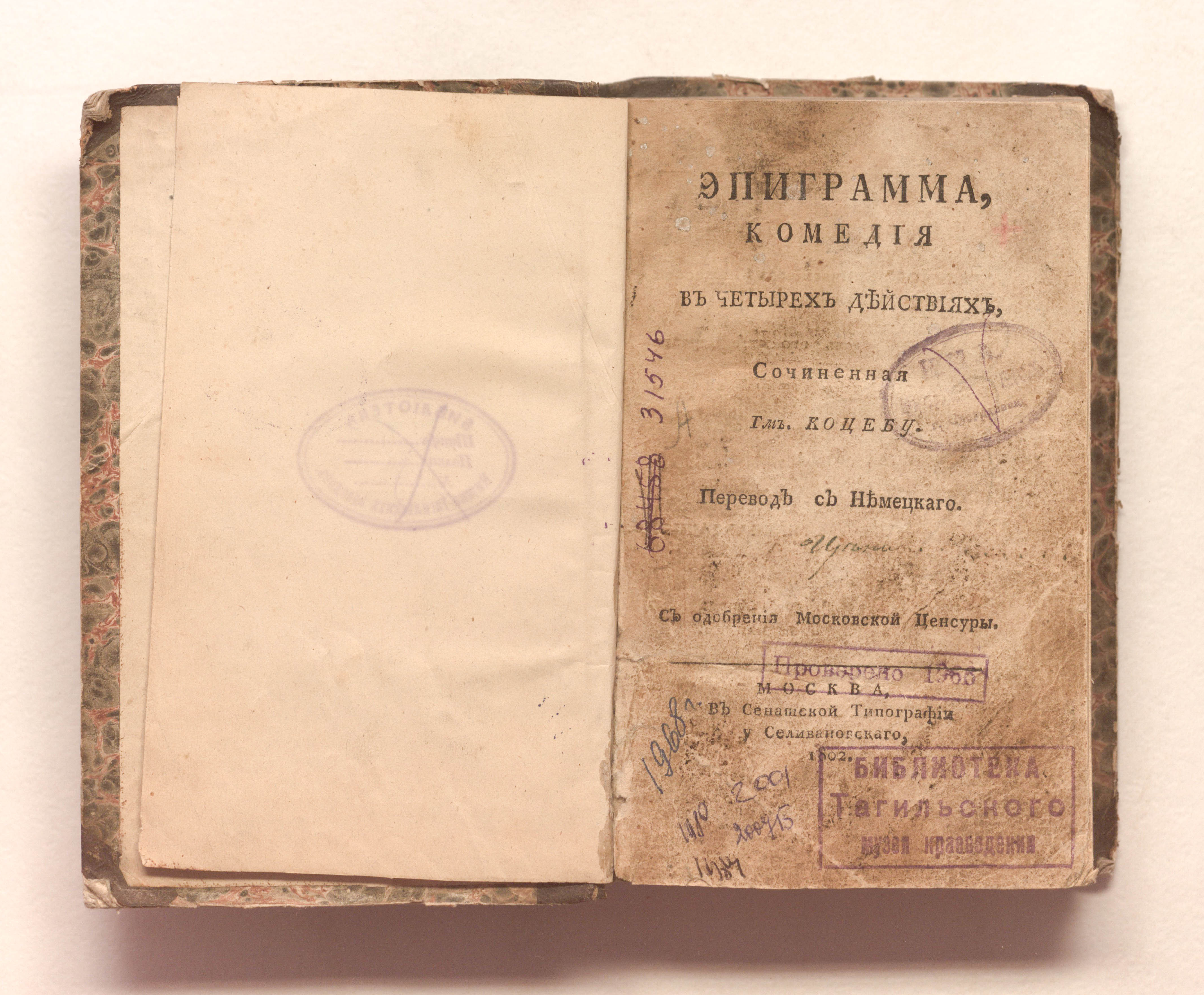 Эпиграмма, комедия в четырех действиях / сочиненная гм. Коцебу ; перевод с немецкаго. – Москва : в Сенатской типографии у Селивановскаго, 1802. – 264 с. ; 17,5х11,5 см.