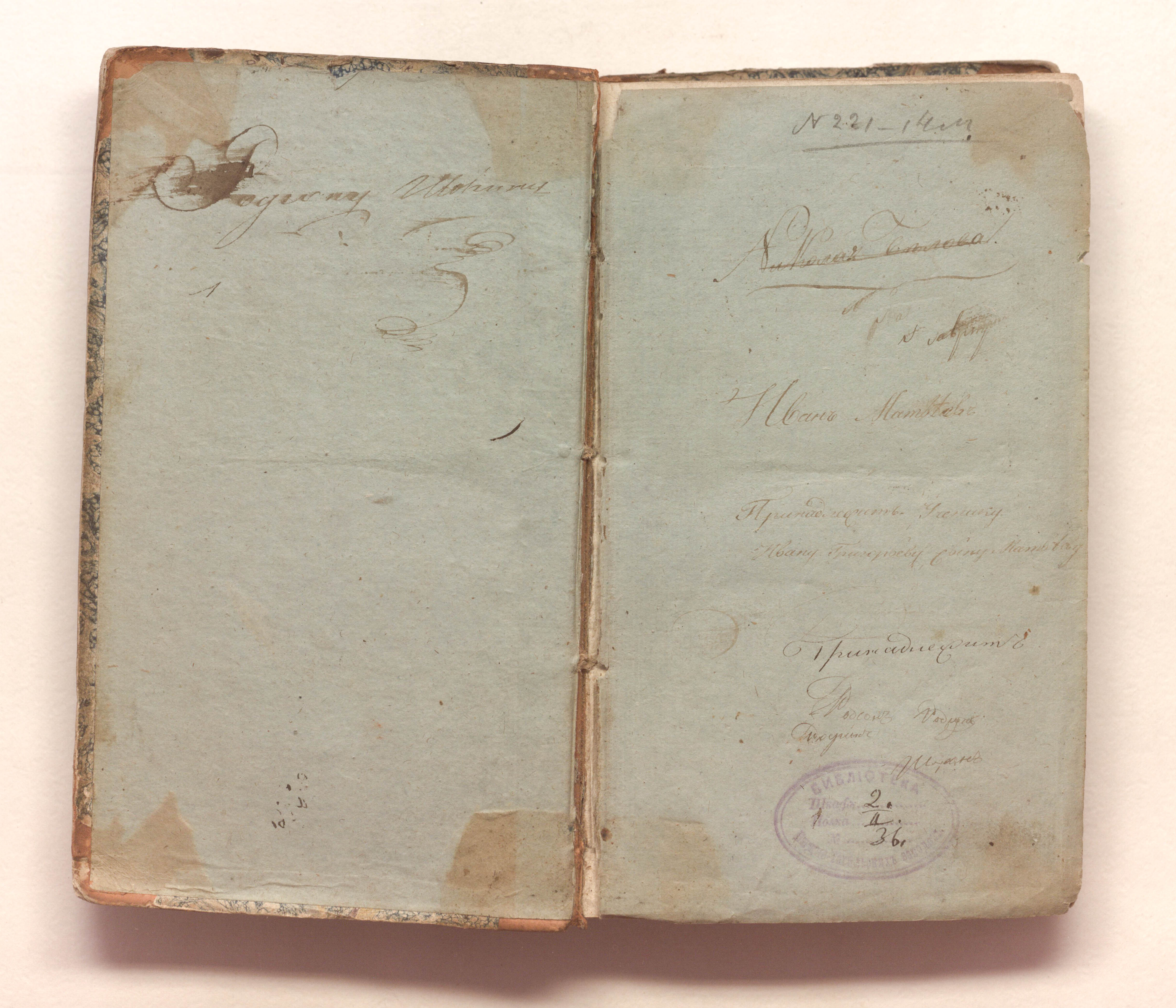 «Библиотека Нижне-Тагильских заводов Шкаф 2. Полка II. № 36» (форзац);