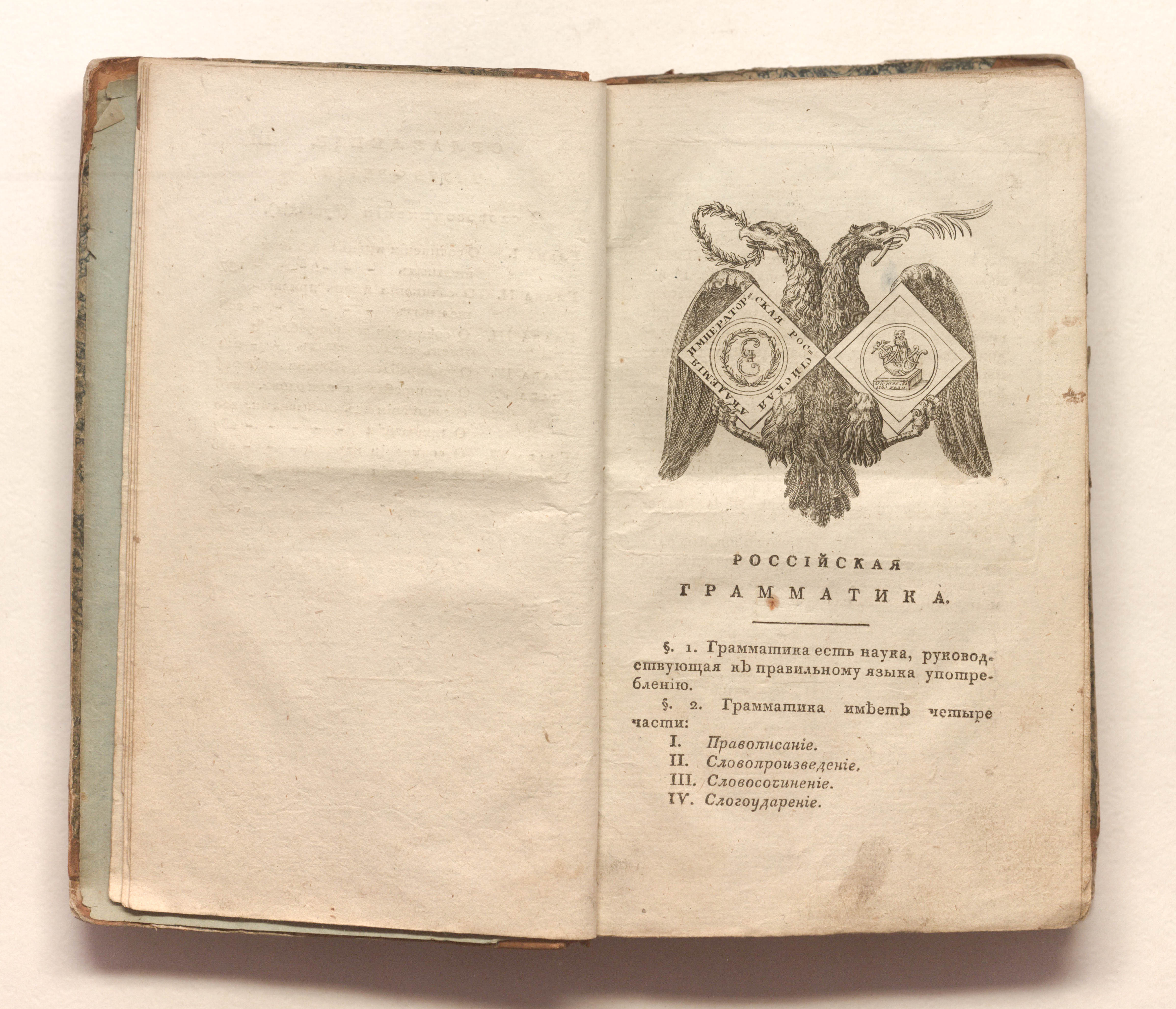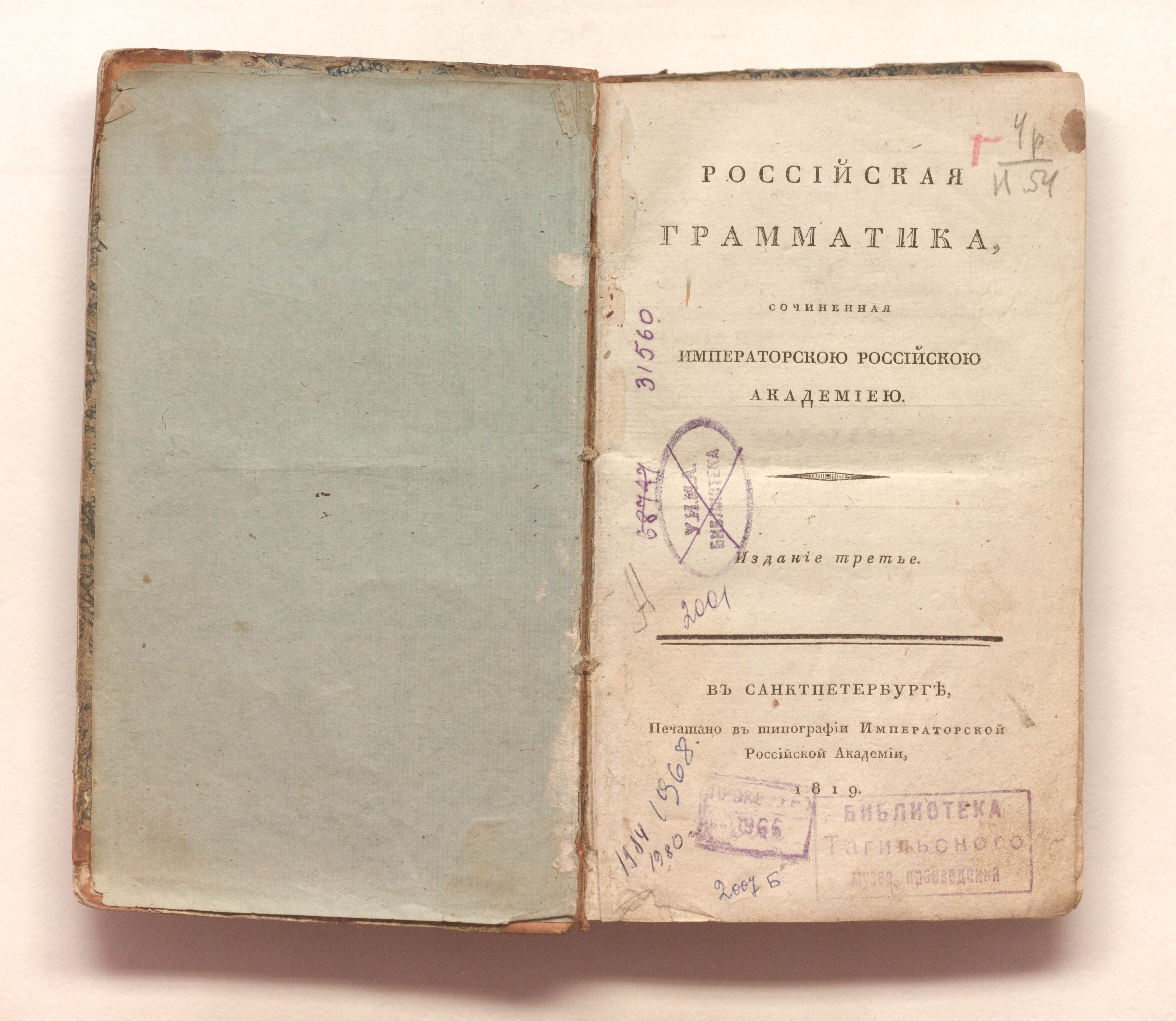 Российская грамматика / сочиненная Императорскою Российскою Академиею ; [сост.: Д. и П. Соколовы]. – Издание третье. – Санкт-Петербург : тип. Имп. рос. акад., 1819. – [2], IV, III, 272 с. : табл. ; 21х13 см.