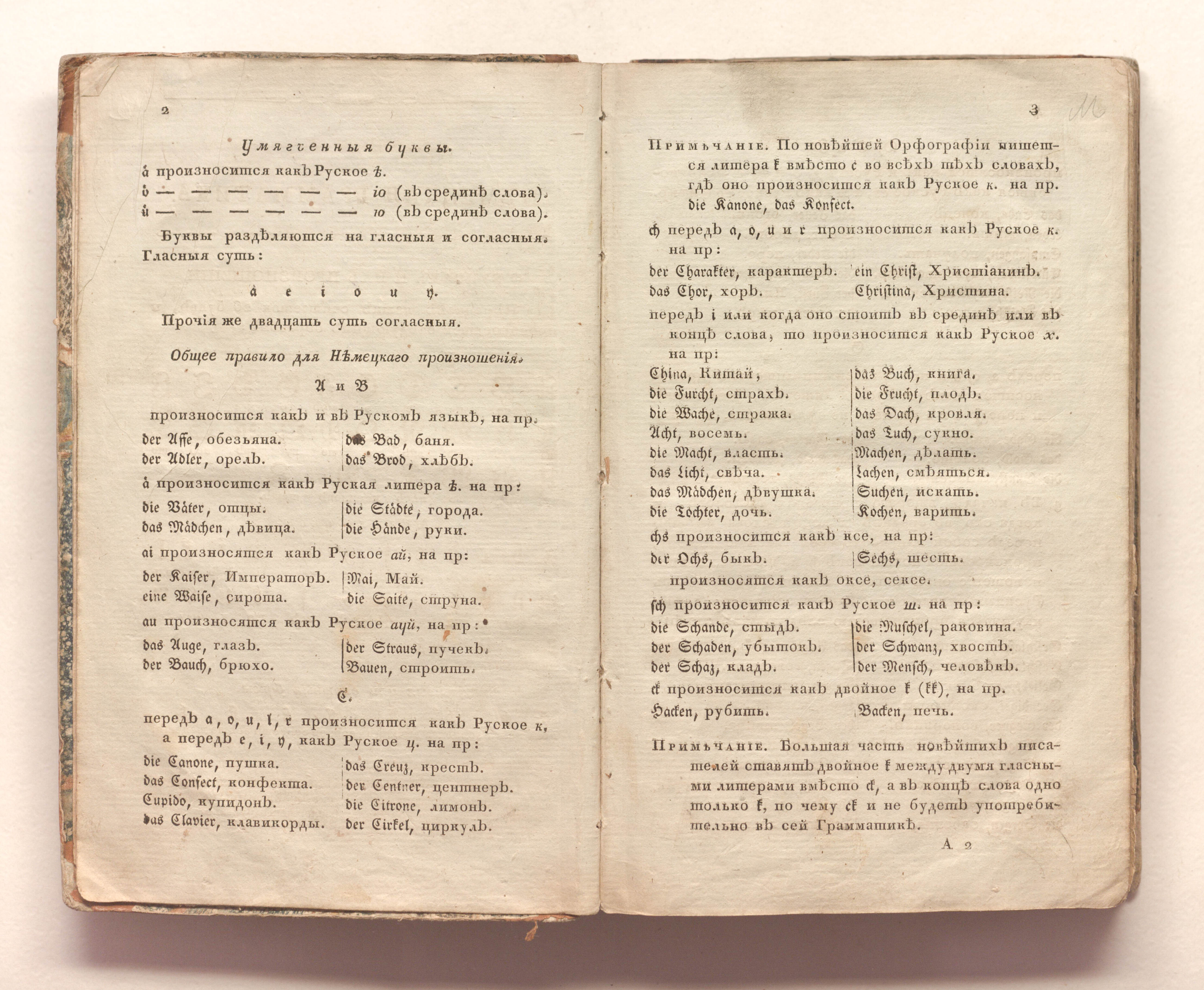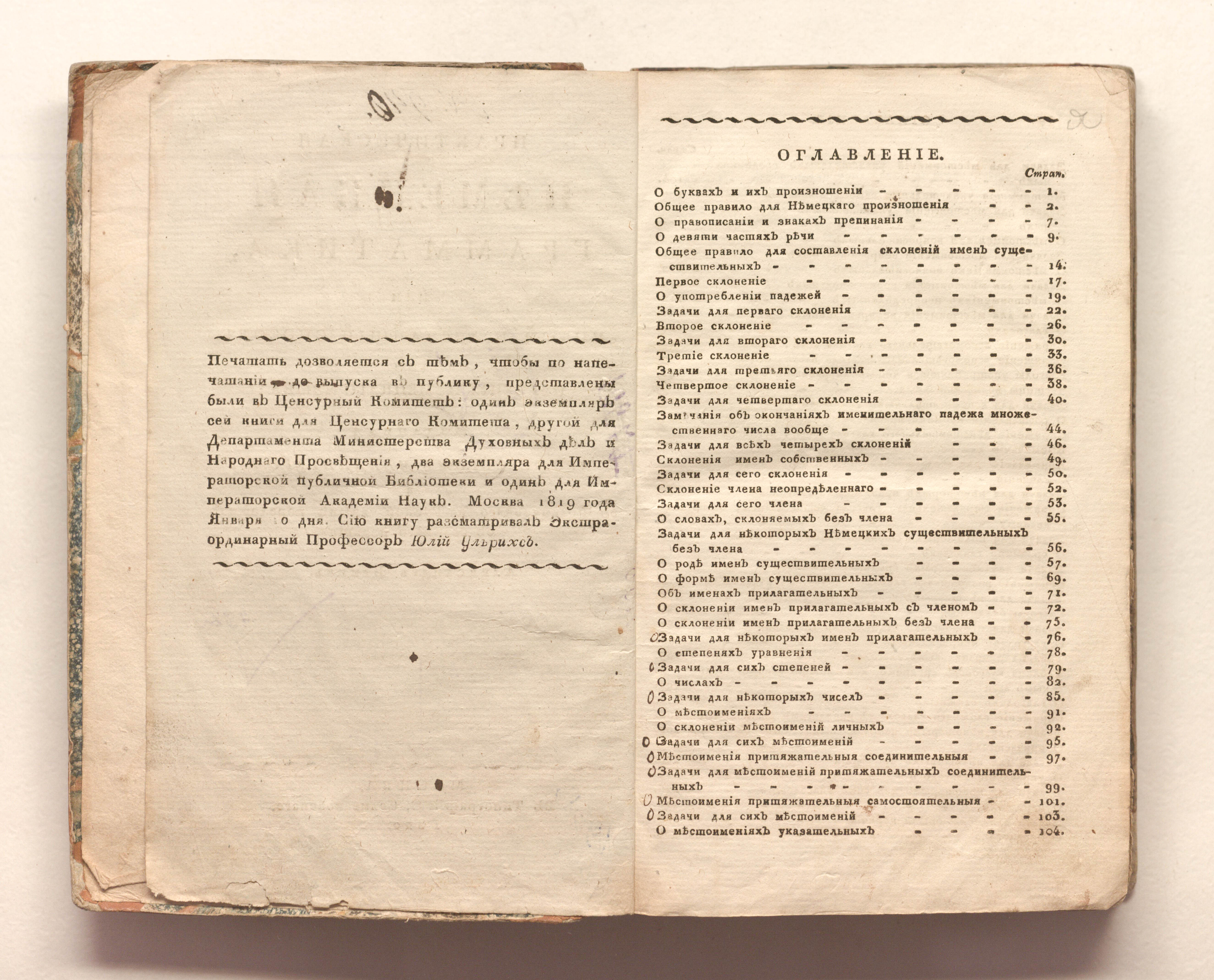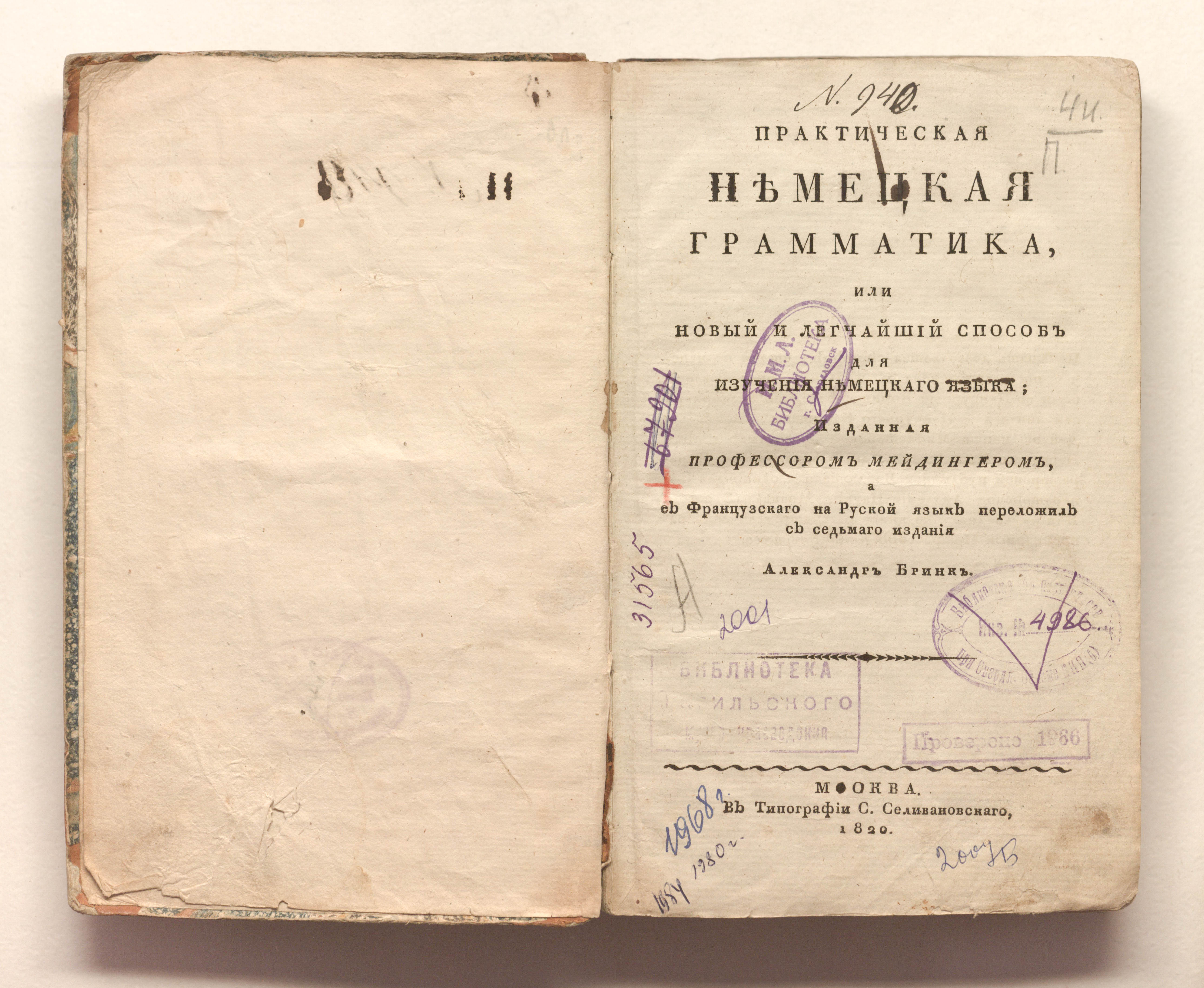 Практическая немецкая грамматика, или Новый и легчайший способ для изучения немецкого языка / изданная профессором Мейдингером, а с французского на русский язык переложил с седьмого издания Александр Бринк. – Москва : в типографии С. Селивановскаго, 1820. – VI, 414 с. ; 22х14,5 см.