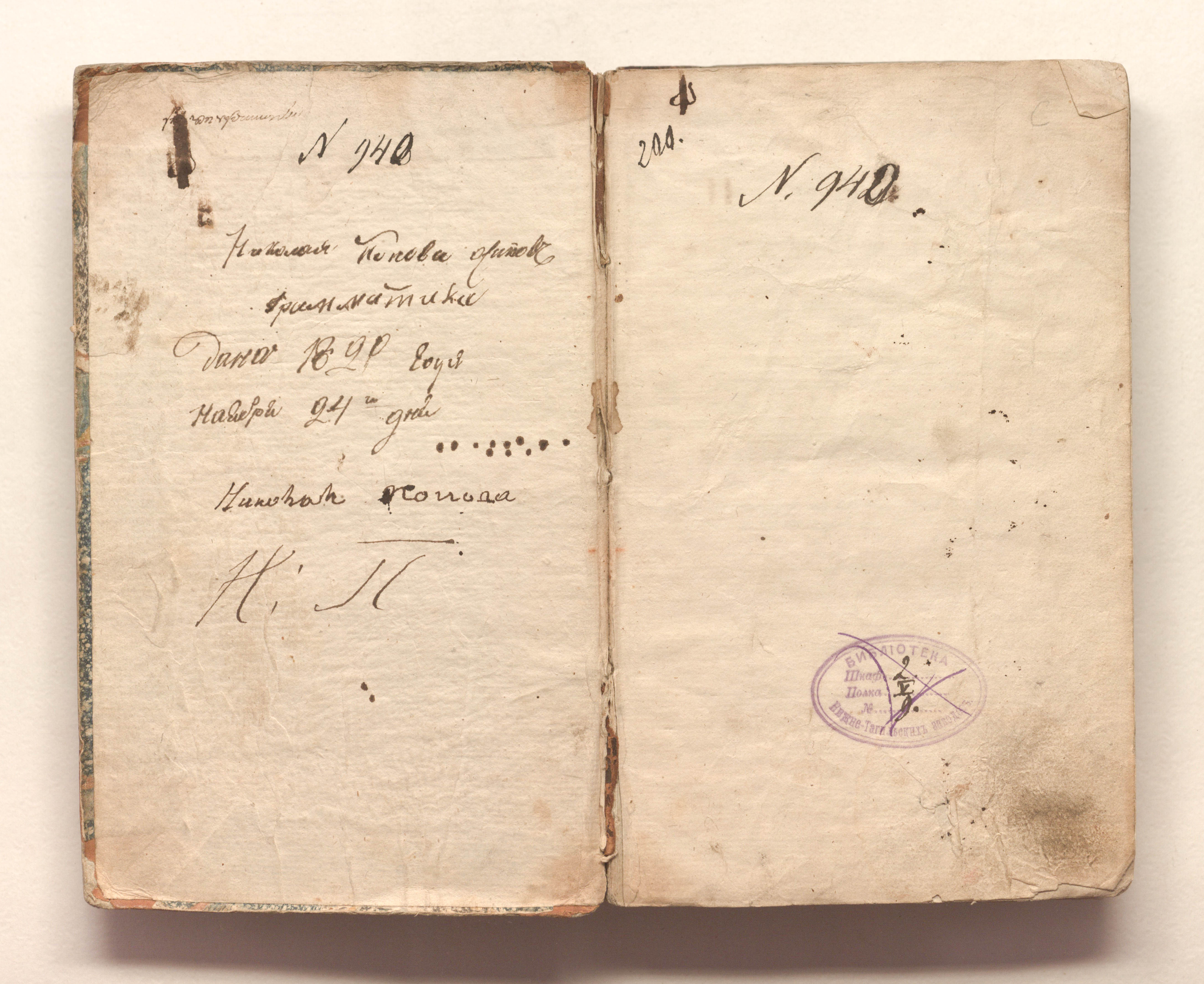 «Николая Попова [1 сл. неразб.] грамматика дана 1820 года ноября 24 дня» (форзац);