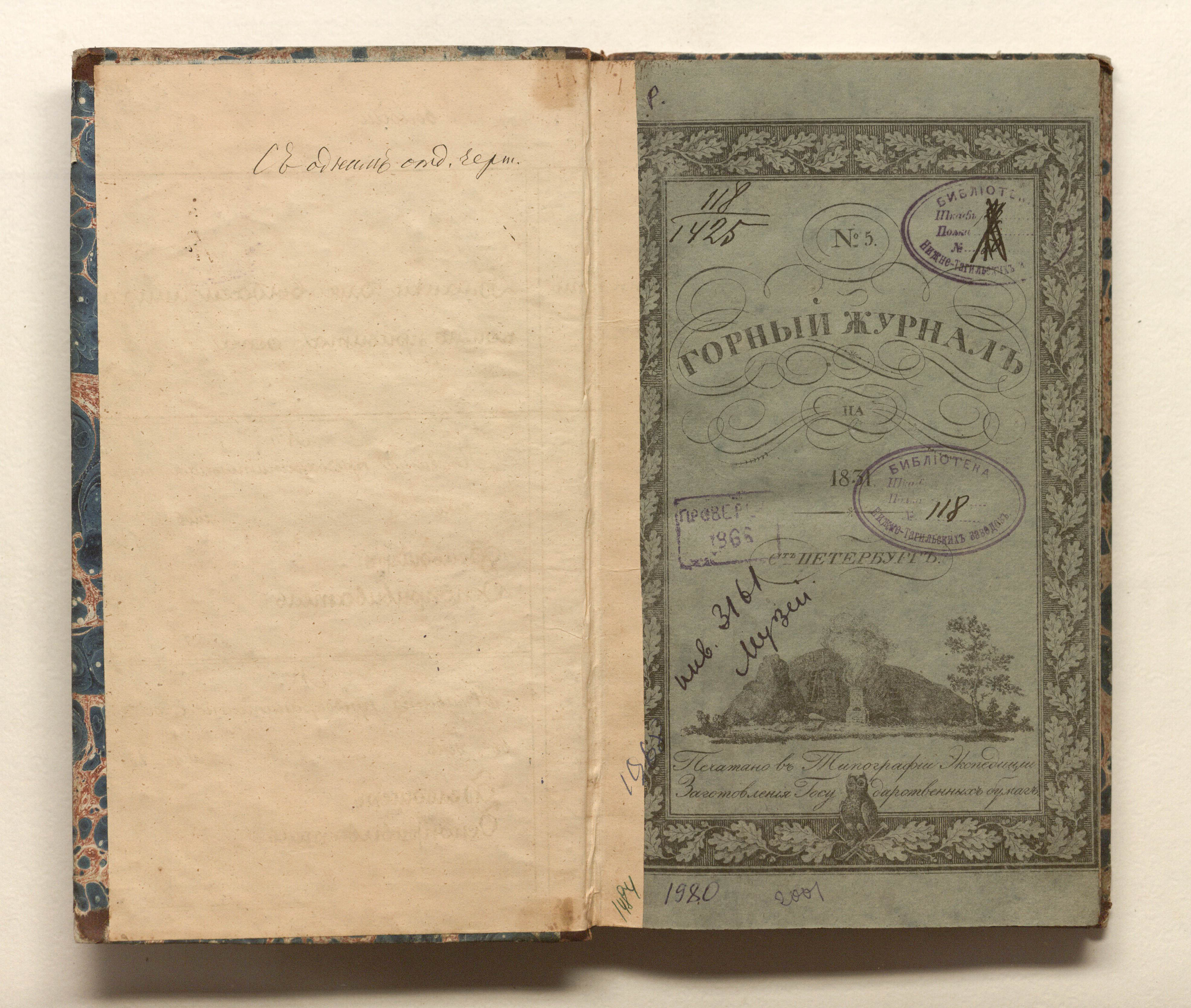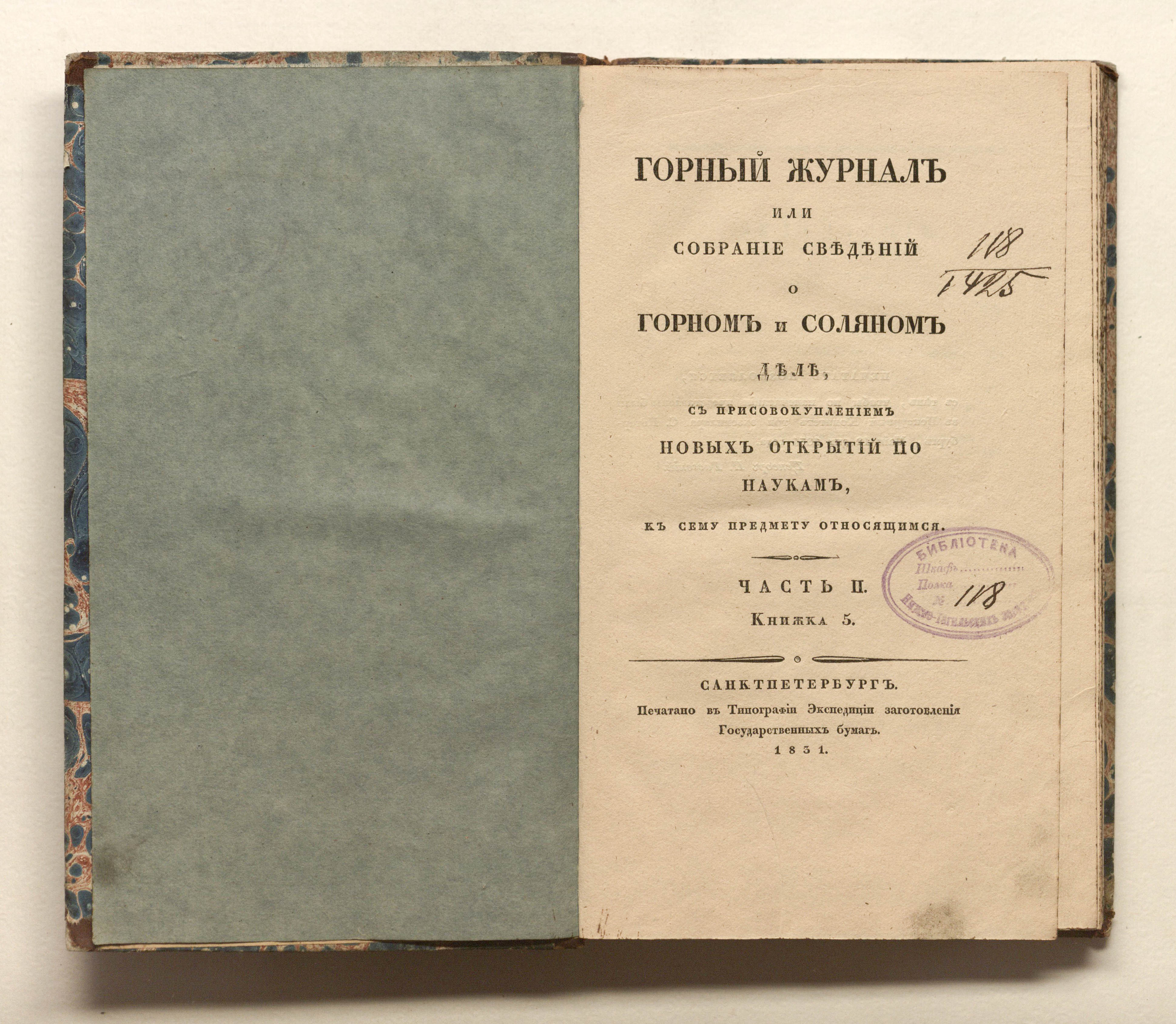 Горный журнал или Собрание сведений о горном и соляном деле, С присовокуплением новых открытий по наукам, к сему предмету относящимся. – Санкт-Петербург : печатано в военной типографии Главнаго штаба его Императорскаго Величества ; в типографии Экспедиции заготовления государственных бумаг, 1825-1918.