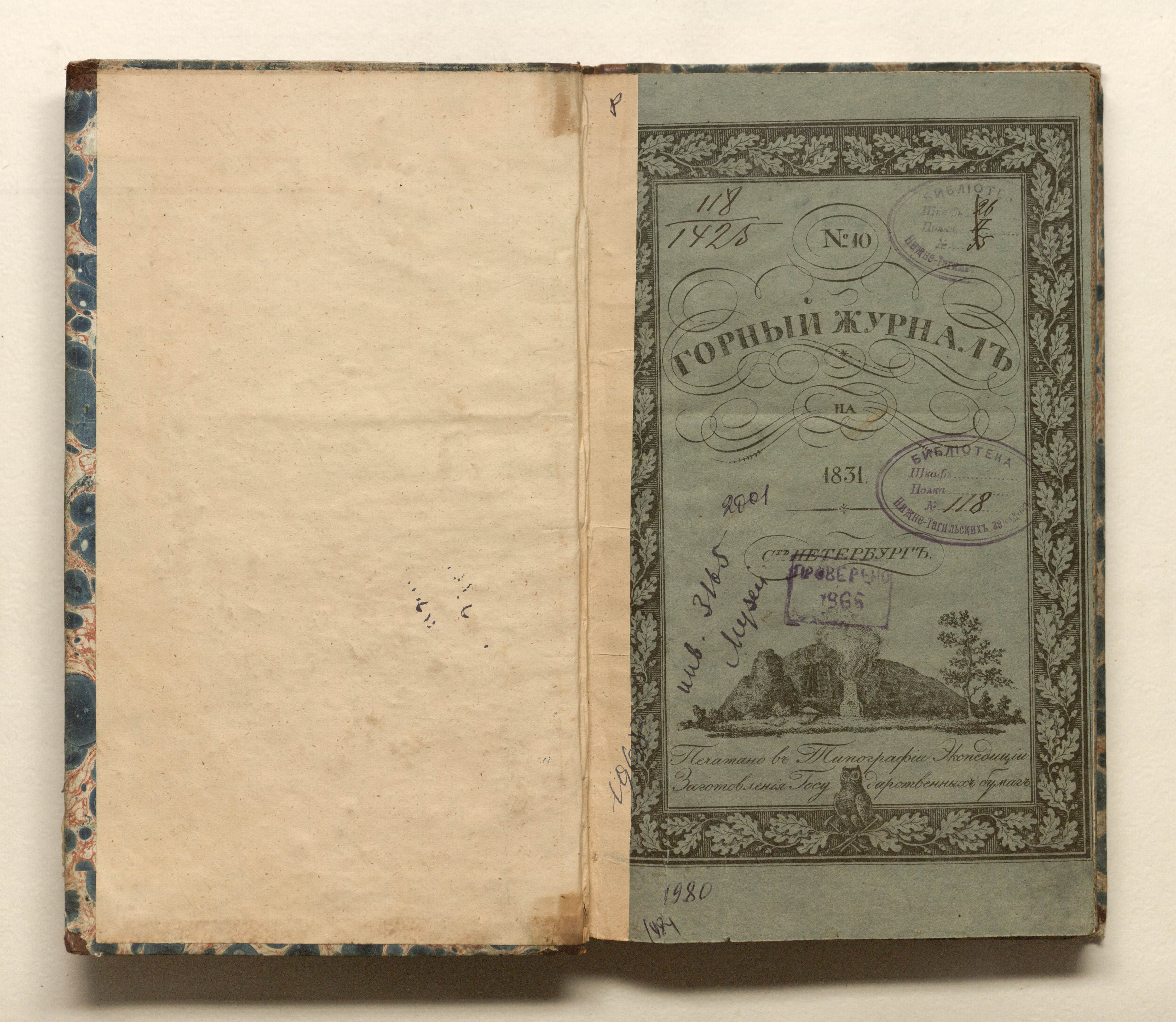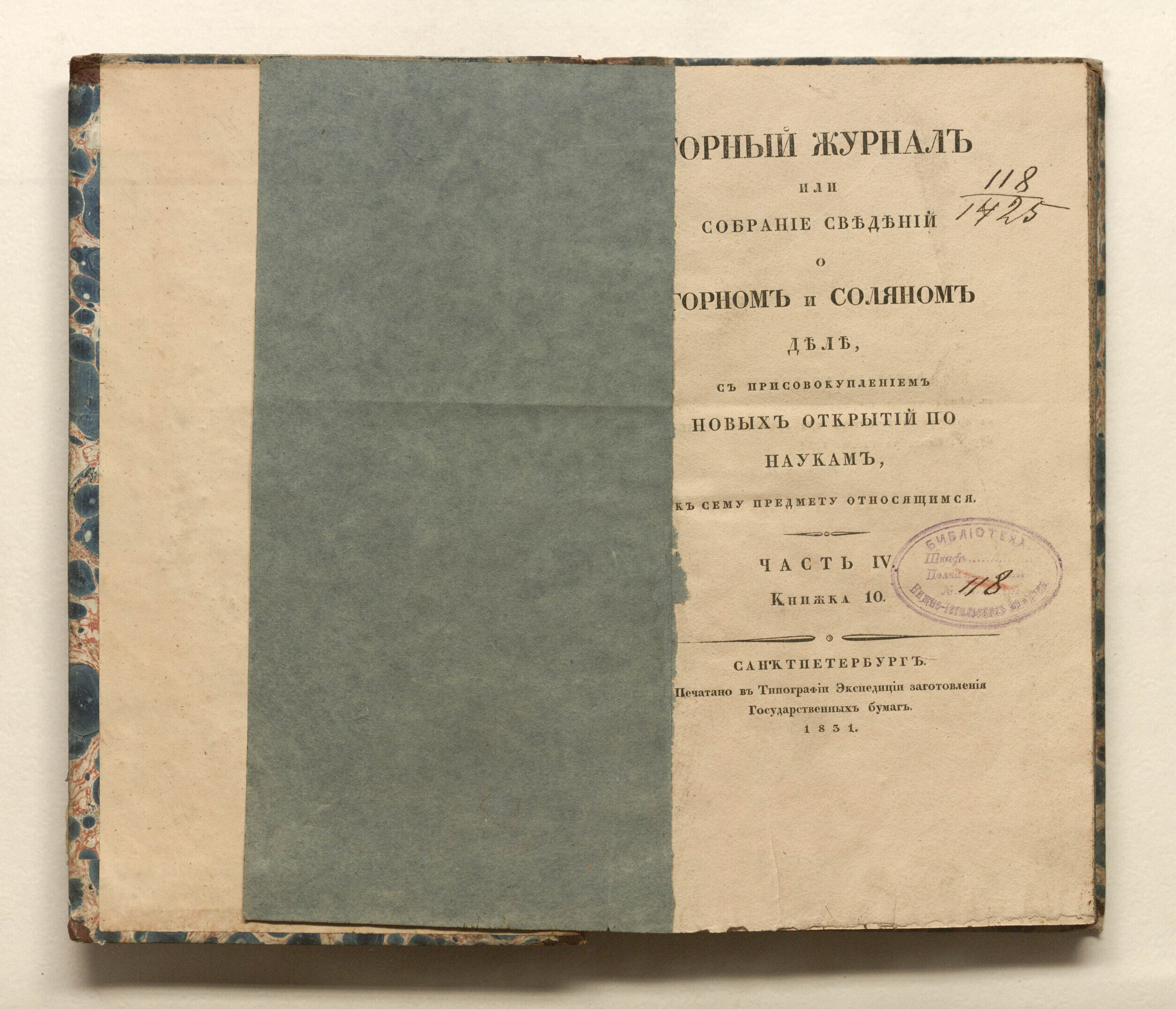 Горный журнал или Собрание сведений о горном и соляном деле, С присовокуплением новых открытий по наукам, к сему предмету относящимся. – Санкт-Петербург : печатано в военной типографии Главнаго штаба его Императорскаго Величества ; в типографии Экспедиции заготовления государственных бумаг, 1825-1918.