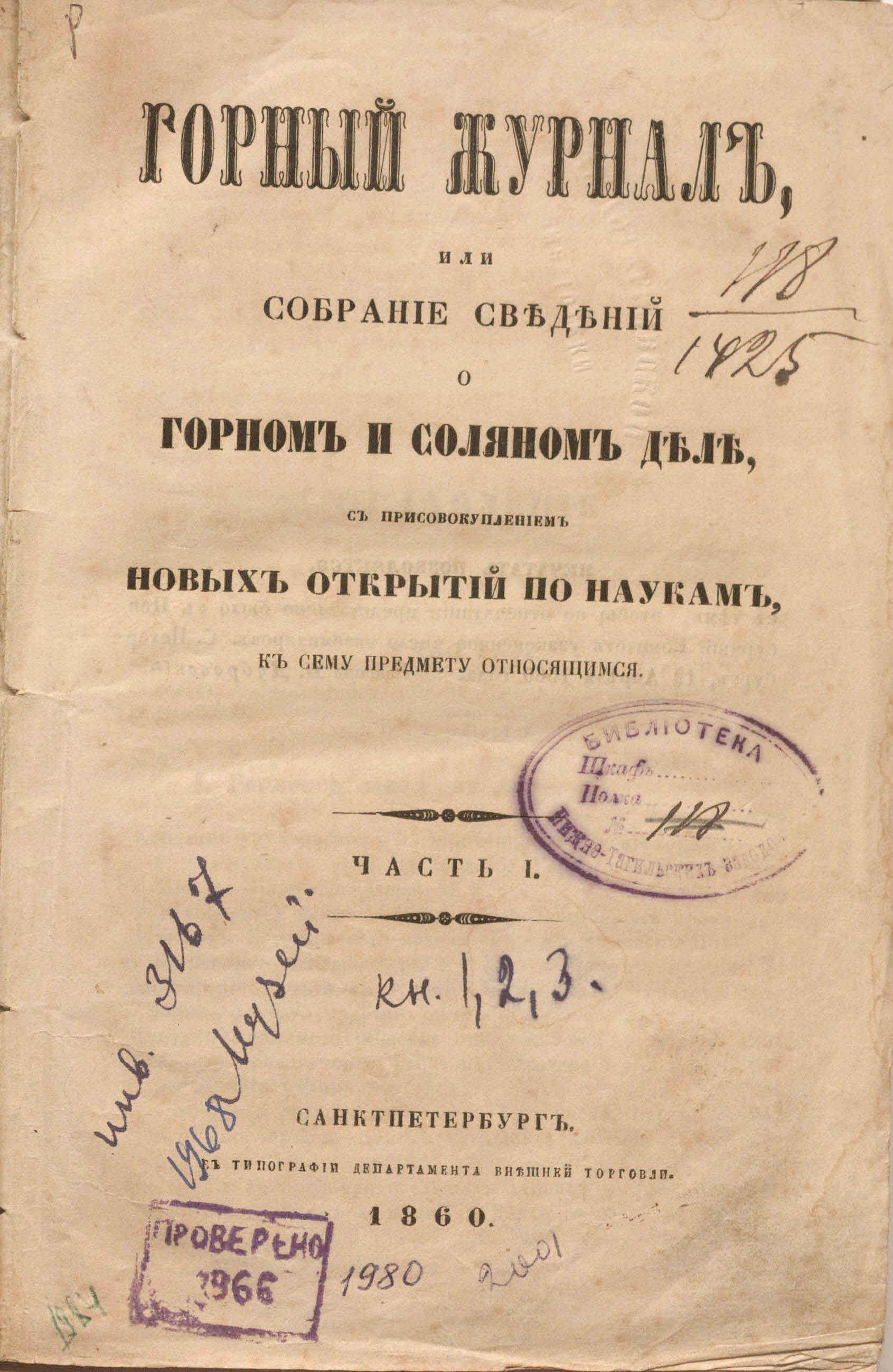 Горный журнал или Собрание сведений о горном и соляном деле, С присовокуплением новых открытий по наукам, к сему предмету относящимся. – Санкт-Петербург : печатано в Военной типографии Главнаго штаба его императорскаго величества ; в типографии Экспедиции заготовления государственных бумаг ; в типографии Карла Крайя ; в типографии императорской академии наук, 1825 - 1918.