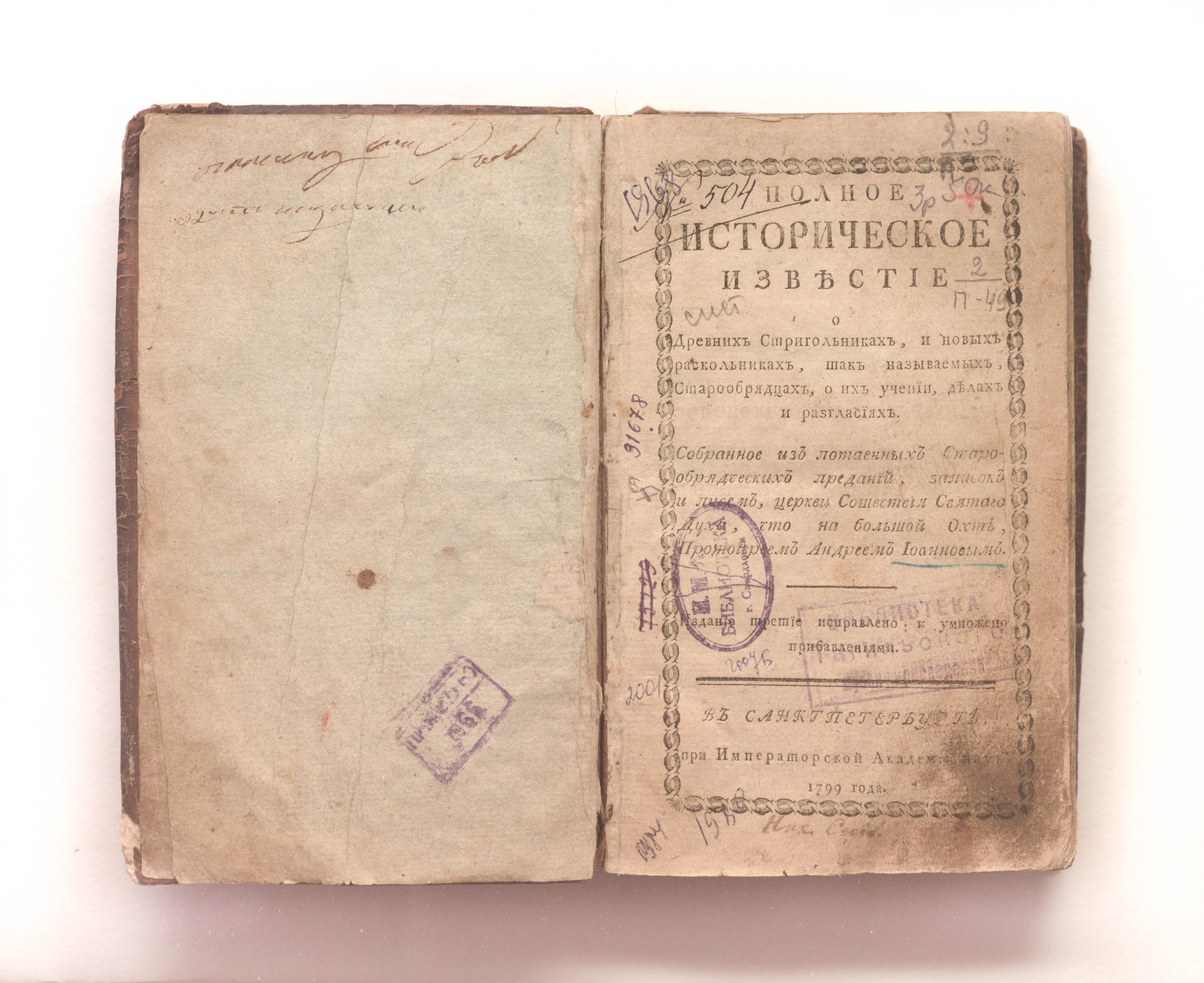 Журавлев, Андрей Иванович (1751-1813). Полное историческое известие о древних стригольниках и новых раскольниках, так называемых старообрядцах, о их учении, делах и разгласиях /собранное из потаенных старообрядческих преданий, записок и писем, Церкви сошествия святого духа, что на Большой Охте протоиереем Андреем Иоанновым. — 3-е изд. — Санкт-Петербург : при Императорской Академии наук, 1799. — III,434 с. ; 20х12,5 см.