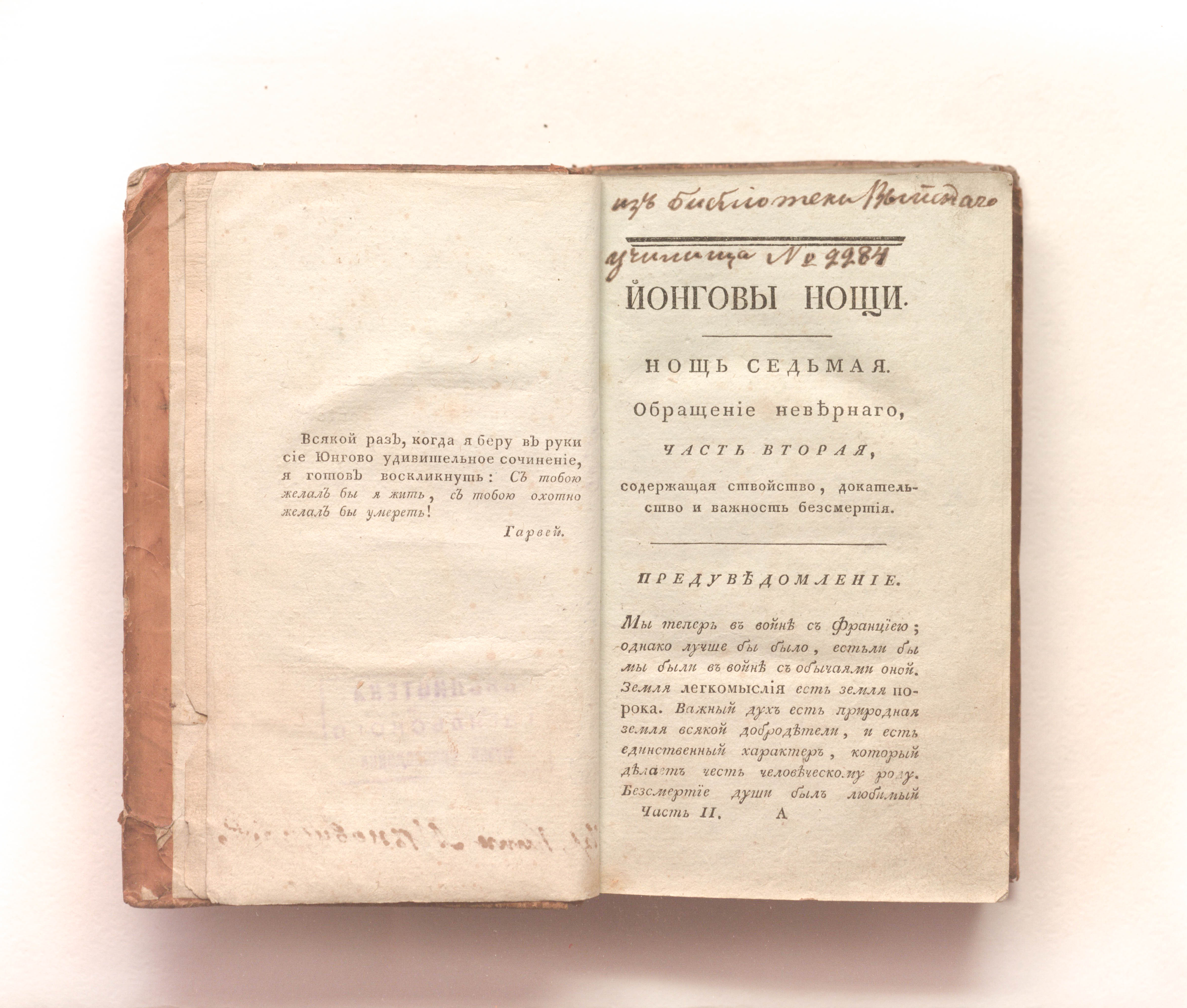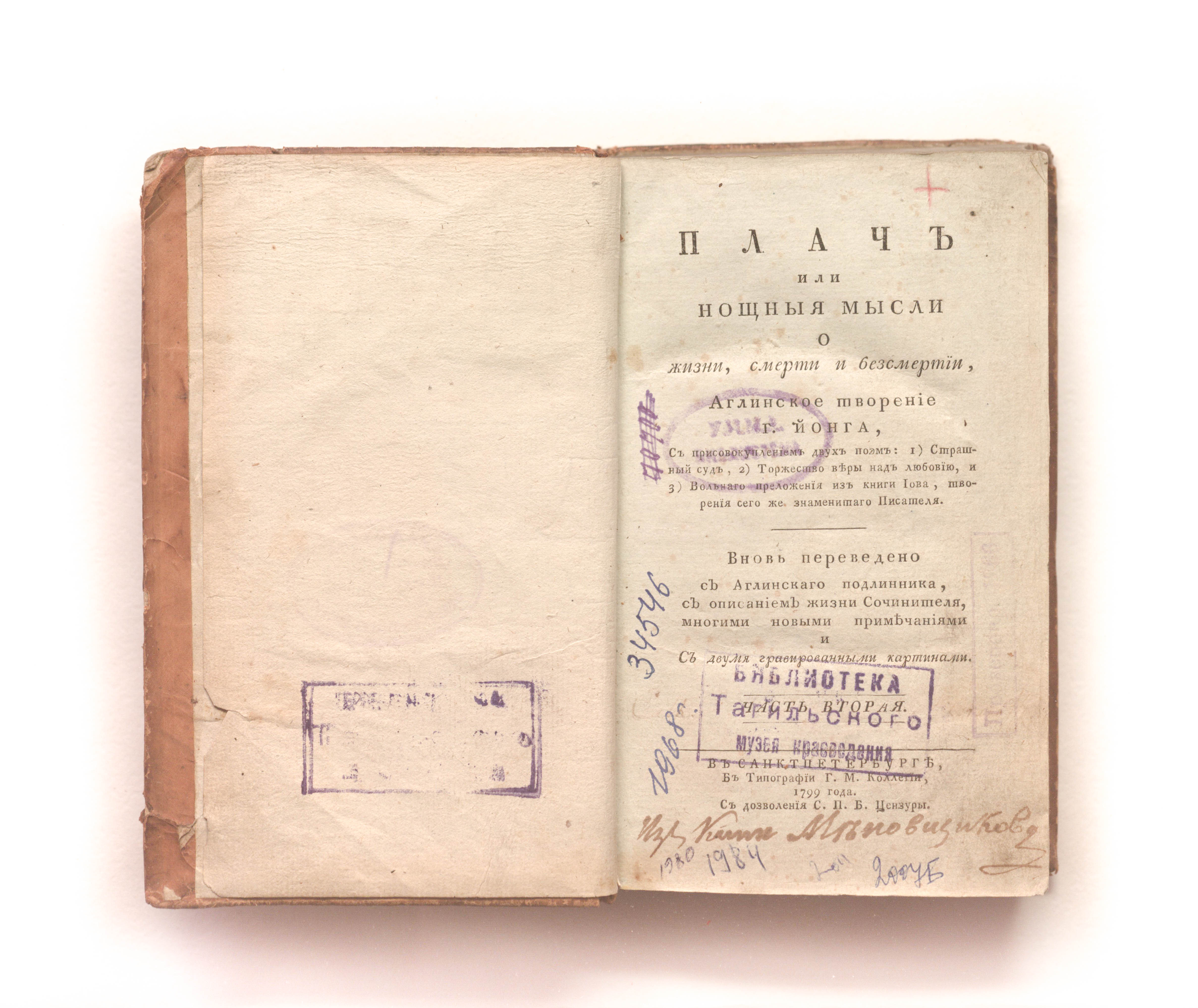 Юнг, Эдуард (1683-1765). Плач или Нощныя мысли о жизни, смерти и безсмертии / Аглинское творение г. Йонга, с присовокуплением двух поэм: 1) Страшный суд, 2) Торжество веры над любовию и 3) Вольнаго преложения из книги Иова, творения сего же знаменитаго писателя. ; Вновь переведено с аглинскаго подлинника, ; С описанием жизни сочинителя, многими новыми примечаниями и с двумя гравированными картинами. — Санкт-Петербург : Тип. Г. М. Коллегии, 1799. — Ч. 2. — 1-144, 147-503 с. ; 18х11 см.