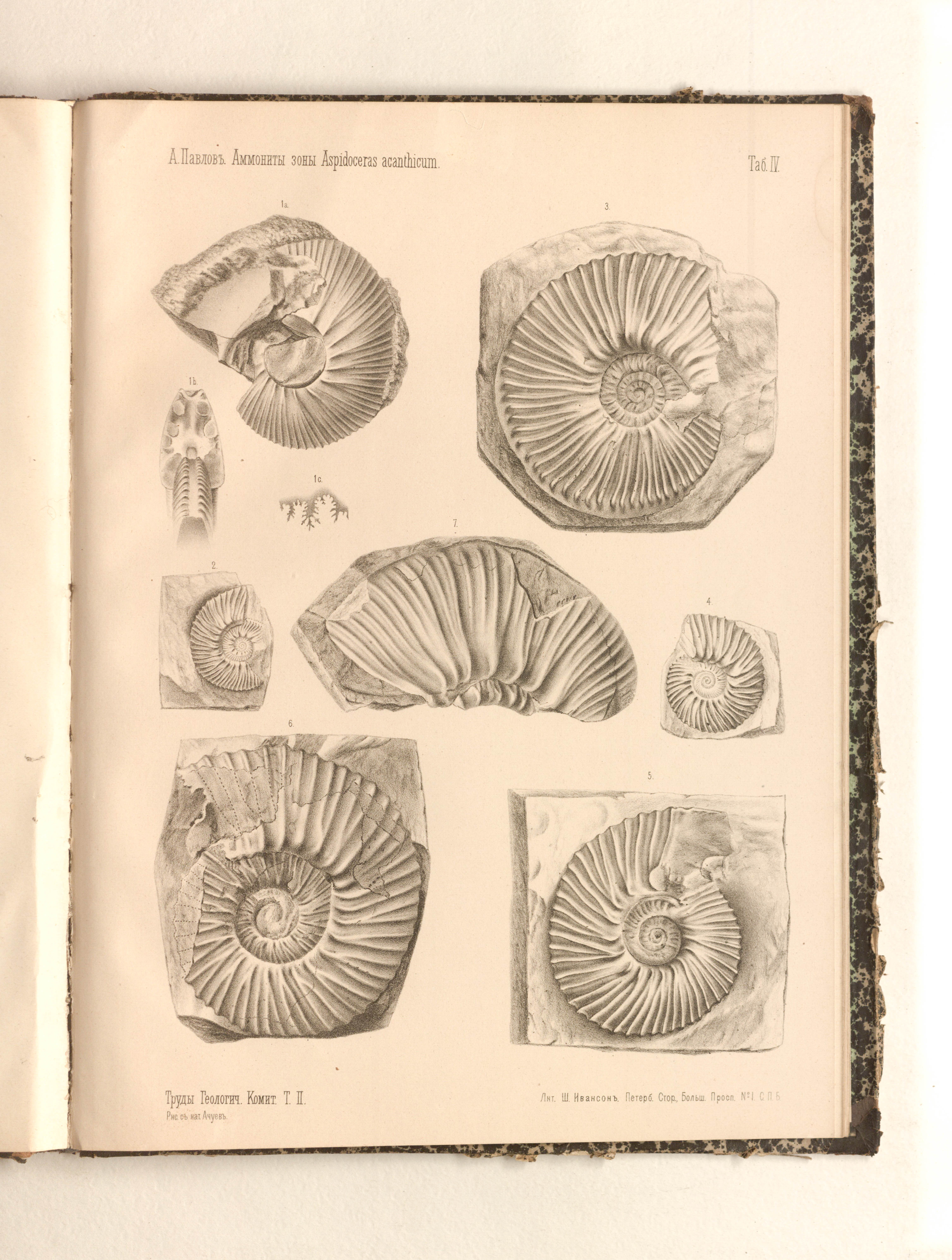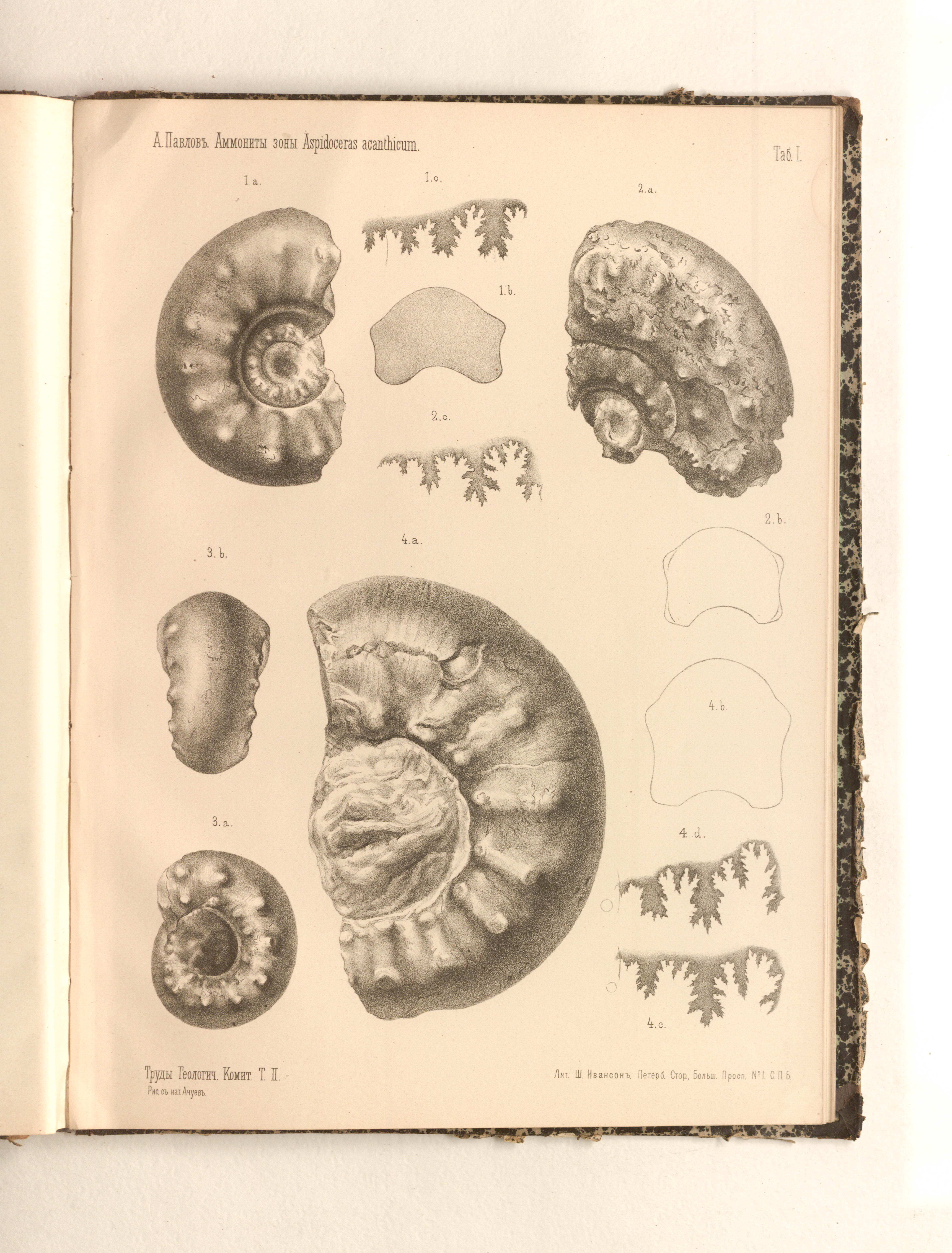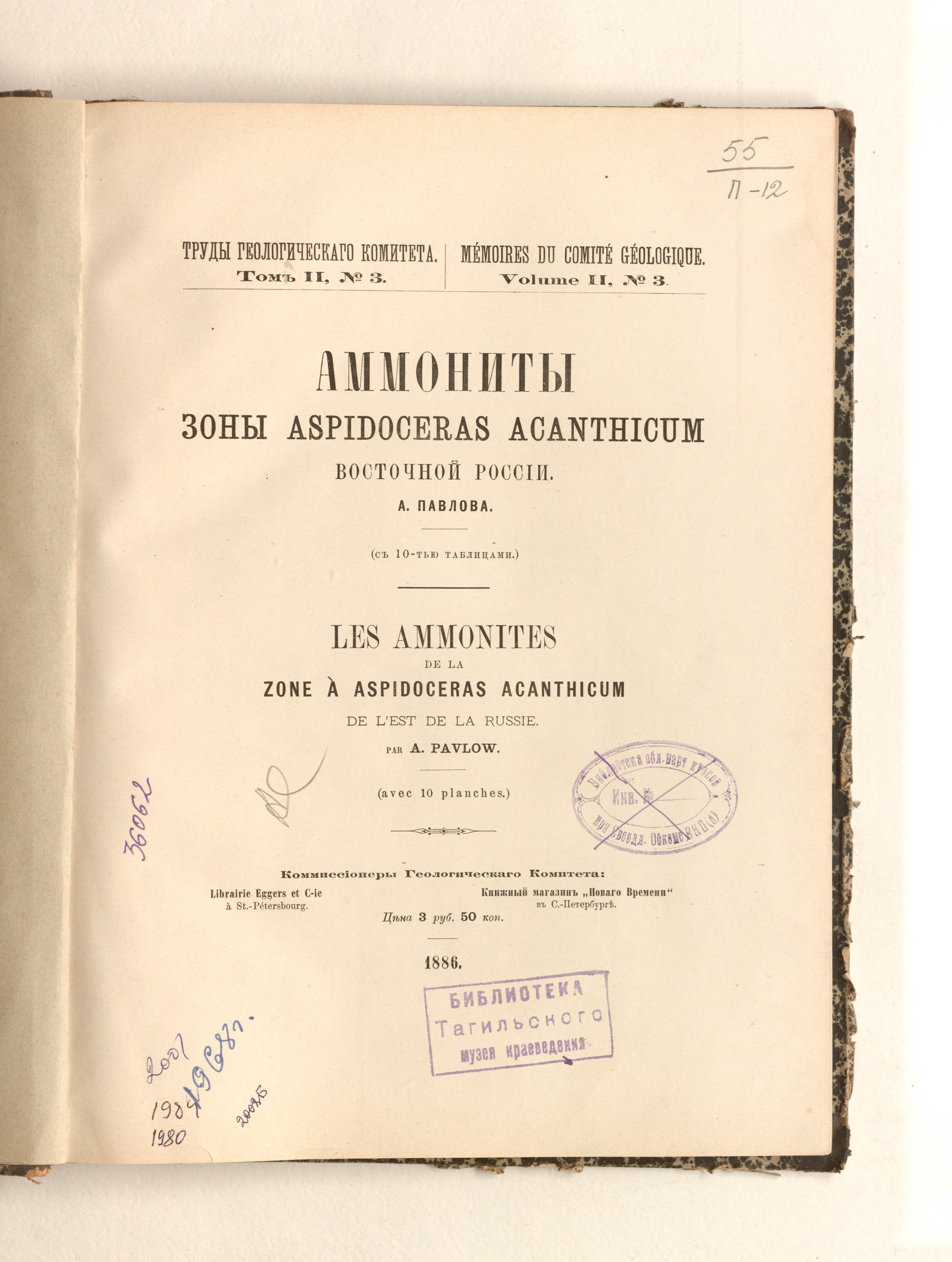 Павлов, Алексей Петрович (1854-1929). Аммониты зоны Aspidoceras acanthicum Восточной России / А. П. Павлов. — Санкт-Петербург : тип. А. Якобсона, 1886. — [4], 91 с. : 10 л. ил. — (Труды Геологического комитета ; т. 2, № 3). ; 36,5х24 см.