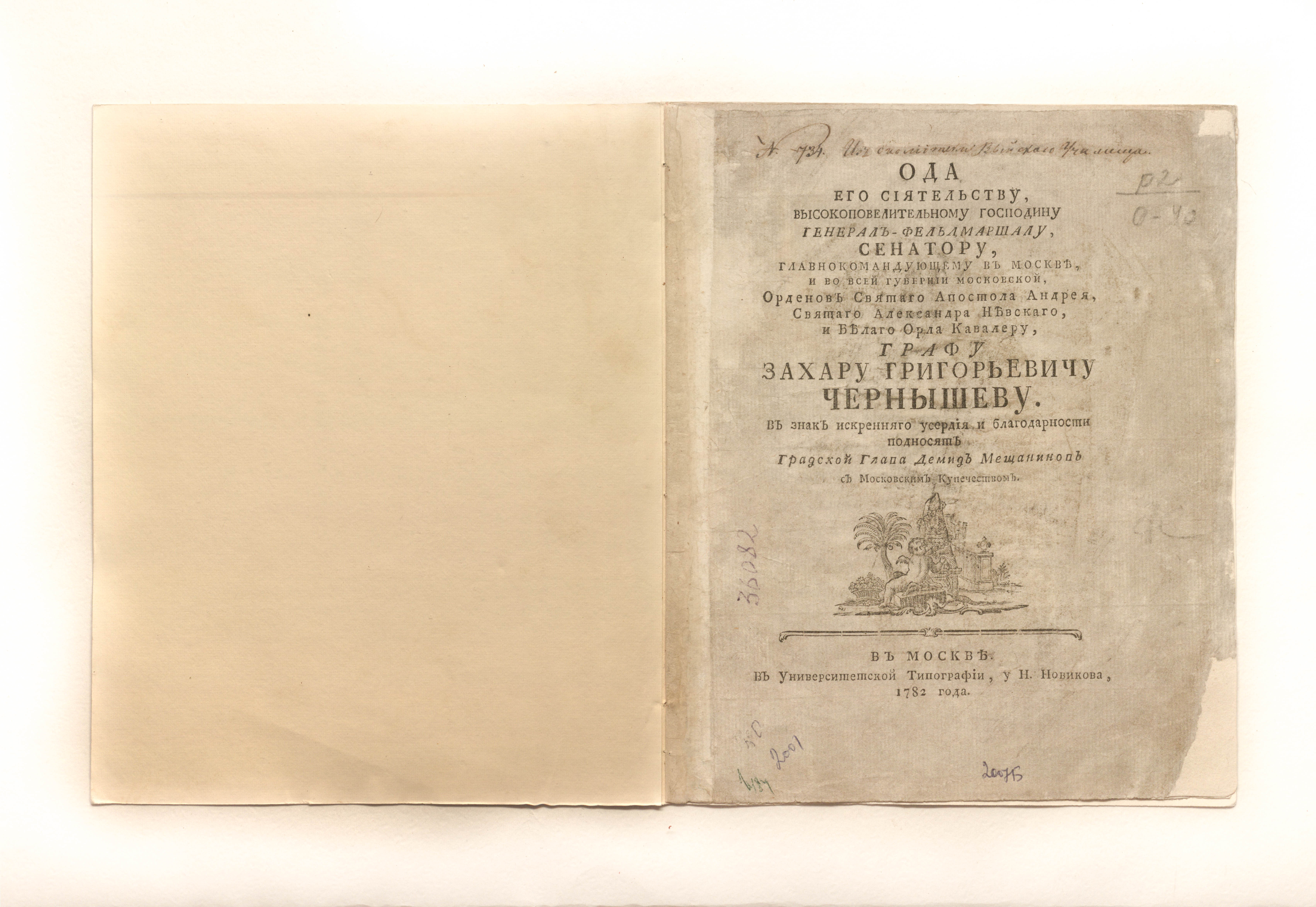 Ода его сиятельству, высокоповелительному господину генерал-фельдмаршалу, сенатору, главнокомандующему в Москве, и во всей губернии Московской, орденов святаго апостола Андрея, святаго Александра Невскаго, и Белаго Орла кавалеру, графу Захару Григорьевичу Чернышеву / в знак искренняго усердия и благодарности подносят градский глава Демид Мещанинов с московским купечеством. — Москва : В Университетской типографии, у Н. Новикова, 1782. — 10 с. ; 23,5х19,5 см.