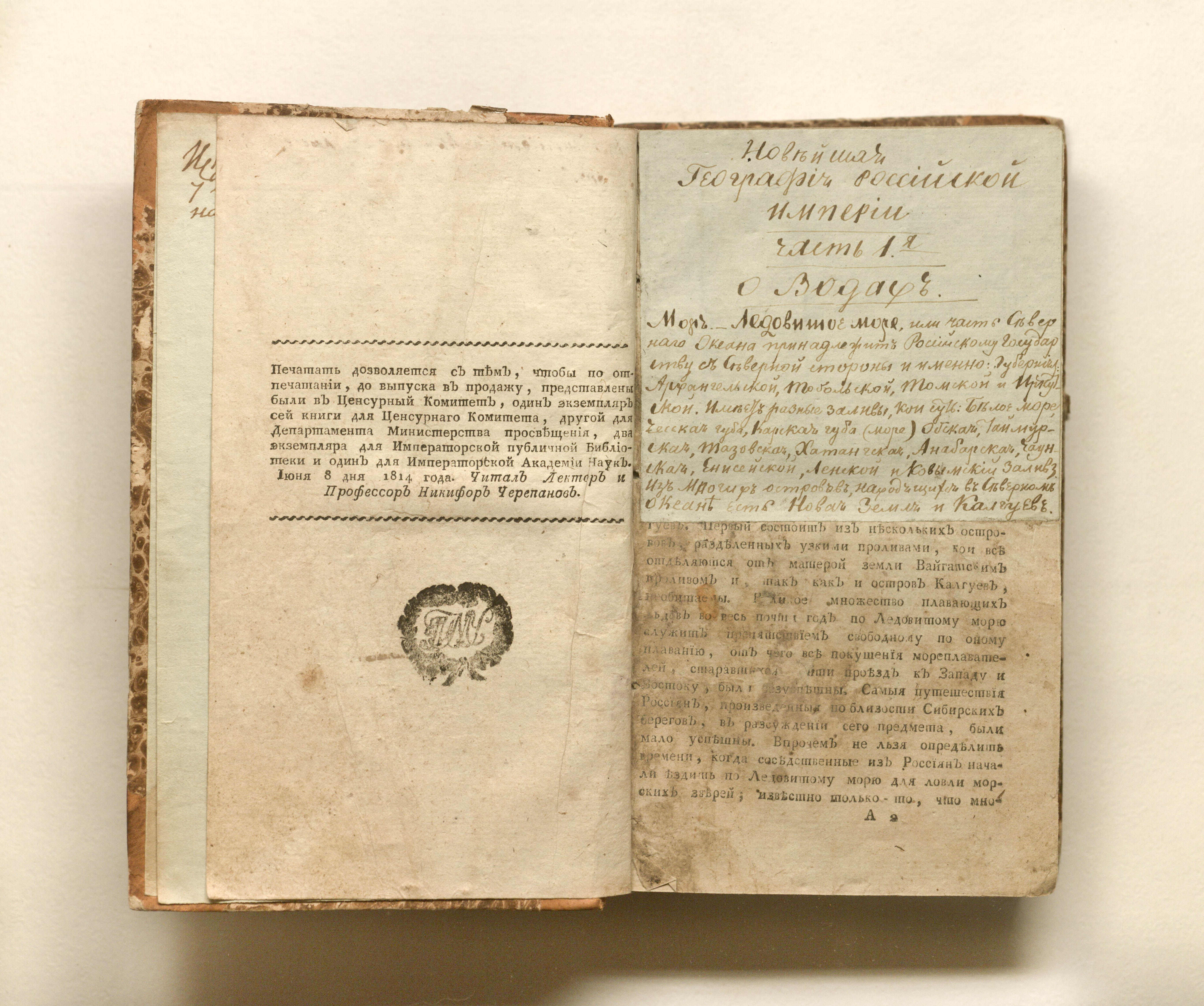 Зябловский, Евдоким Филиппович (1764-1846). Новейшая география Российской империи : сочиненная по нынешнему ея разделению, в которой описаны пределы государства и его пространство; моря, озера, реки, водяное сообщение; горы, климат и качество земли; естественныя произведения из всех трех царств природы; различные обитатели государства, их языки, вера, упражнения, науки и художества, внутренняя и внешняя торговля; разделение на губернии и области, с показанием в каждой числа жителей, их промышленности, рукоделий и фабрик : с прибавлением присоединенных к Российской империи: Царства Польскаго, Княжества Финляндскаго, Бессарабской области и Грузии с приобретенными от Персии в 1813 году землями. —Новое, исправленное и дополненное издание. — Москва : в университетской типографии, 1814. — 3-110, 77, 267 с. ; 21,5х13 см.