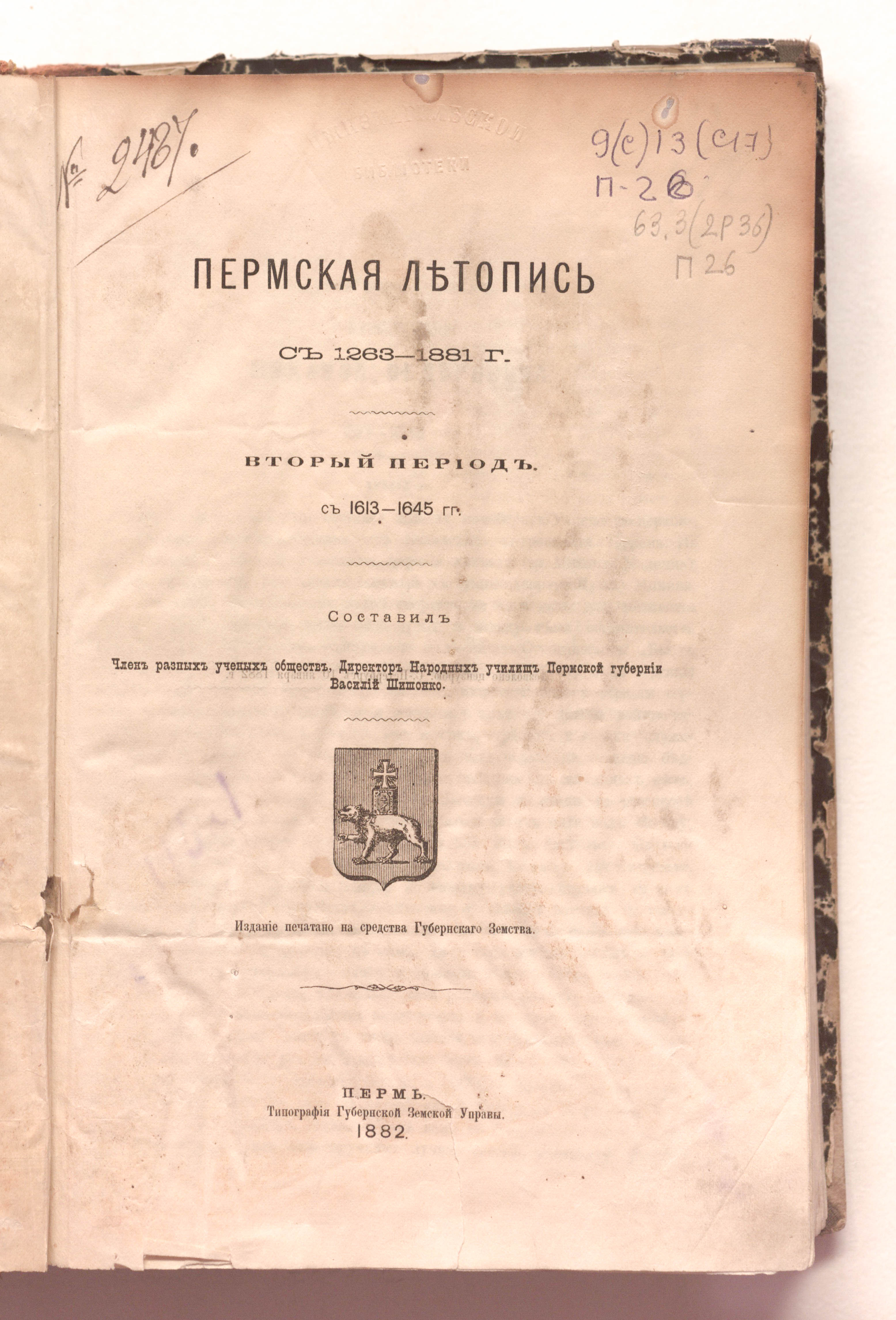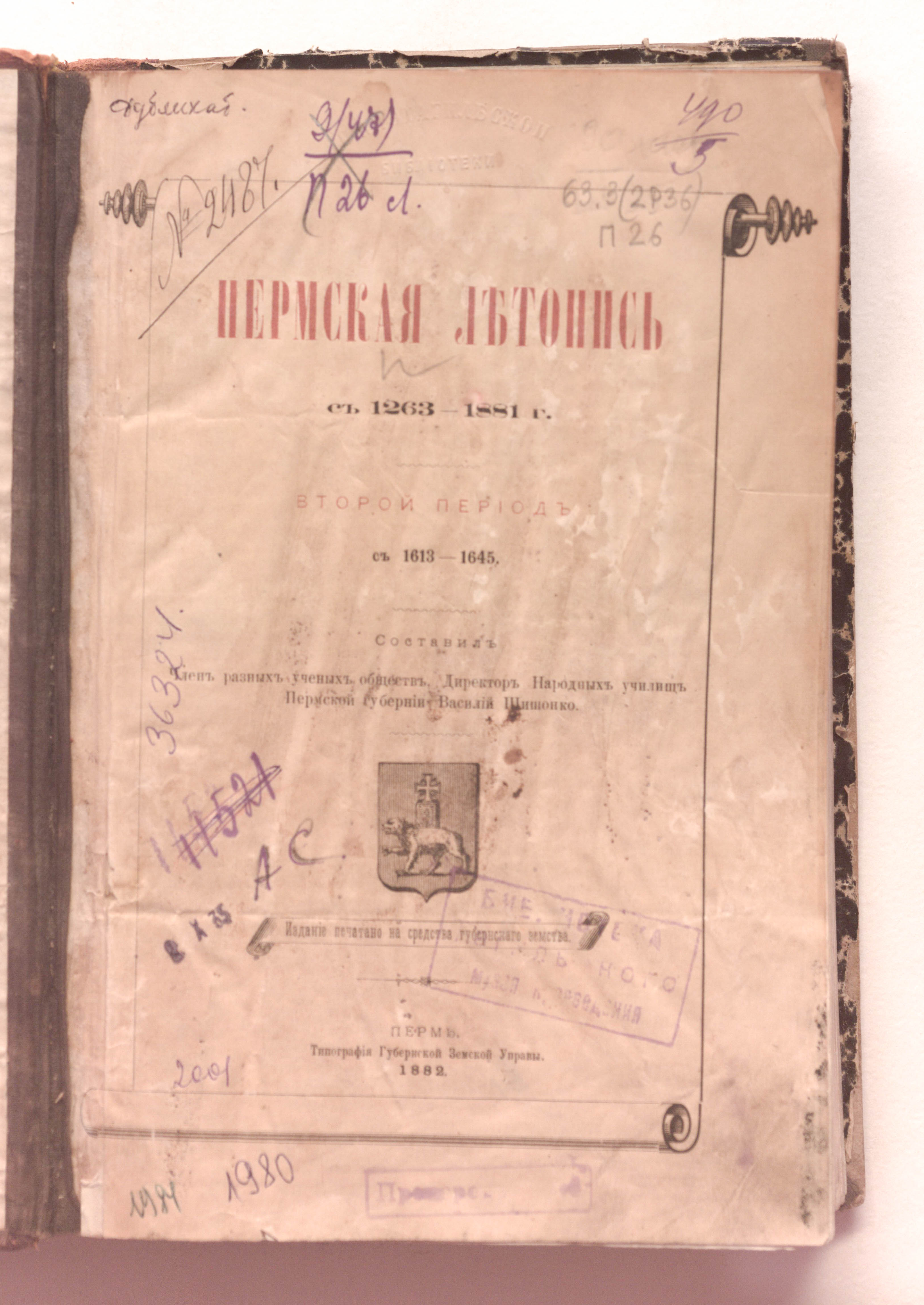 Пермская летопись с 1263- 1881 г. : научное издание / сост. чл. разных учен. о-в, директор нар. училищ Перм. губ. Василий Шишонко ; изд. печ. на средства Губ. земства. – Издание печатано на средства Губернского земства. – Пермь : Типография Губернской Земской управы, 1881 — 1889.