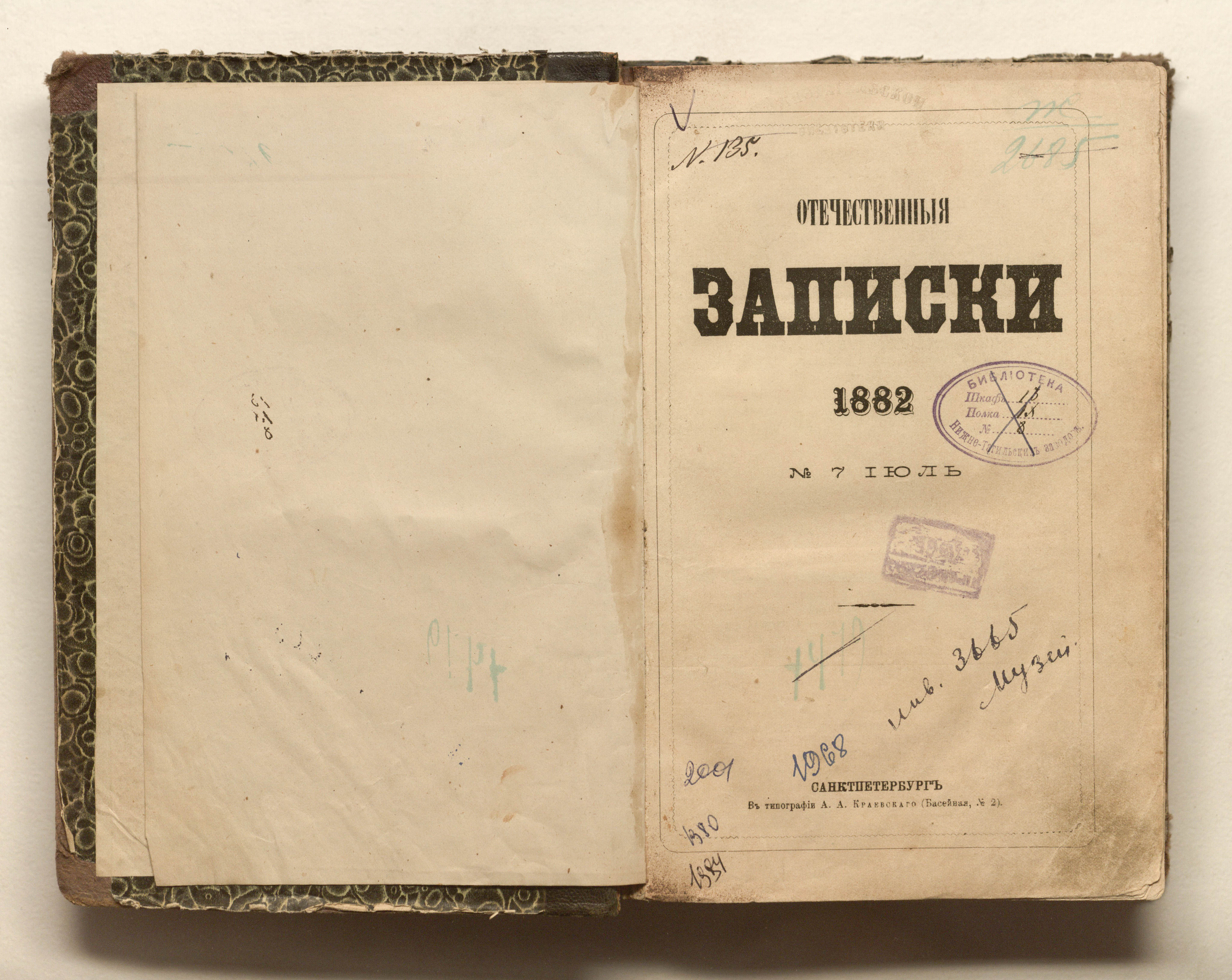Отечественные записки : журнал литературный, политический и ученый. № 7. Июль. — Санкт-Петербург : тип. А. А. Краевского, 1882. — раздельная паг. ; 24х15,5 см.