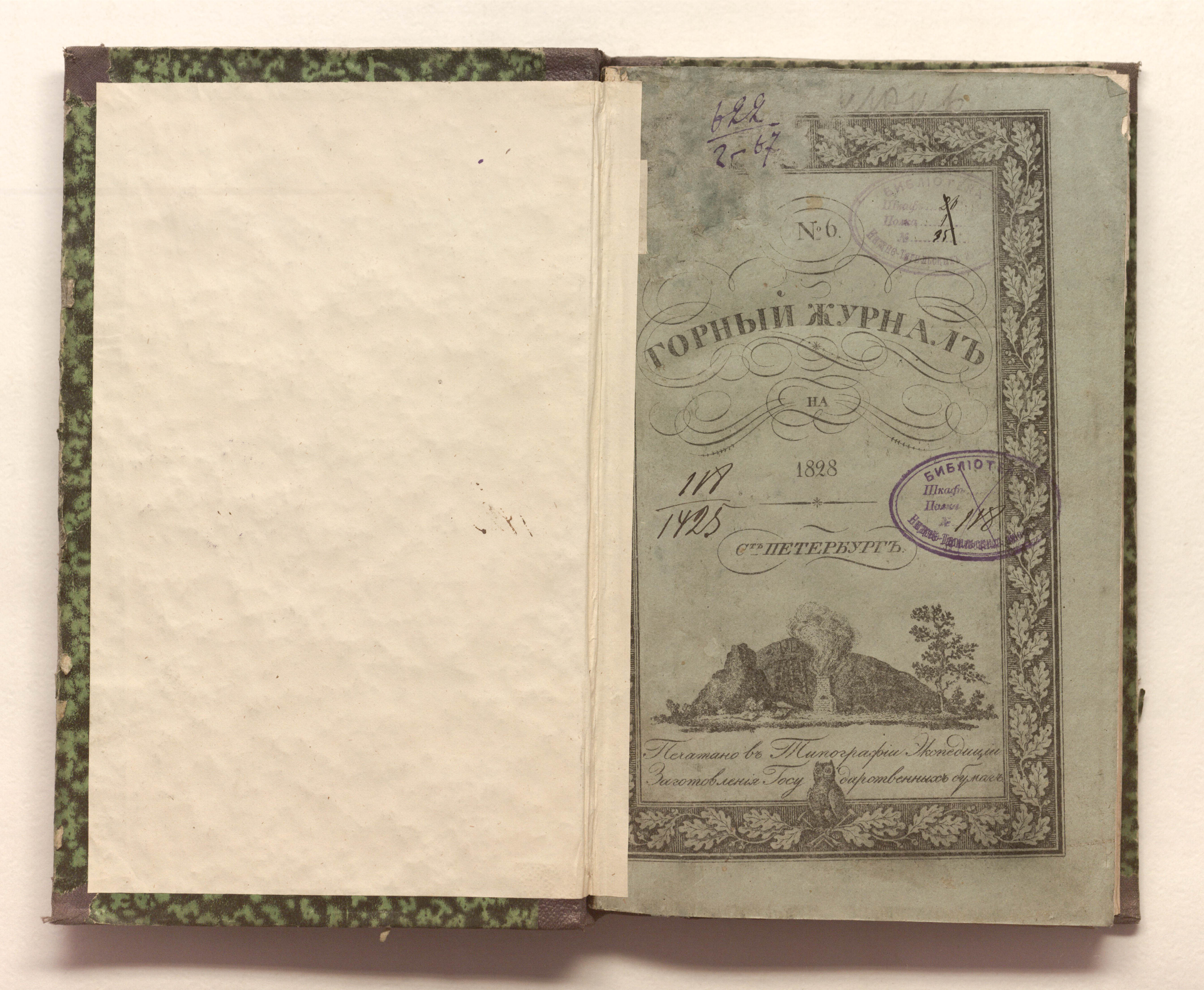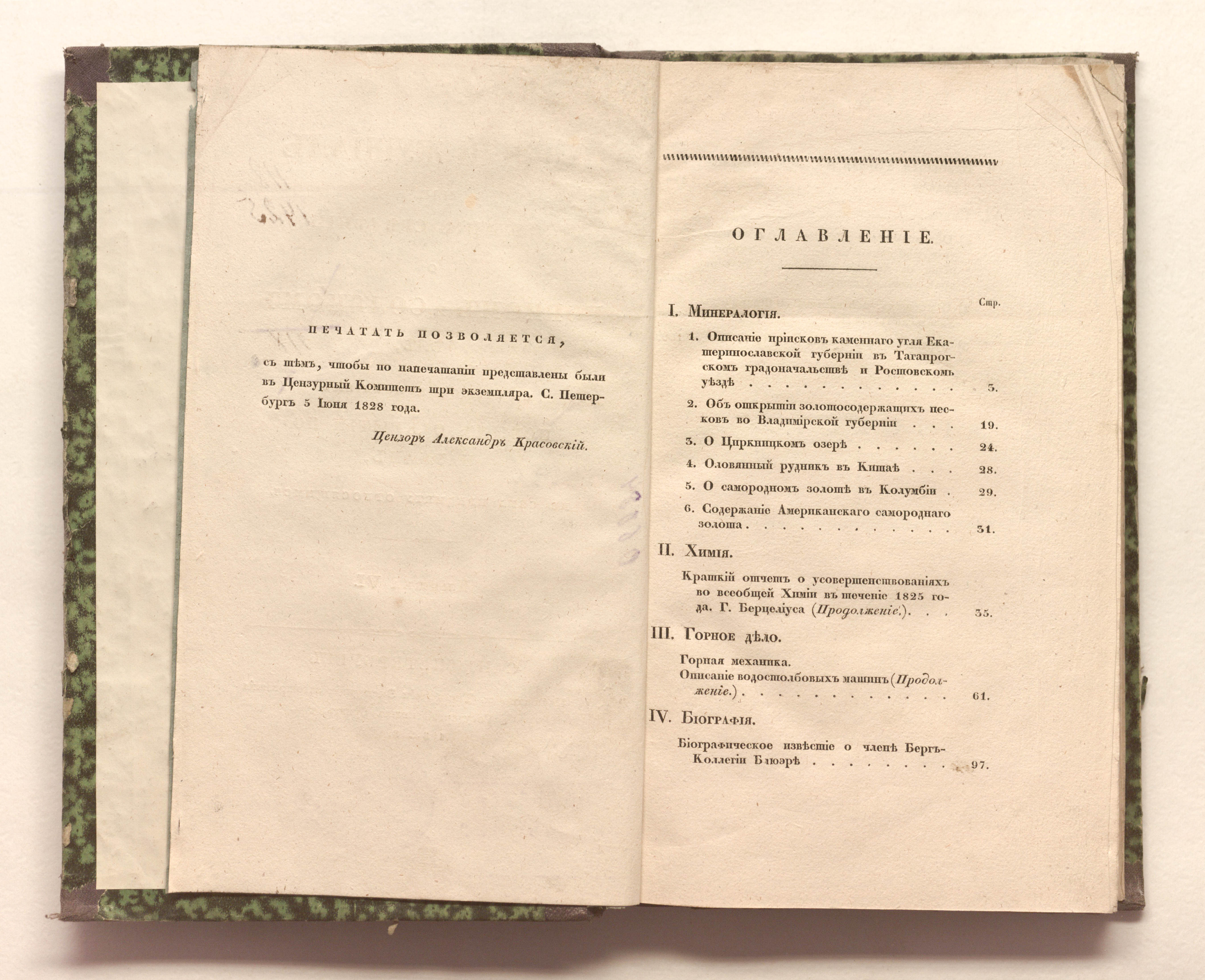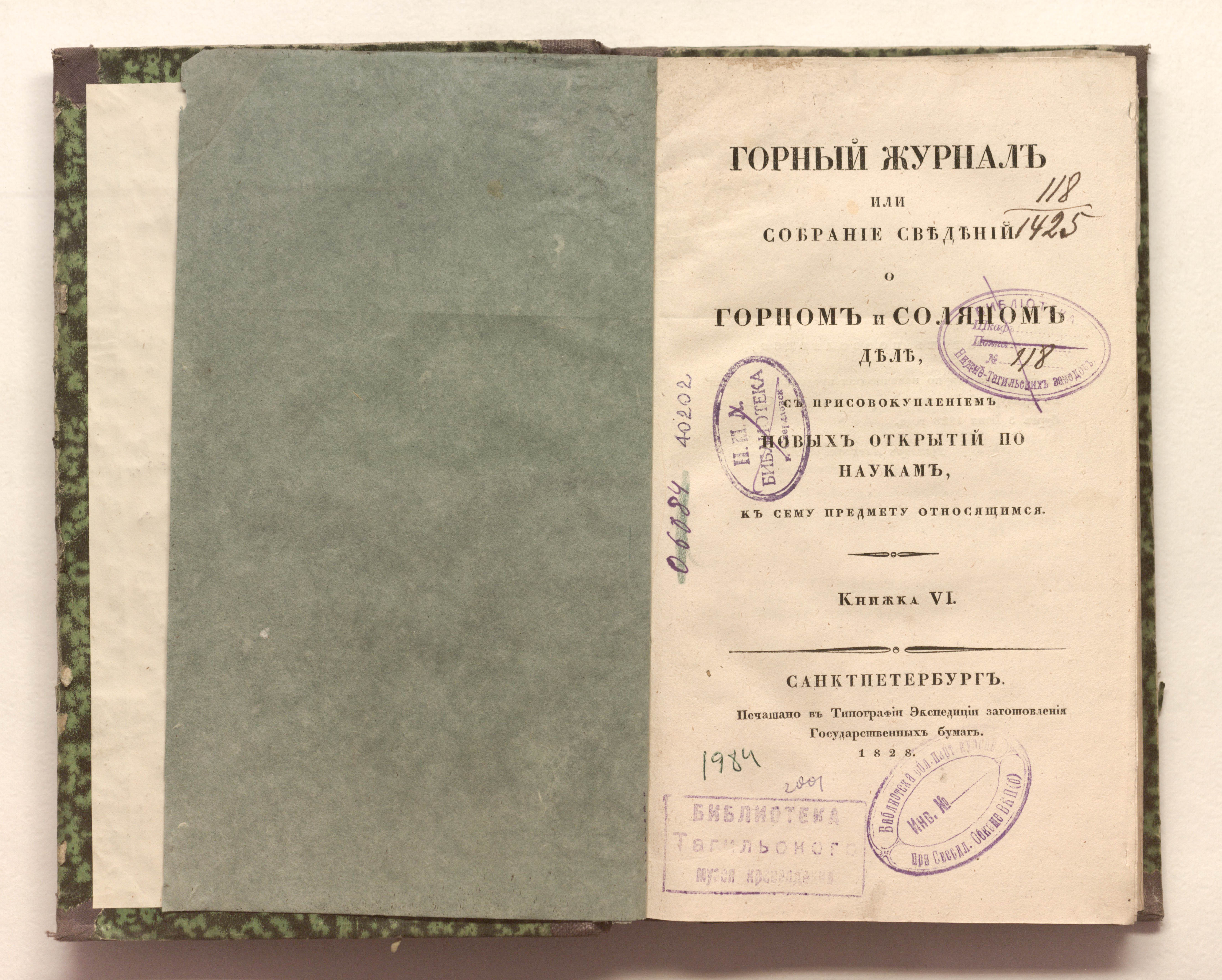 Горный журнал или Собрание сведений о горном и соляном деле, С присовокуплением новых открытий по наукам, к сему предмету относящимся. – Санкт-Петербург : печатано в Военной типографии Главнаго штаба его императорскаго величества ; в типографии Экспедиции заготовления государственных бумаг, 1825–918.