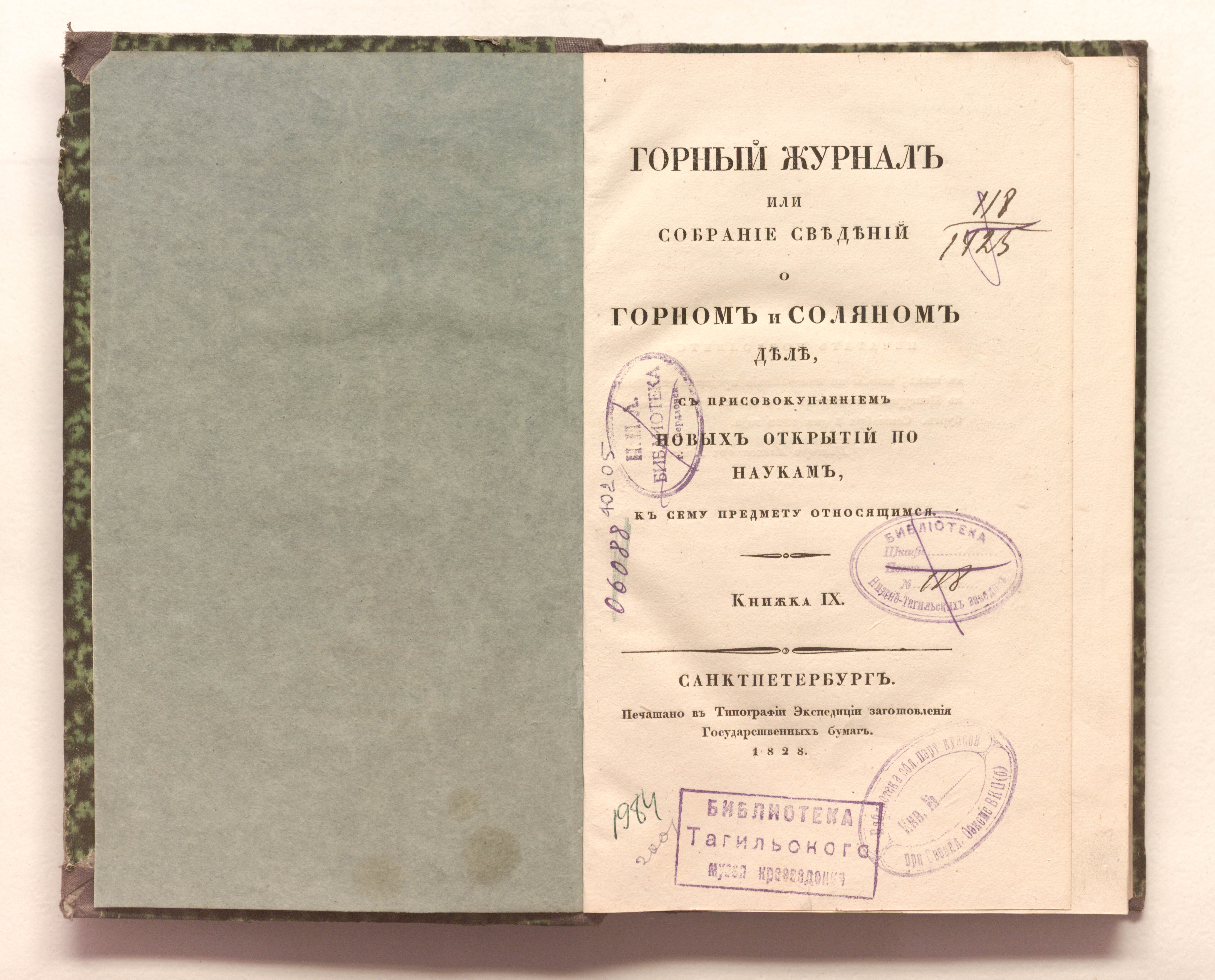 Горный журнал или Собрание сведений о горном и соляном деле, С присовокуплением новых открытий по наукам, к сему предмету относящимся. – Санкт-Петербург : печатано в Военной типографии Главнаго штаба его императорскаго величества ; в типографии Экспедиции заготовления государственных бумаг, 1825–1918.
