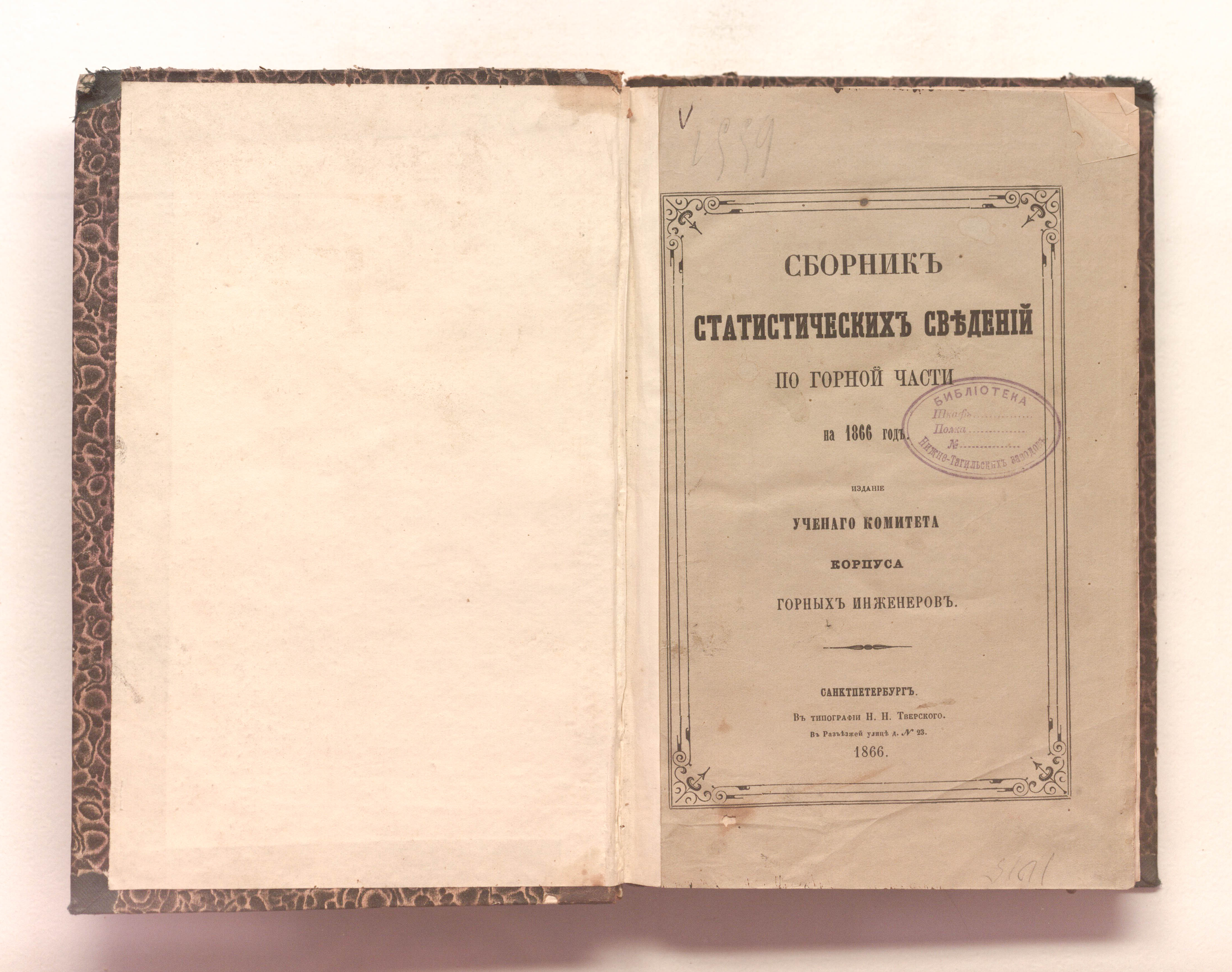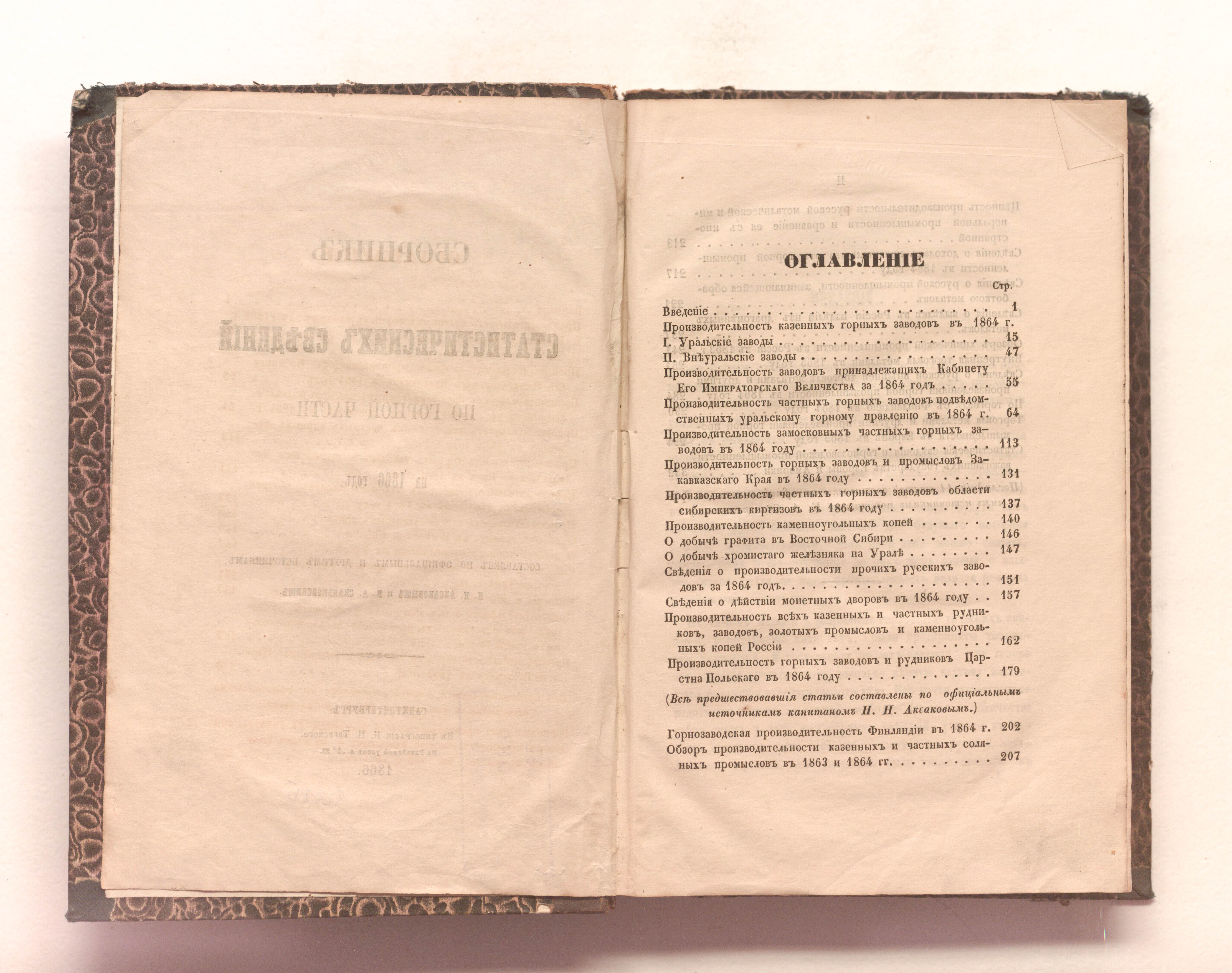 Сборник статистических сведений по горной части на 1866 год / сост.: Н. Н. Аксаков, К. А. Скальковский. — Санкт-Петербург : Учен. ком. Корп. горн. инженеров, 1866. — [1], II, 358 с. : 8 л. табл.. ; 24х15,5 см.