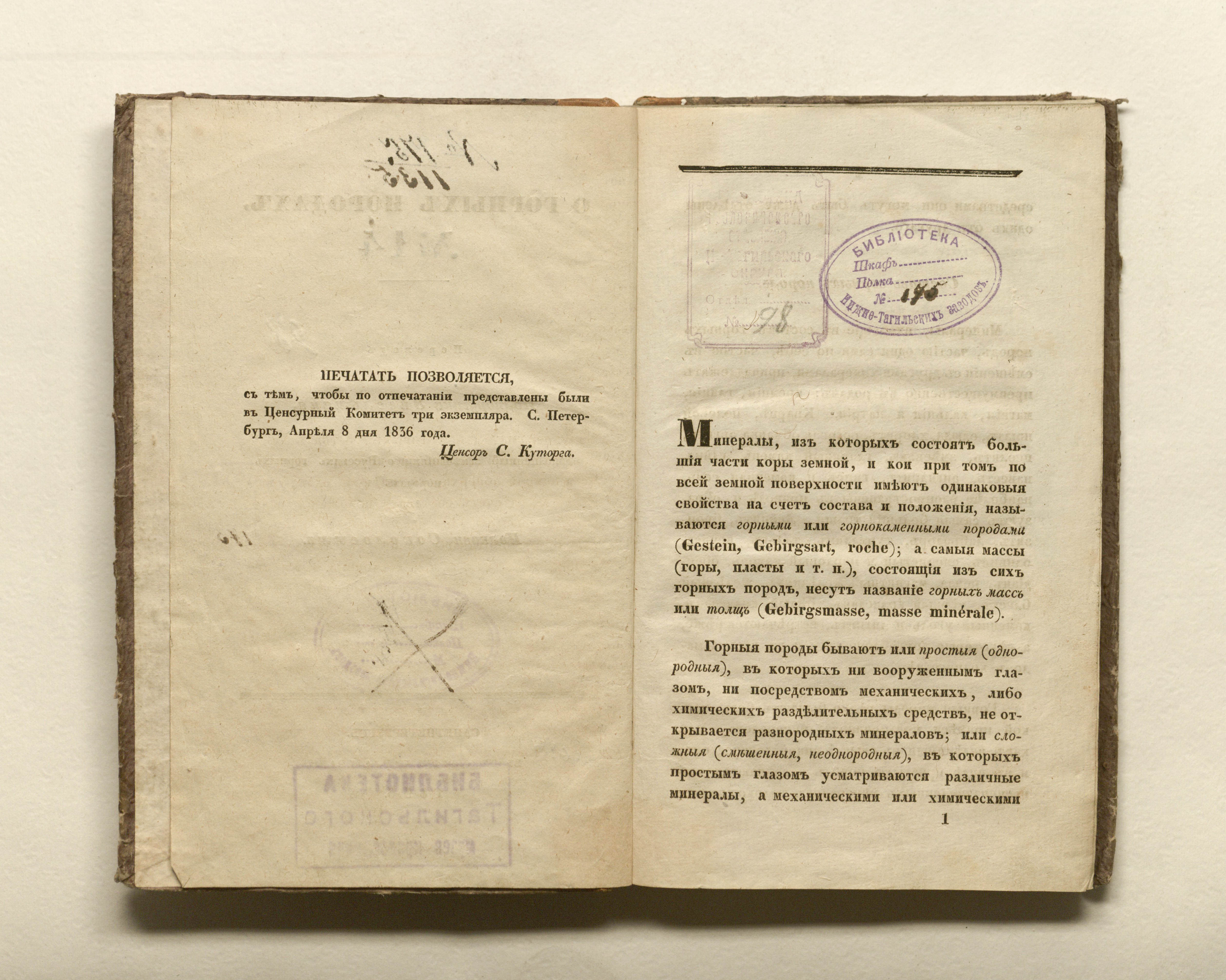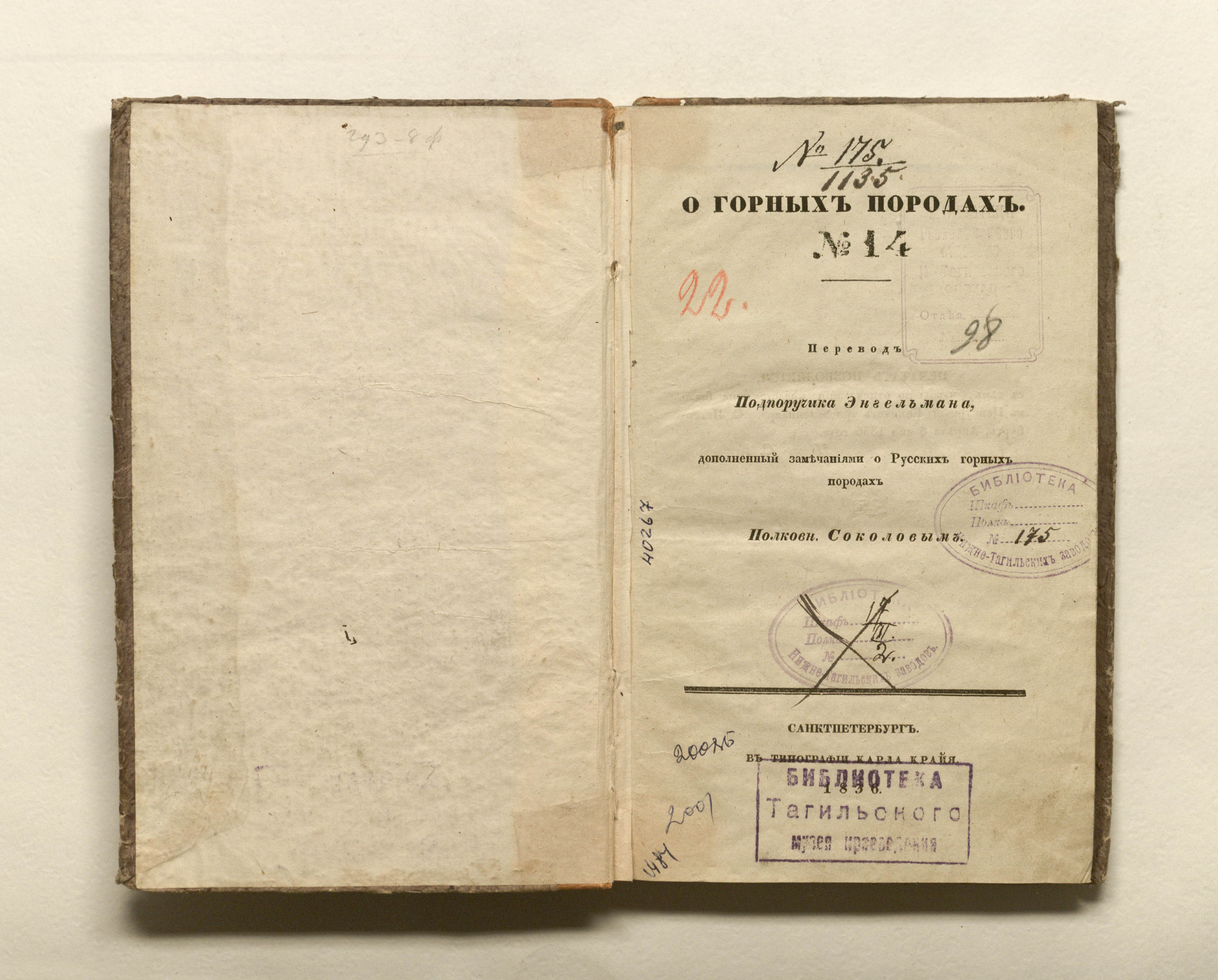 О горных породах. № 14 : пер. Энгельмана, доп. замечаниями о Русских горных породах Соколовым. — Санкт-Петербург : в типографии Карла Крайя, 1836. — 174 с. ; 20х12,5 см.