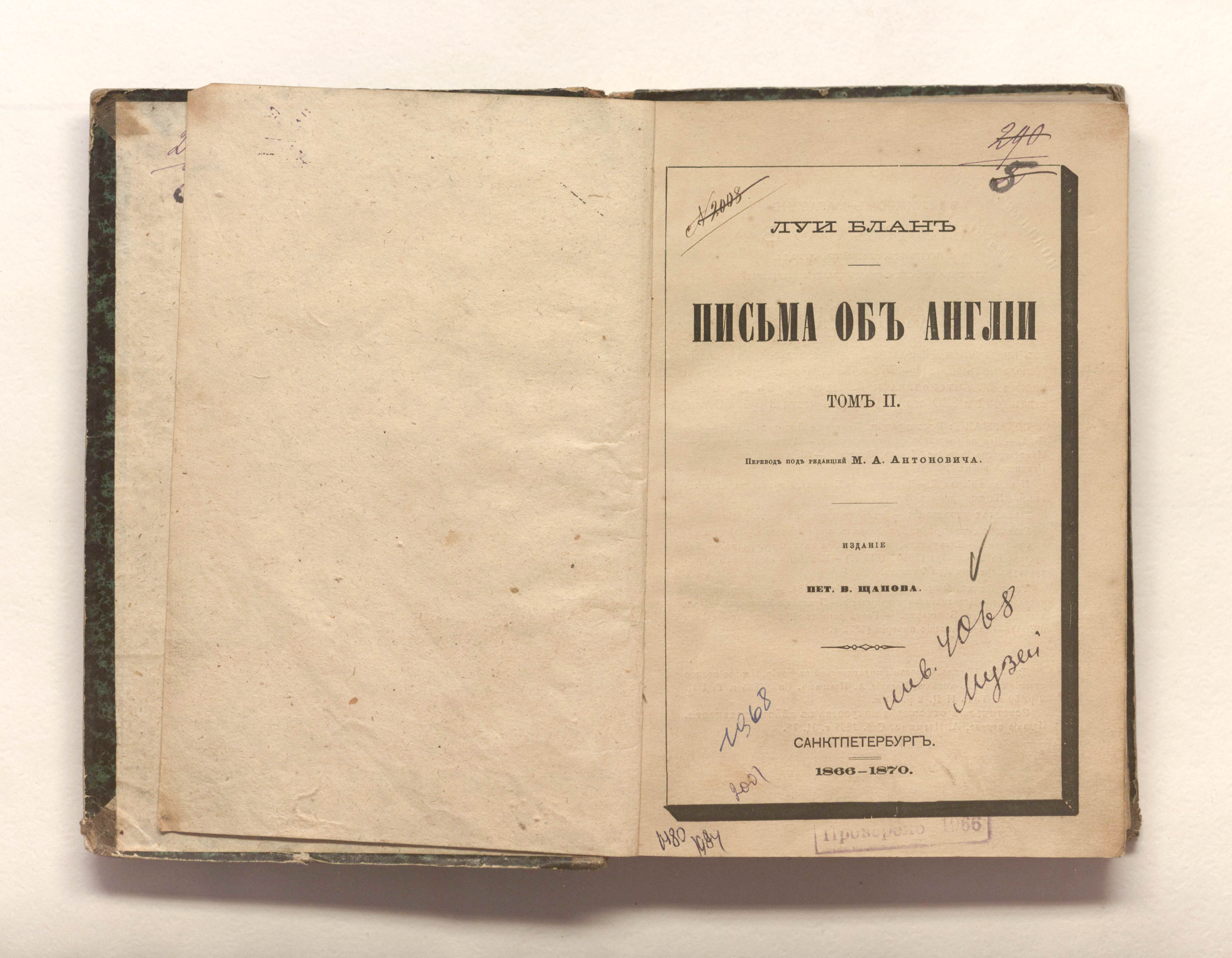 Письма об Англии. Т. 2 / Луи Блан ; Пер. под ред. М. А. Антоновича. — Санкт-Петербург : П.В. Шапов, 1866. — [2], III, 211 с. ; 21х14,5 см.