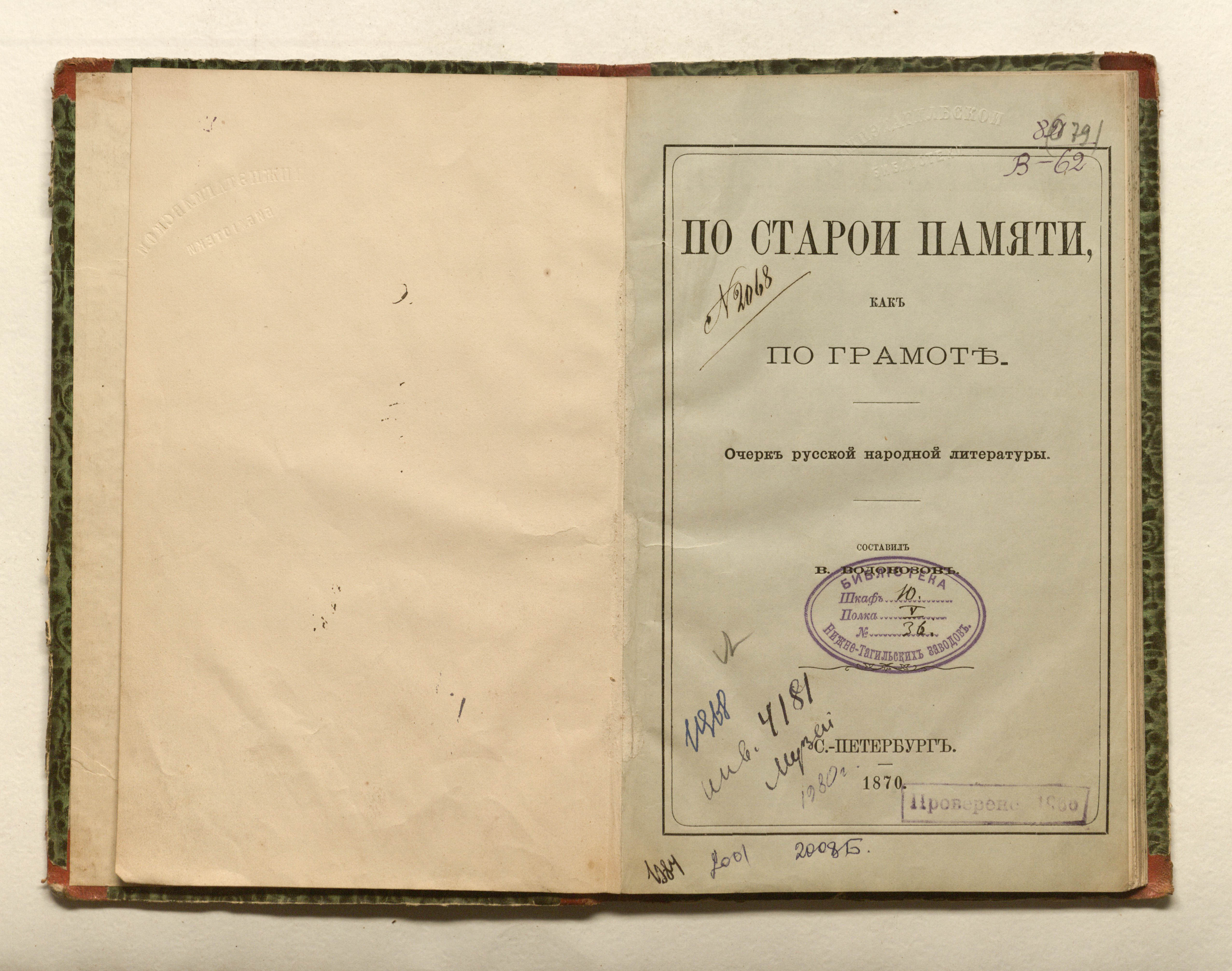 По старой памяти, как по грамоте : очерк русской народной литературы / сост. В. Водовозов. — Санкт-Петербург : тип. Ф. С. Сущинского, 1870. — [2], 104 с.