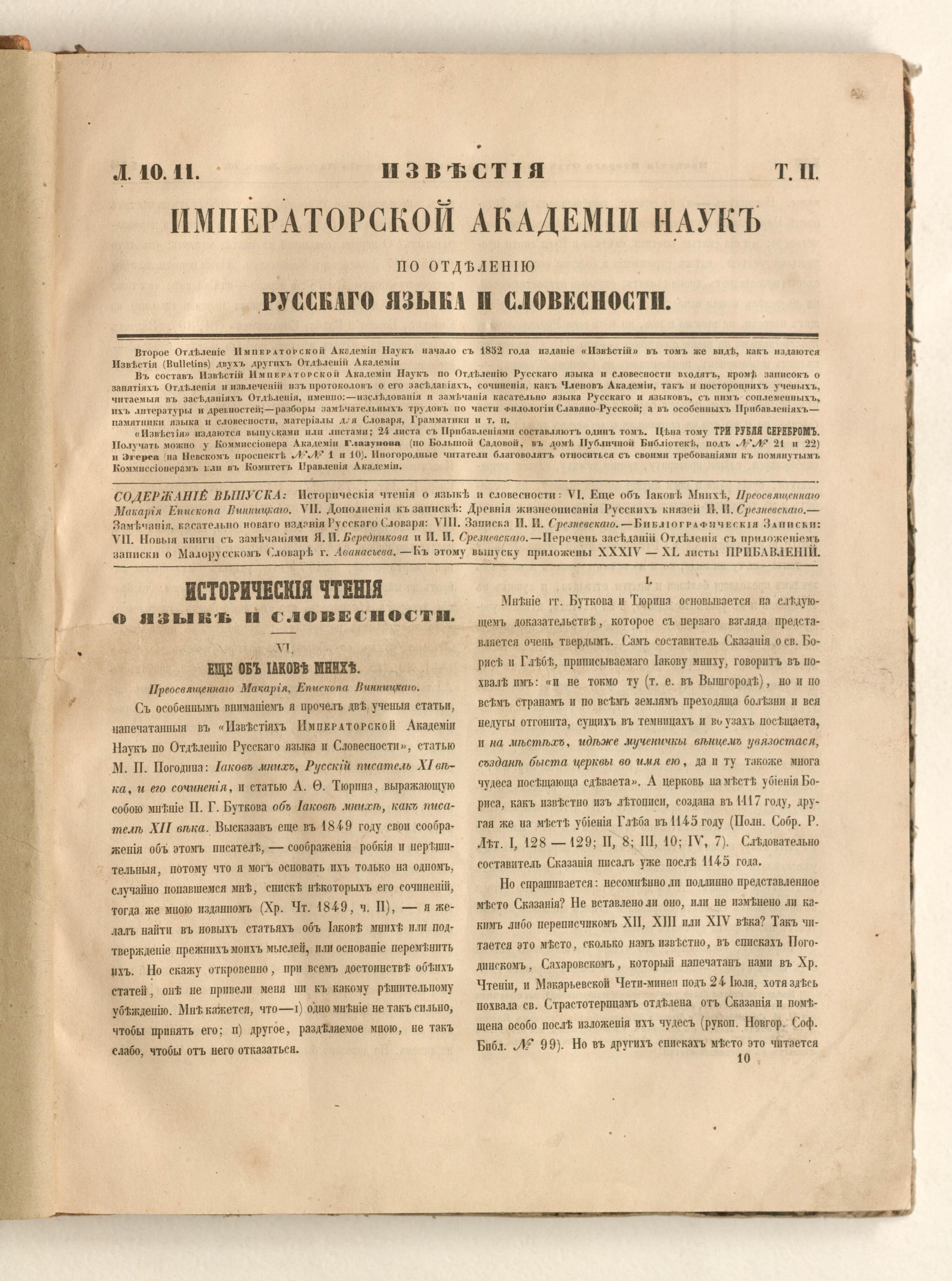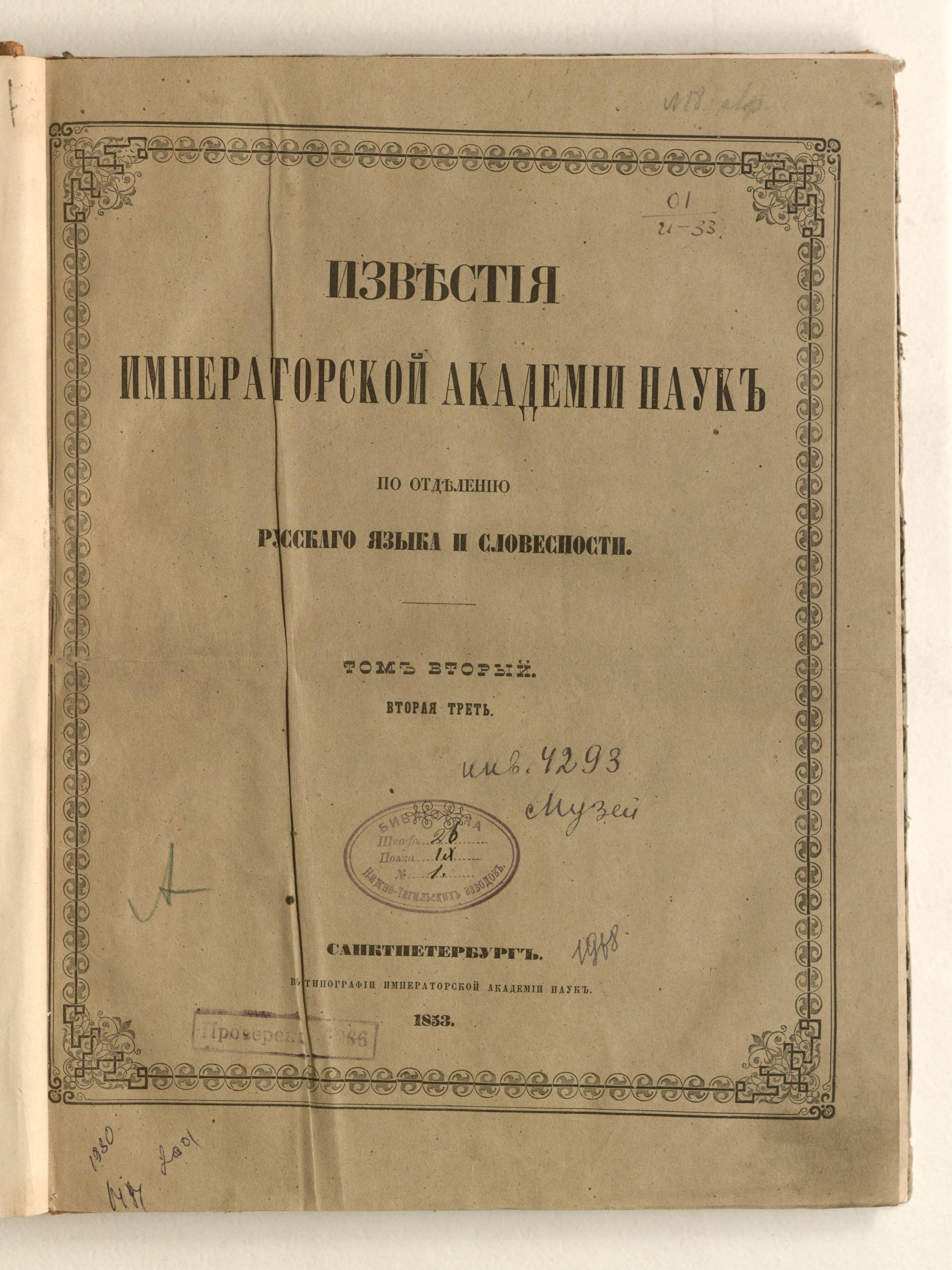 Известия Императорской академии наук по Отделению русского языка и словесности. Т. 2. Вторая треть / ред. И. И. Срезневский. — Санкт-Петербург : Тип. Имп. Акад. наук, 1853. — раздельная пагинация ; 30,5х24 см.
