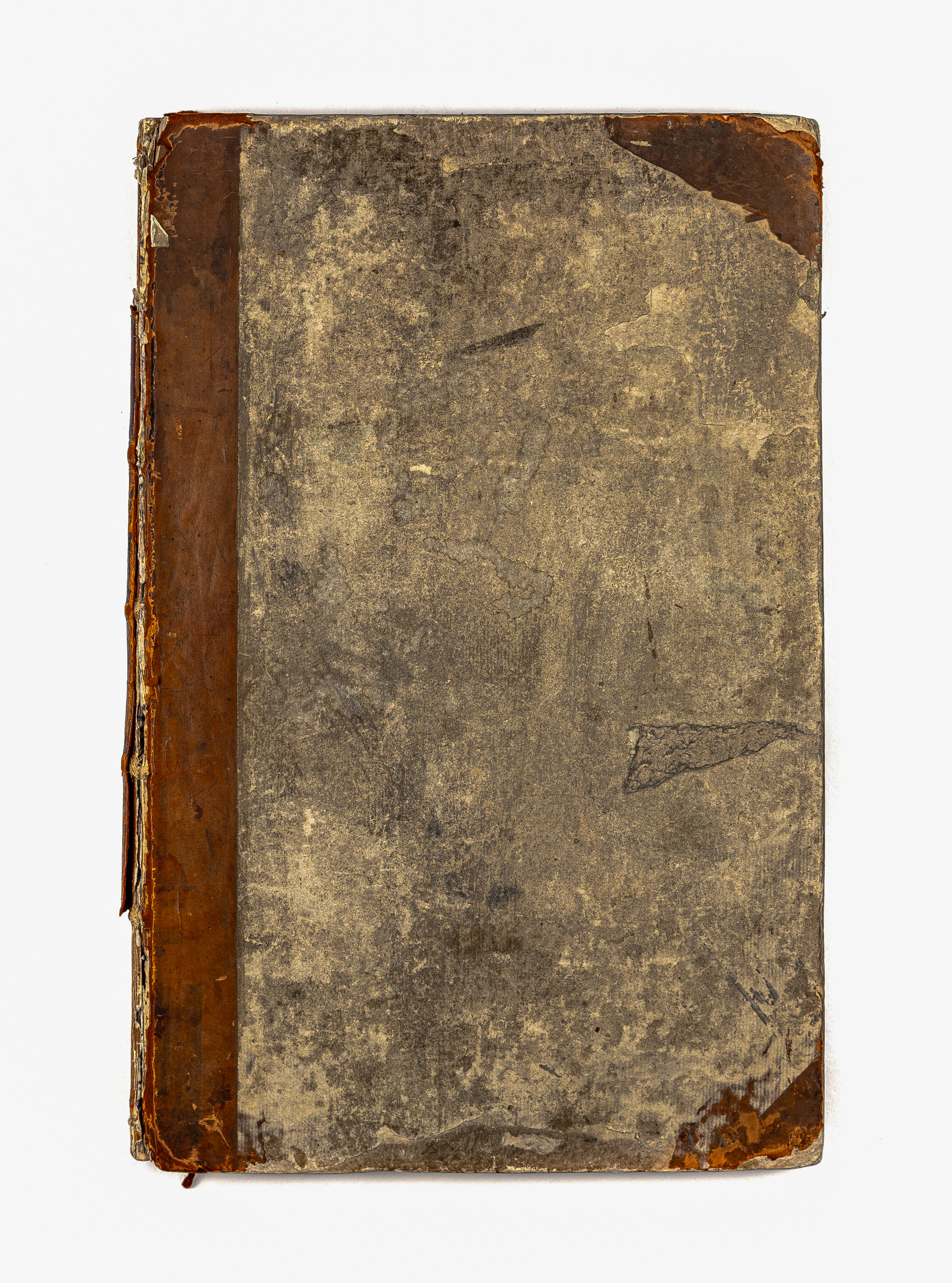 Книга в полукожаном владельческом переплете. Форзацы украшены бумагой с рисунком «под мрамор». Обрез тонированный. Бумага верже. Водяной знак (форзац).