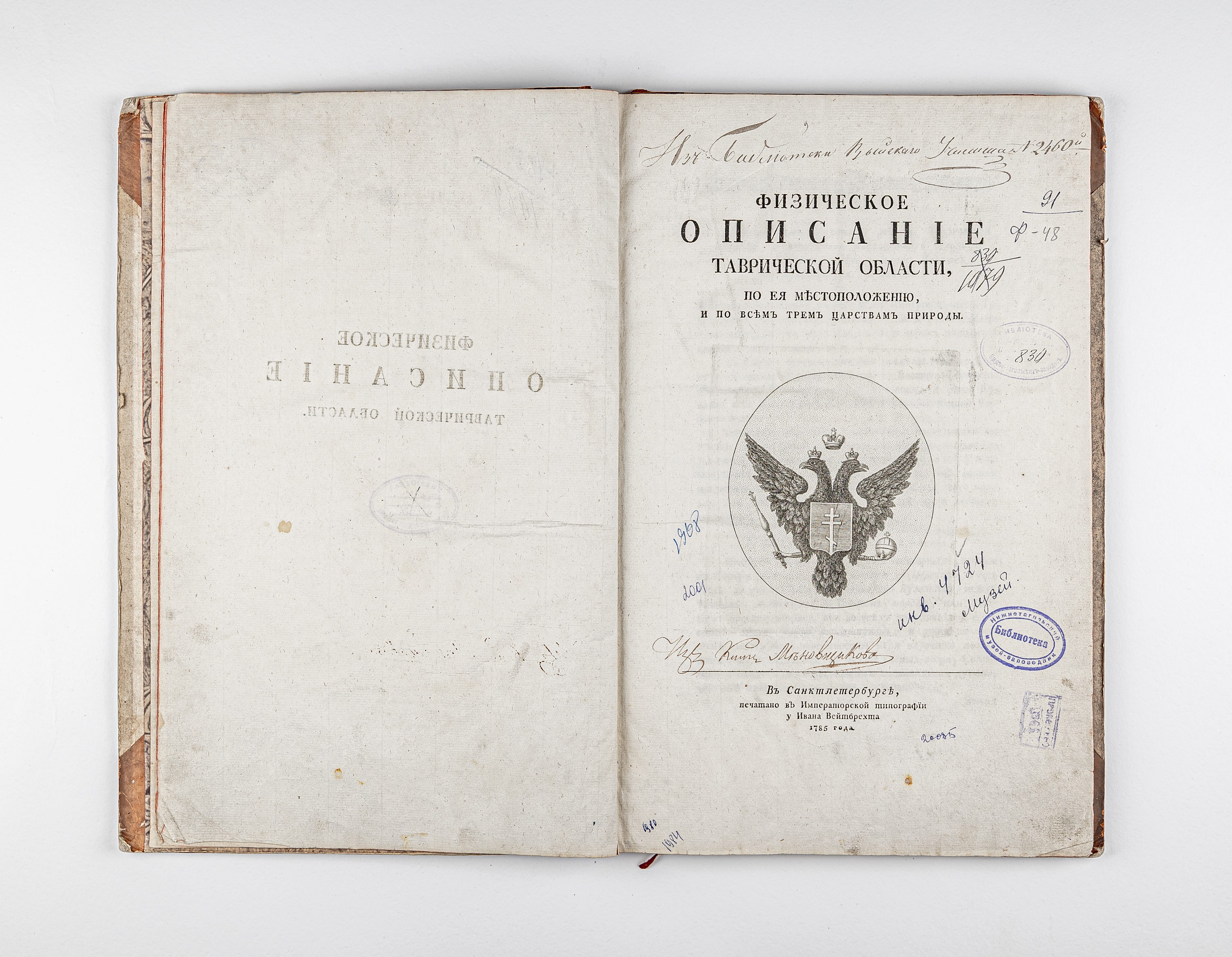 Габлиц, К. И. (1752-1821). Физическое описание Таврической области : по ея местоположению, и по всем трем царствам природы / К. И. Габлиц. – Санкт-Петербург : Имп. тип. у И. Вейтбрехта, 1785. – [2], 198, [1] с. ; 39х25 см.