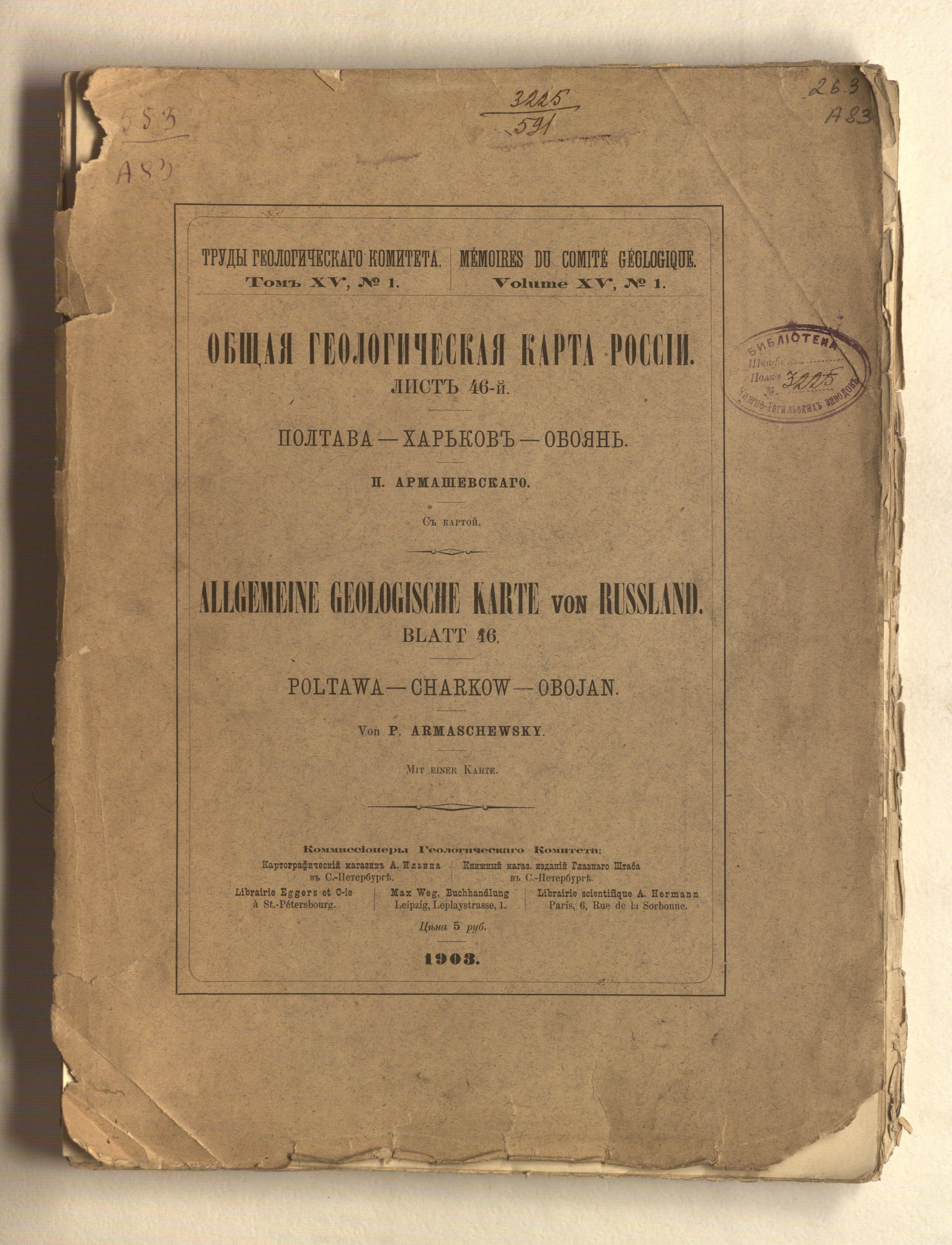 Общая геологическая карта России : лист 46. Полтава - Харьков - Обоянь / П. Я. Армашевский. — Санкт-Петербург : тип. М. Стасюлевича, 1903. — VI, 316 с. : ил. ; 33х23 см.