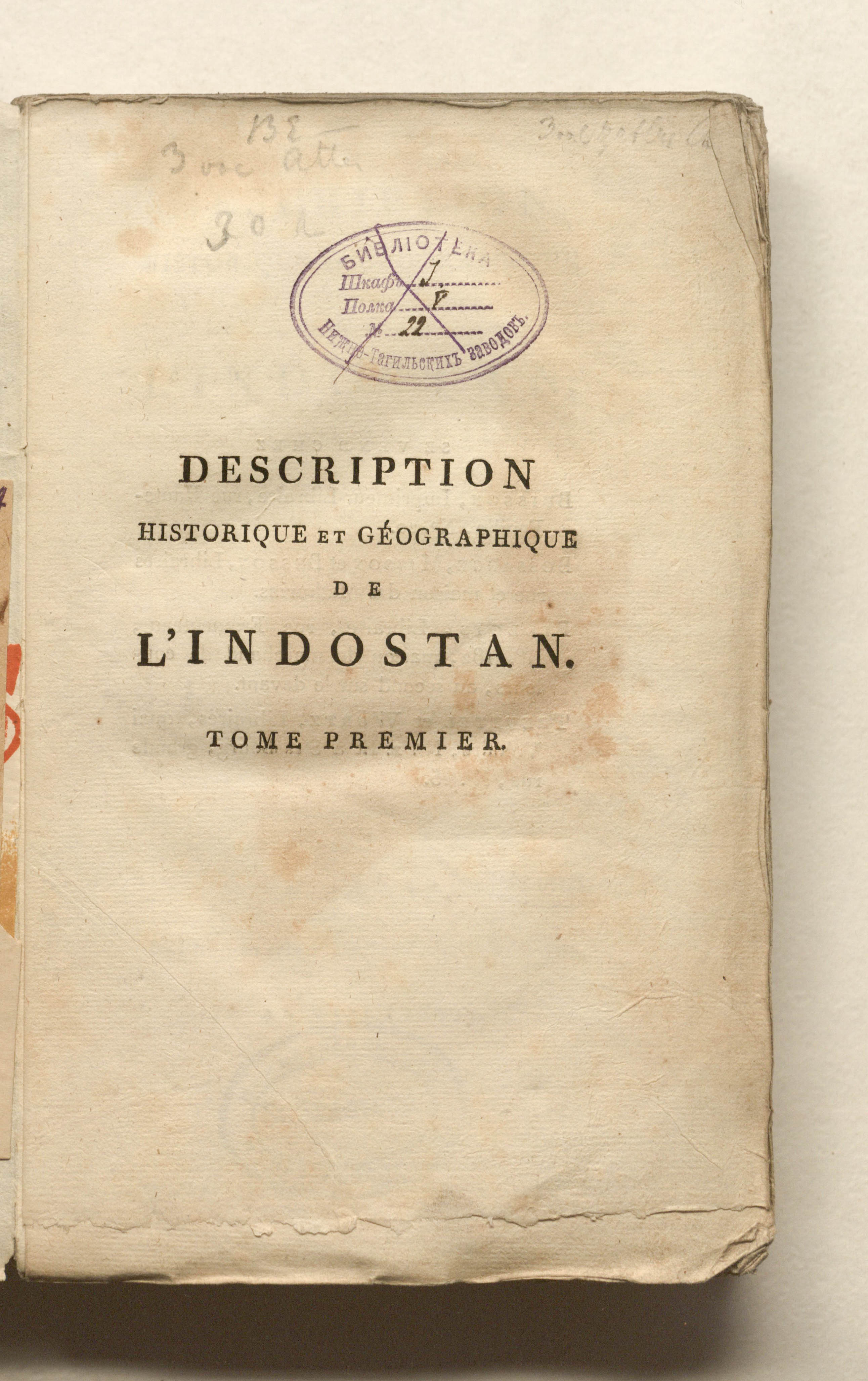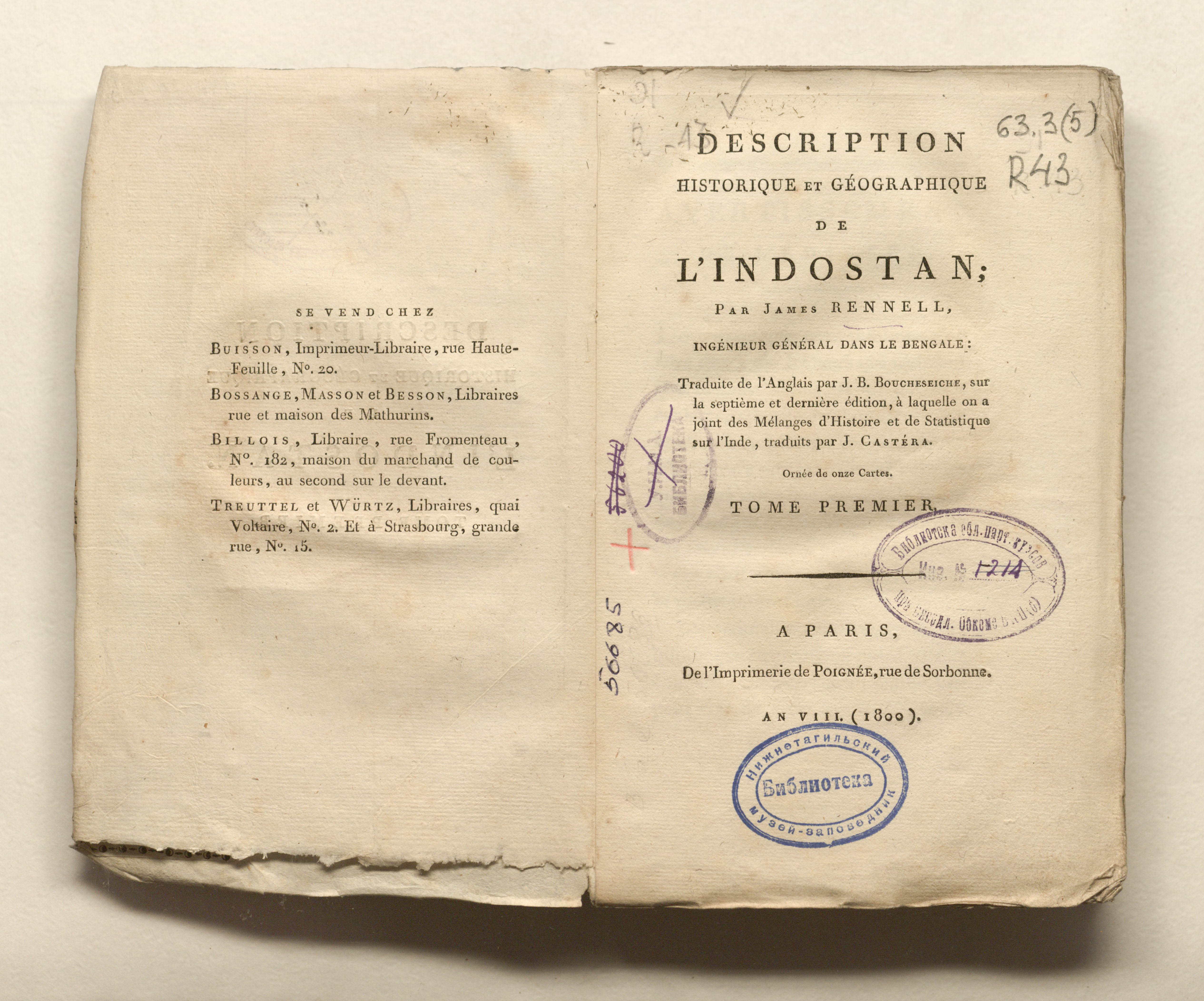 Историко-географическое описание Индостана. Сочинение Джеймса Реннелла, генерального инженера в Бенгалии. Перевод с английского Ж.-Б. Бушесейша, по седьмому и последнему изданию, к которому были добавлена «Смесь истории и статистики по Индии», в переводе Ж. Кастера... – Т. 1. – Париж : Пуанье, Год VIII (1800). - XXXVIII, 299, [2] с.; 13х21 см.
