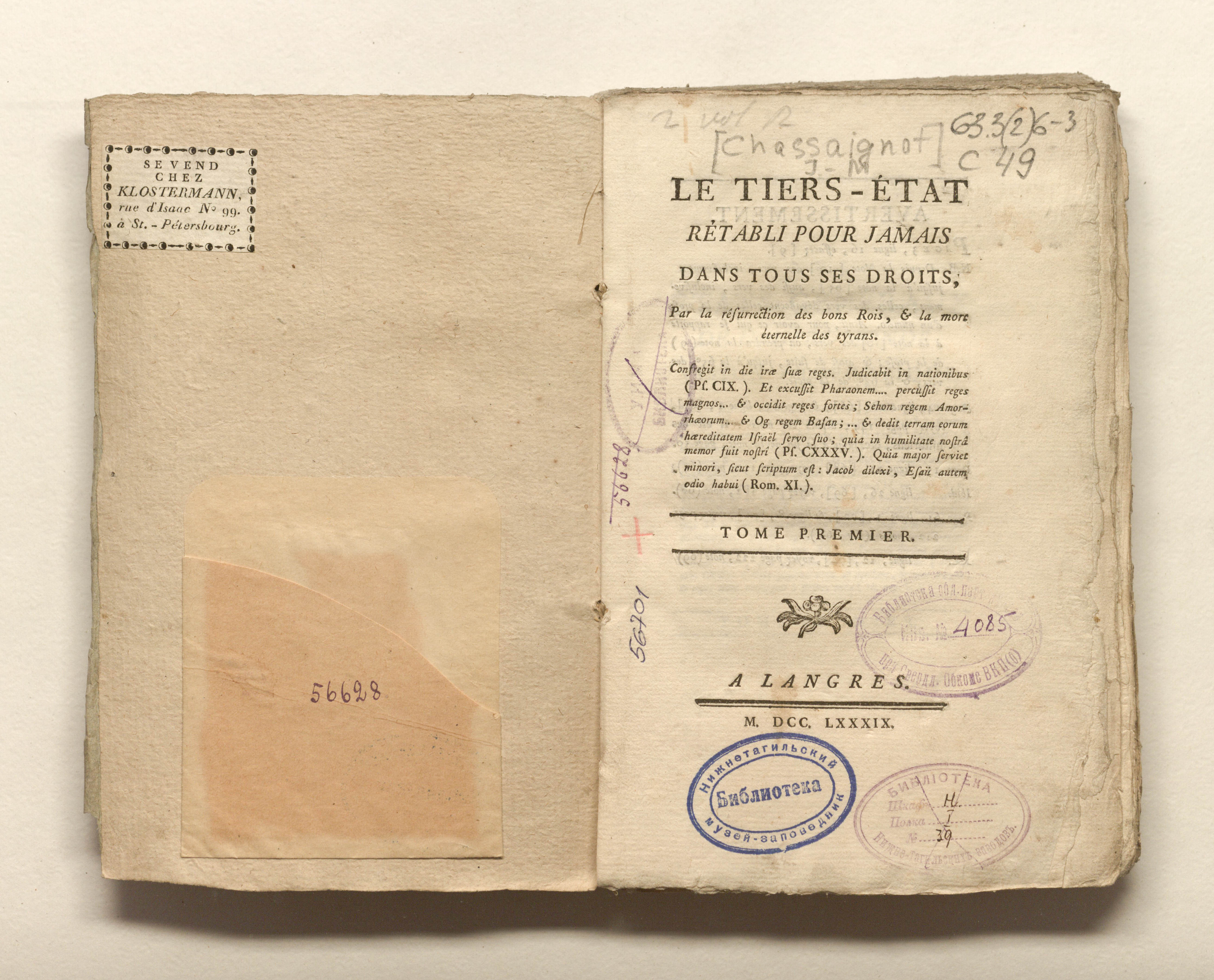 [Chassaignon, Jean-Marie] (1735-1795). Le Tiers-Etat retabli pour jamais dans tous droits, par la resurrection des bons rois et la mort eternelle des tyran. - Tome premier. - Langres : [s. n.], 1789. - [8], 256 p.; 13,5x21 cm.