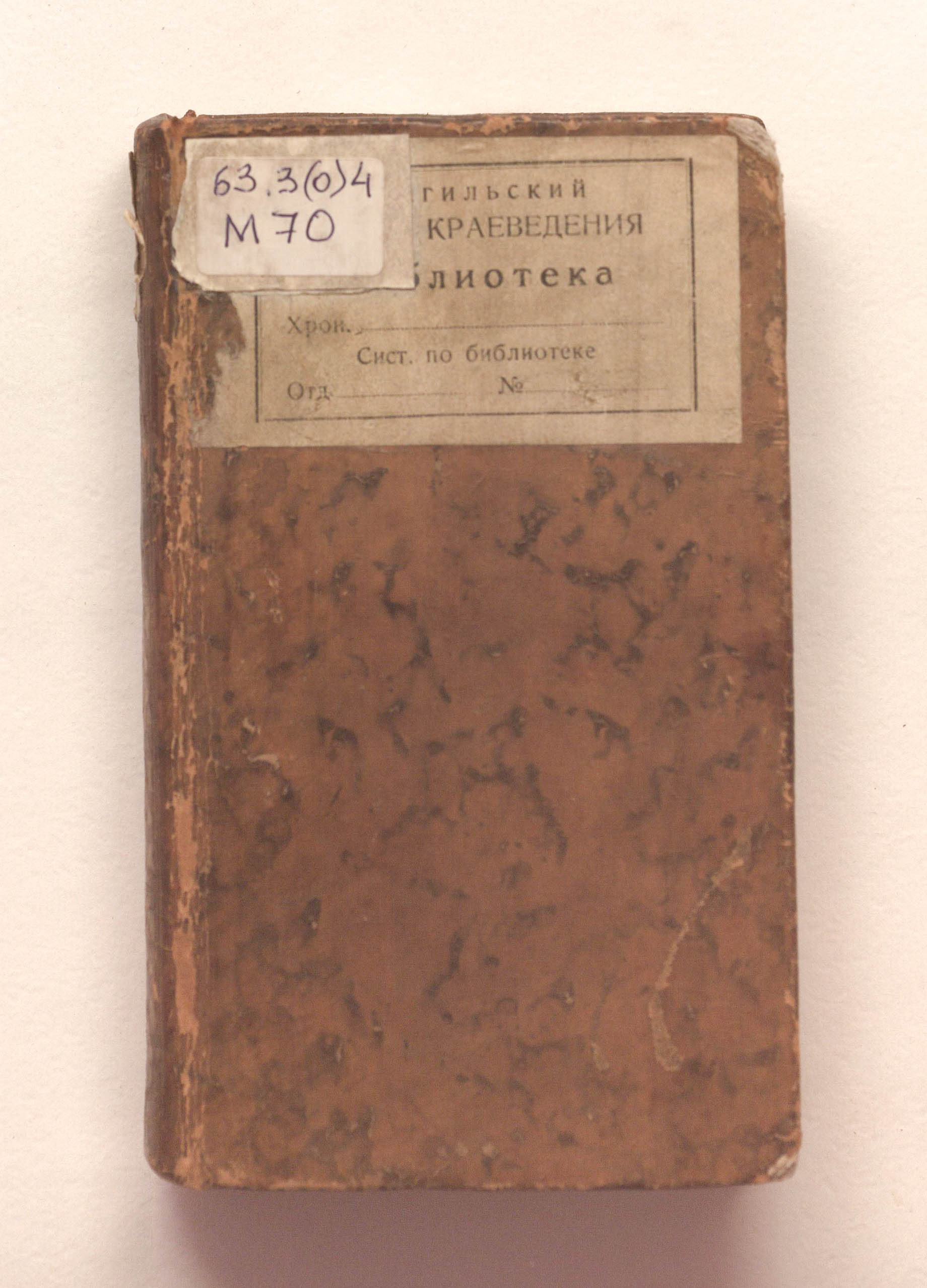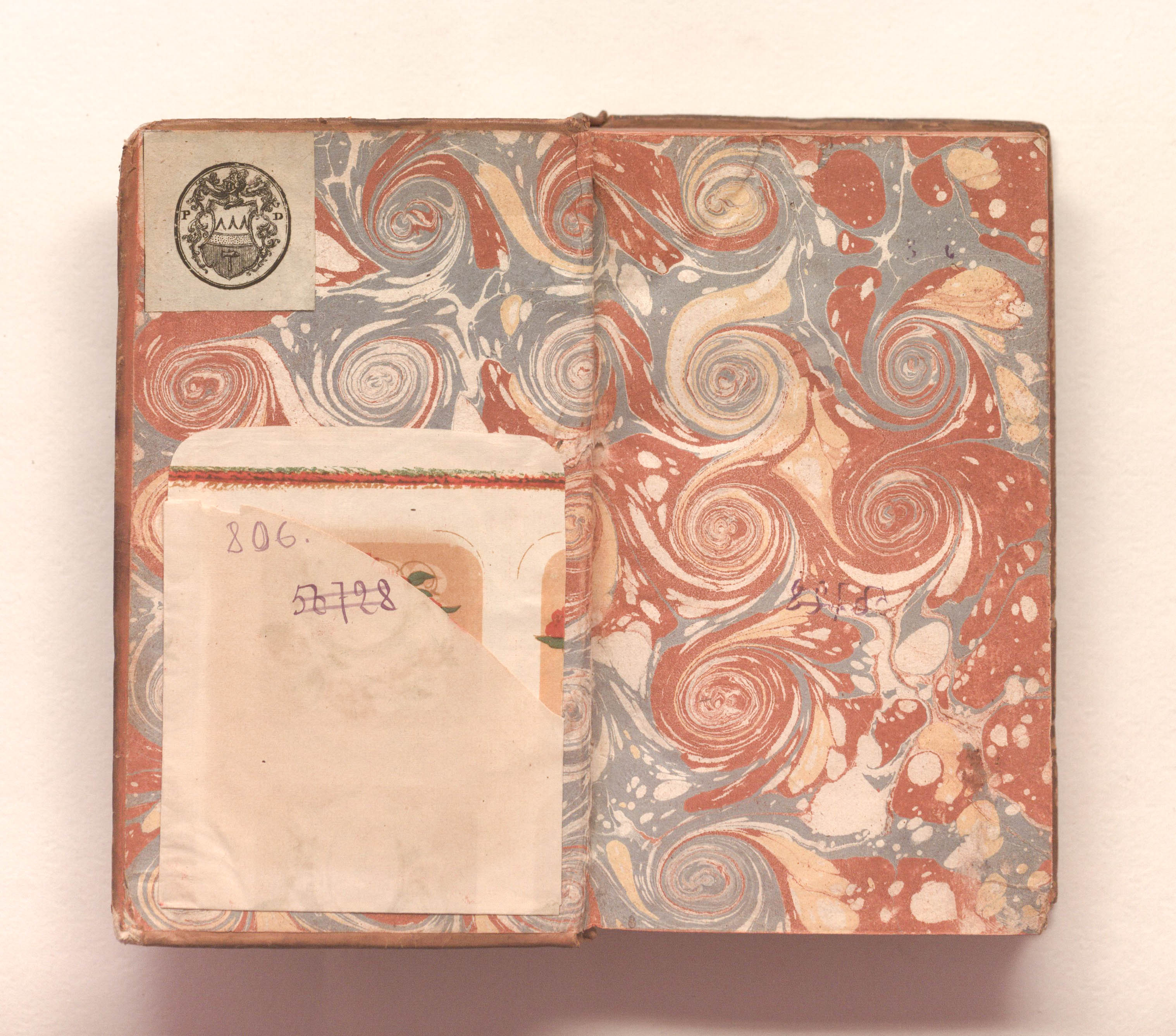 Книга в цельнокожаном владельческом переплете. На обороте передней сторонки наклеен бумажный гербовый экслибрис с гербом рода Демидовых и инициалами "PD"[Павел Демидов] (Демидов Павел Григорьевич, 1738-1821)