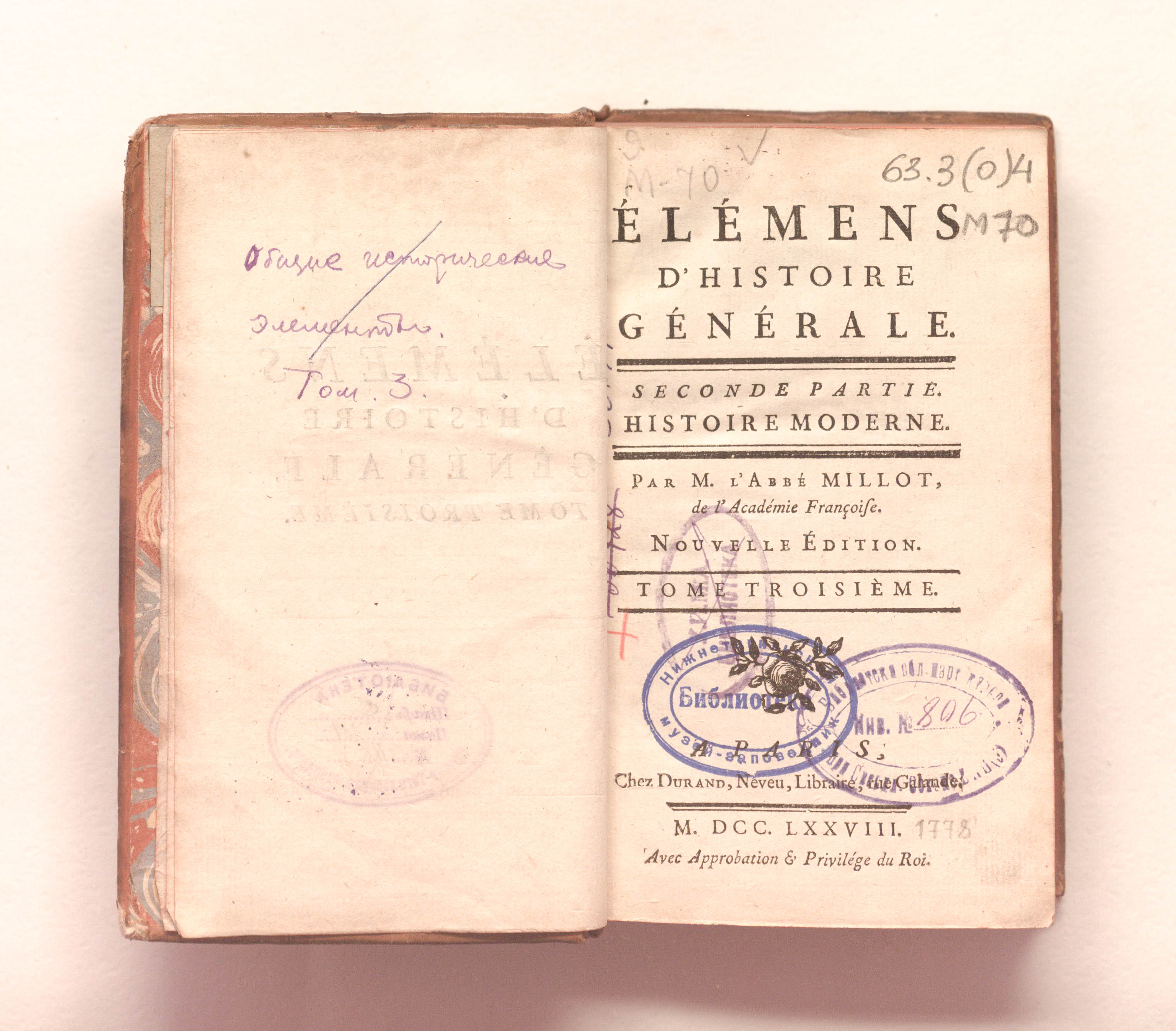 Millot, Claude-Franсois-Xavier (1726-1775). Elemens d'histoire generale. Tome troisieme. Seconde partie. Histoire moderne. Nouvelle edition. - Paris : Durand, 1778 - 468 p.; 10х17 cm.