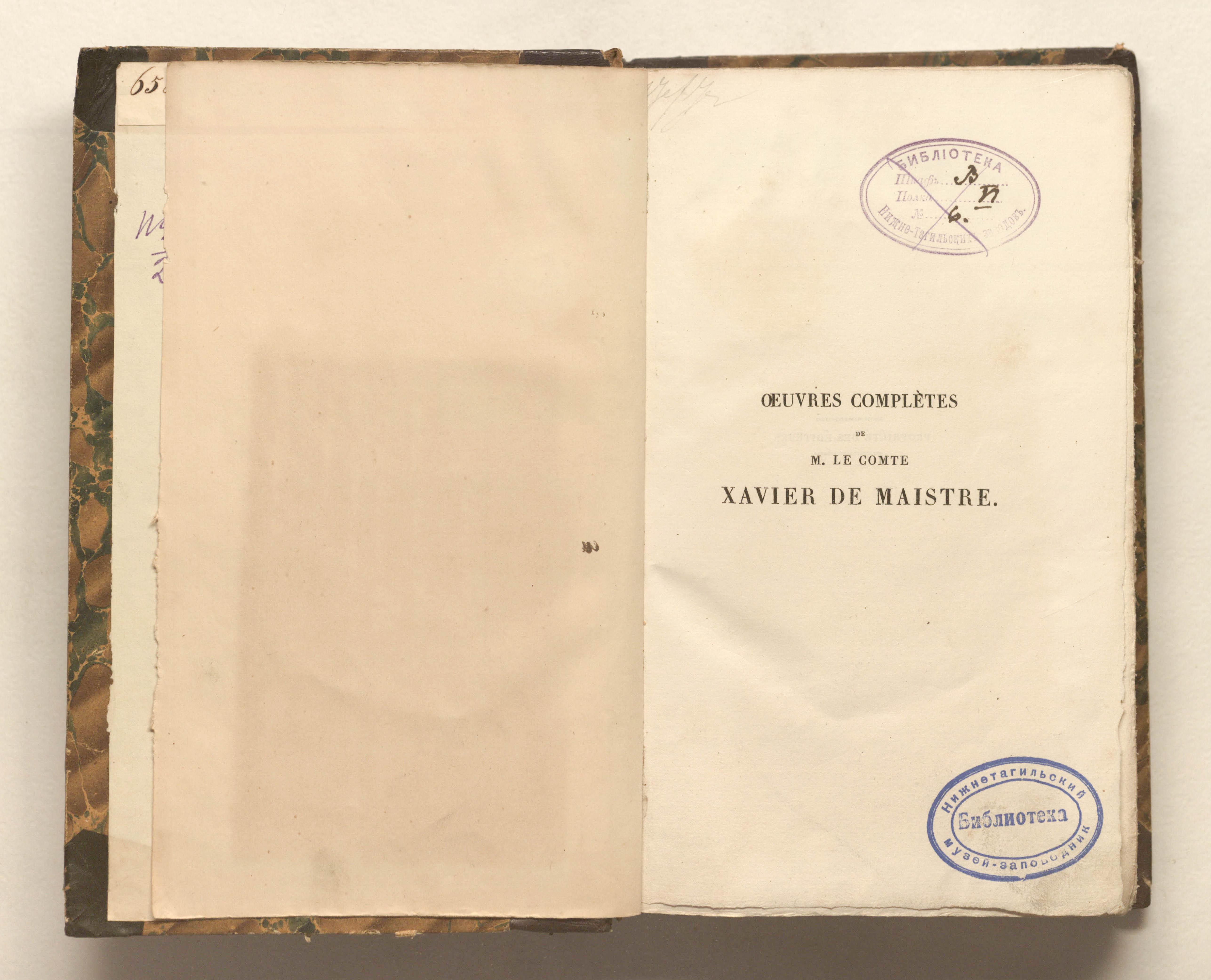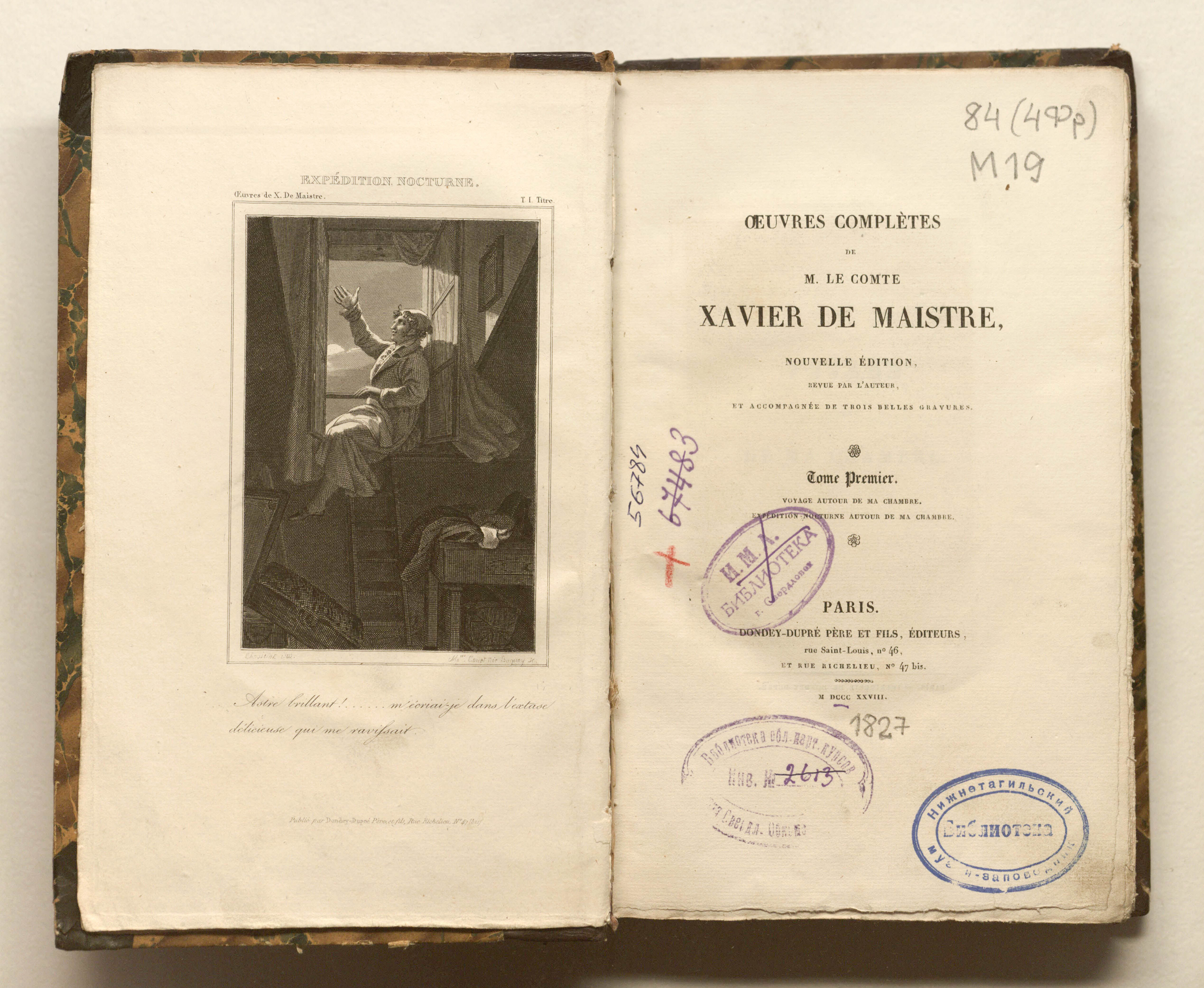 Полное собрание сочинений г-на графа Ксавье де Местра, новое издание. – Париж : Дондеэ-Дюпре, отец и сын, 1827. – 2 т. – Т. 1. – 399 с. : грав. фронт.; 14,5ч22,5 см.