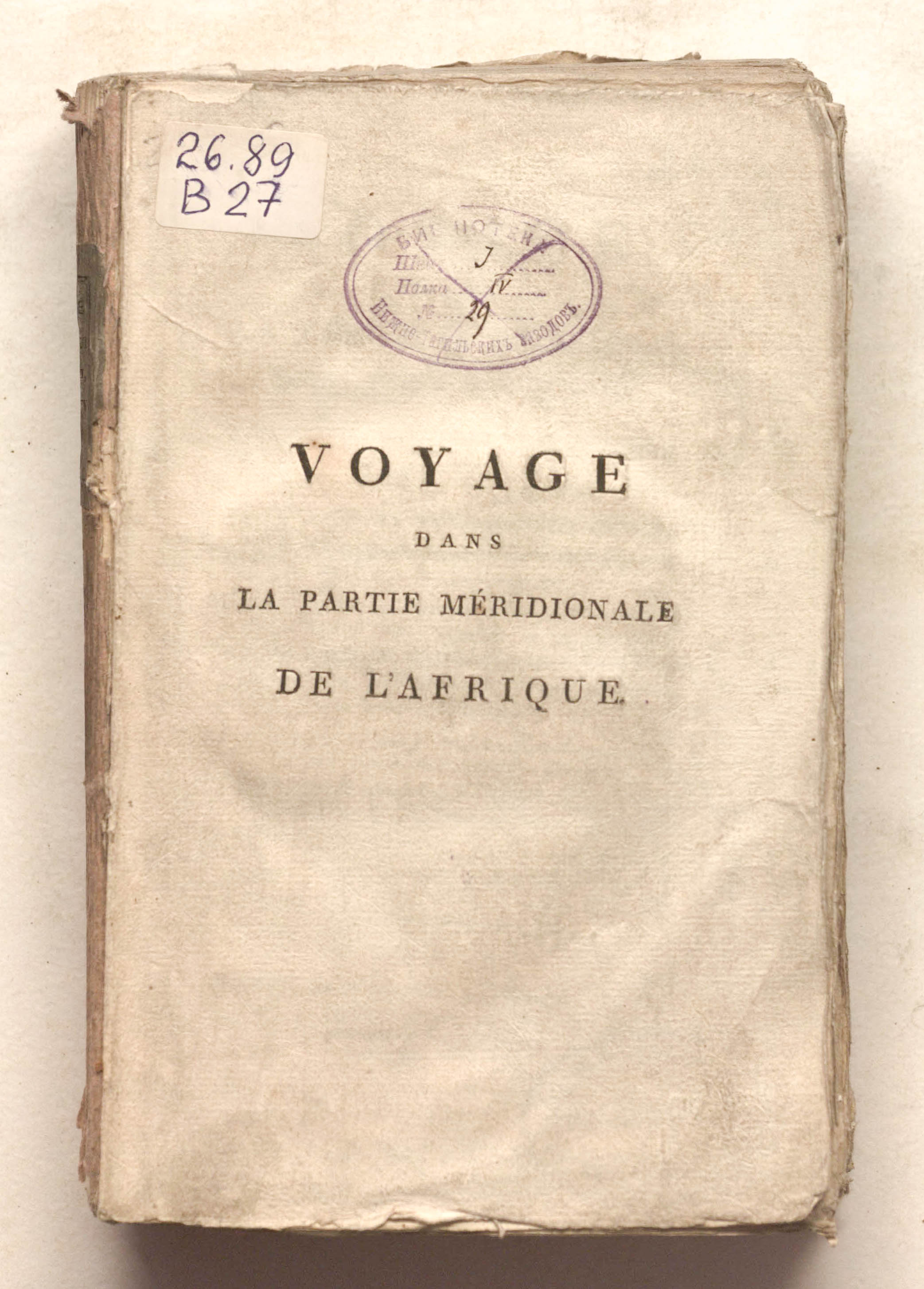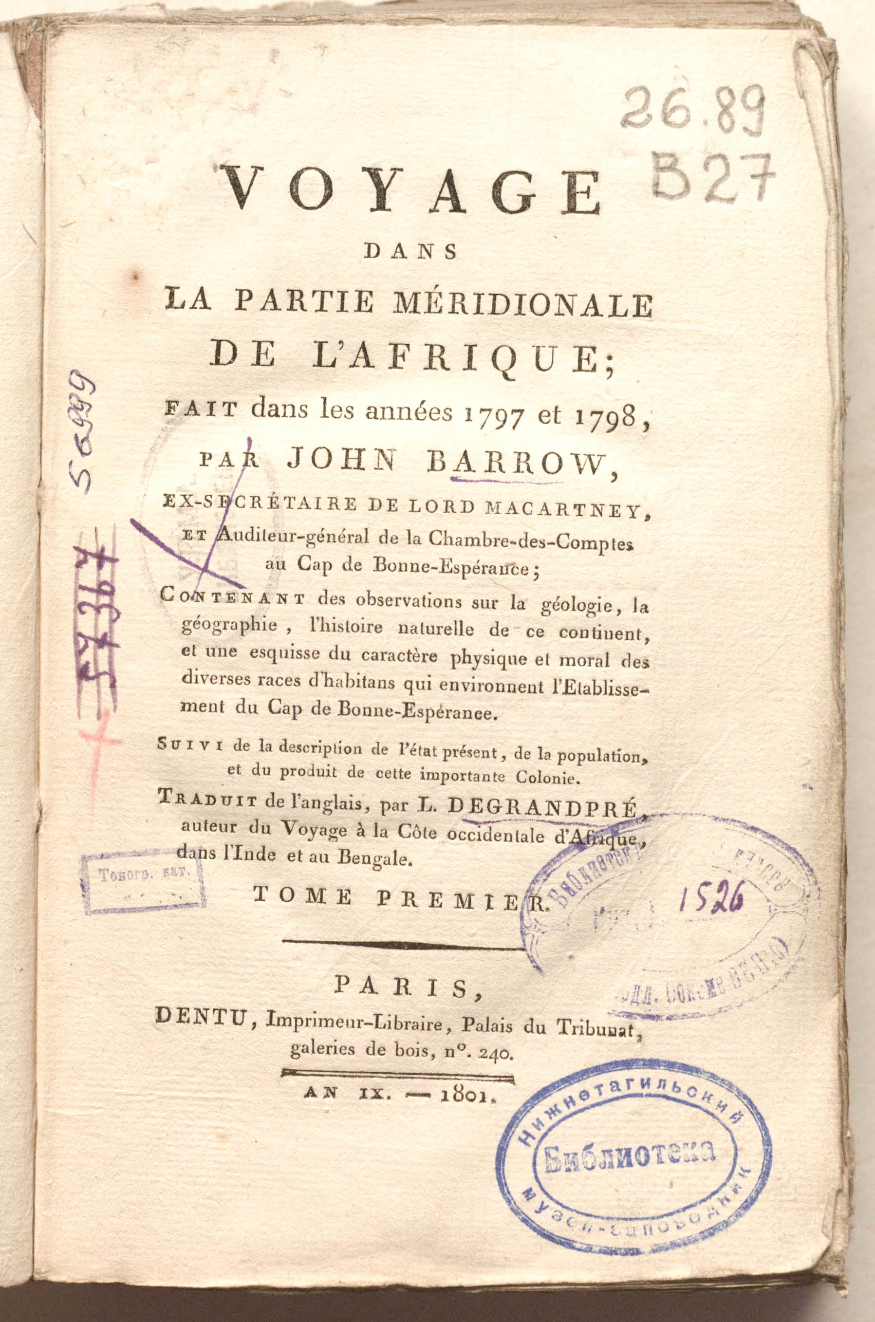 Voyage dans la partie meridionale de l'Afrique, fait dans les annees 1797 & 1798, par John Barrow, ex-secretaire de Lord Macartney, et Auditeur-general de la Chambre-des-Comptes au Cap de Bonne-Esperance. Contenant des observations sur la geologie, la geographie, l'histoire naturelle de ce contienent, et une esquisse du caractère physique et moral des diverses races d'habitans qui environnent l'Etablissement du Cap de Bonne-Esperance. Suivi de la description de l'etat présent, de la population et du produit de cette importante colonie. Traduit de l'anglais, par L. Degrandpré ... 2 t. – T.1. - Paris : Dentu, An IX (1801). - XVI, 403, [1] p. ; 14x21 cm.